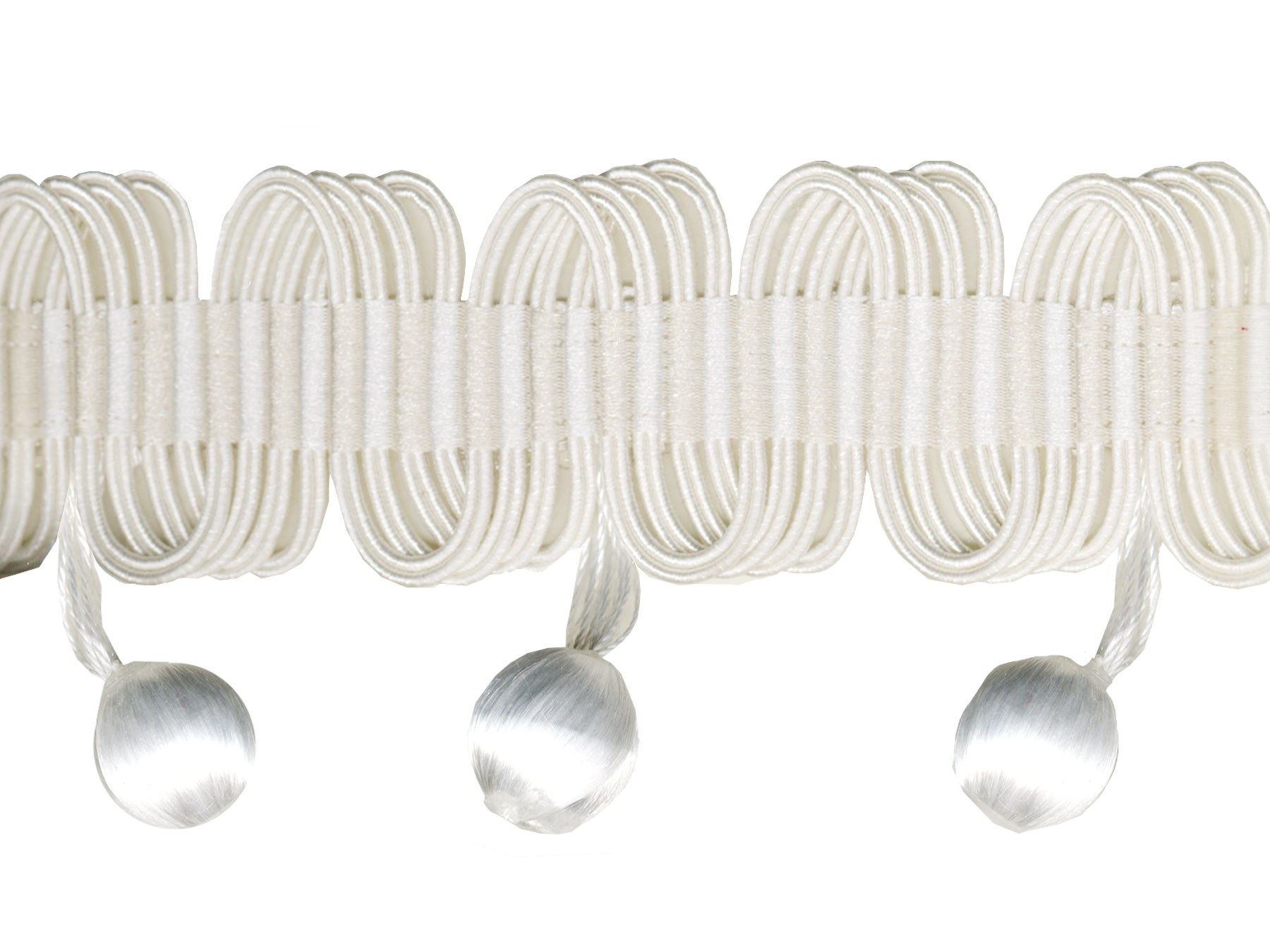 Бахрома с шариками на средней тесьме из окрашенных нитей; ширина тесьмы - 30мм, размер шарика - 35мм; упаковка по 25м на картон