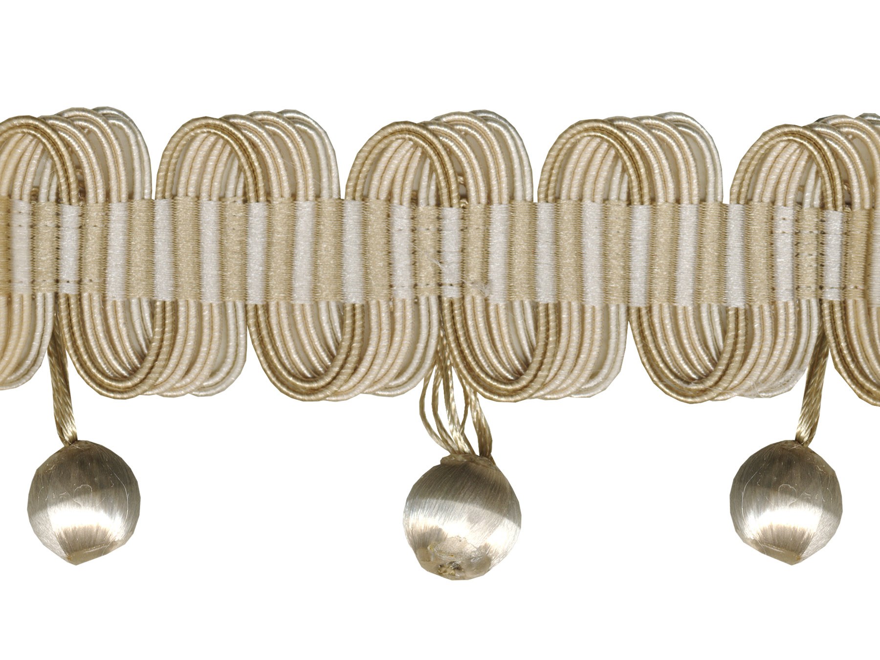 Бахрома с шариками на средней тесьме из окрашенных нитей; ширина тесьмы - 30мм, размер шарика - 35мм; упаковка по 25м на картон