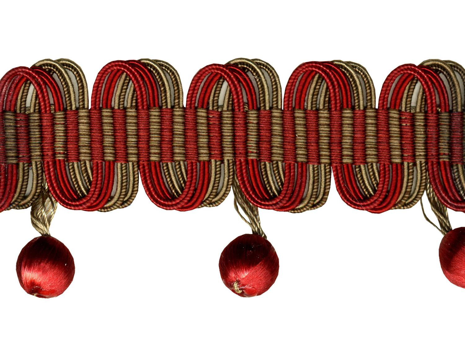Бахрома с шариками на средней тесьме из окрашенных нитей; ширина тесьмы - 30мм, размер шарика - 35мм; упаковка по 25м на картон