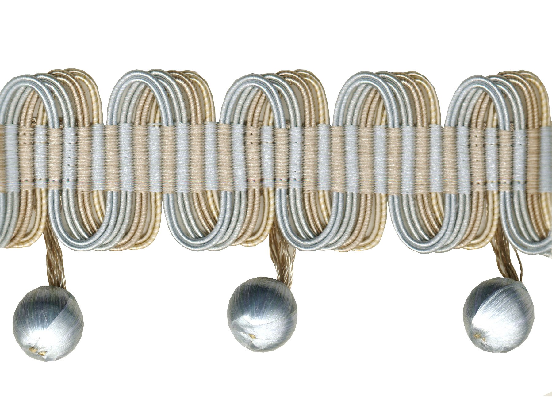 Бахрома с шариками на средней тесьме из окрашенных нитей; ширина тесьмы - 30мм, размер шарика - 35мм; упаковка по 25м на картон