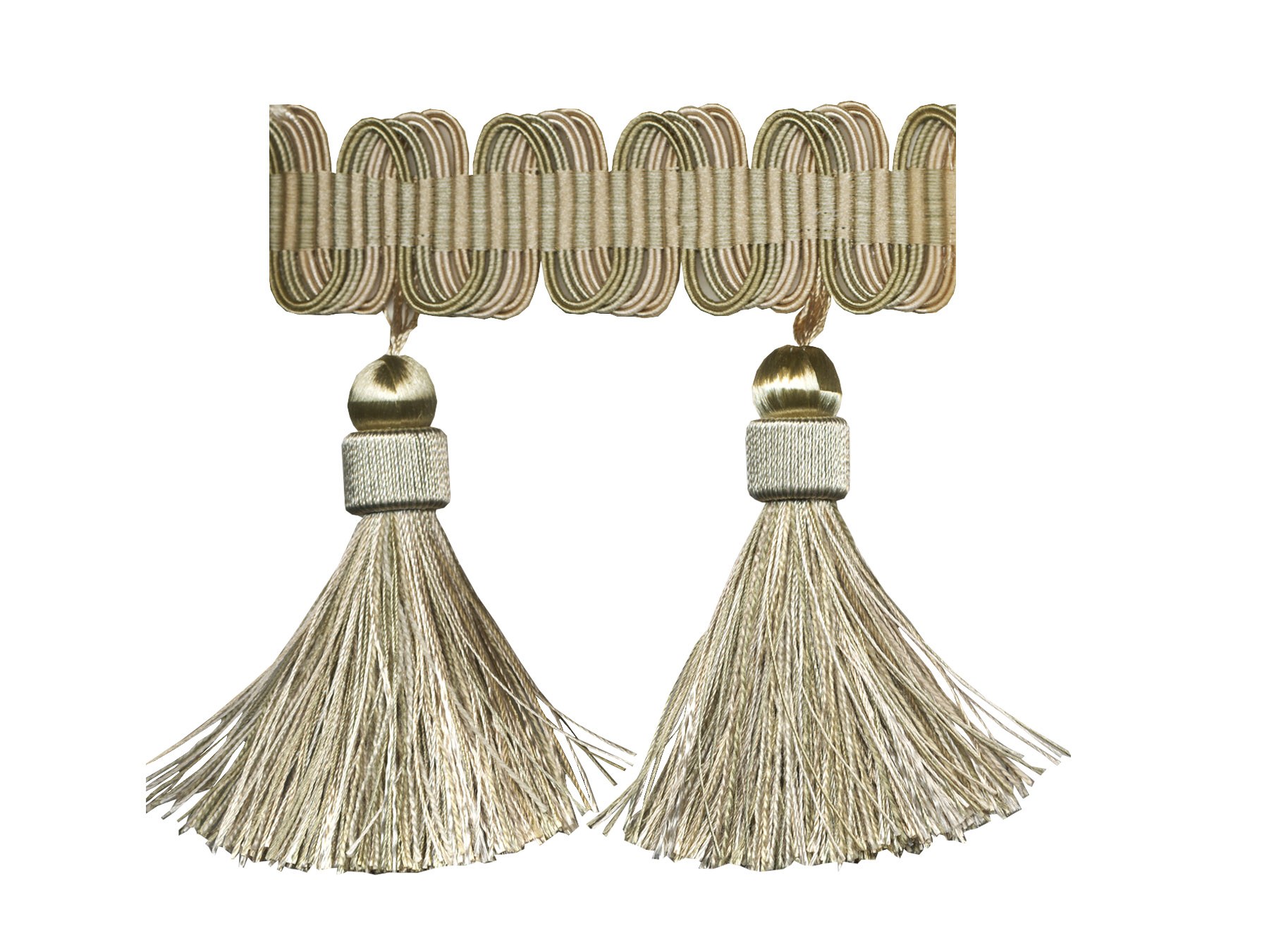Бахрома с шариками и кисточками на средней тесьме из окрашенных нитей; ширина тесьмы - 30мм, длина шарика с кисточкой - 95мм; упаковка по 25м на картон