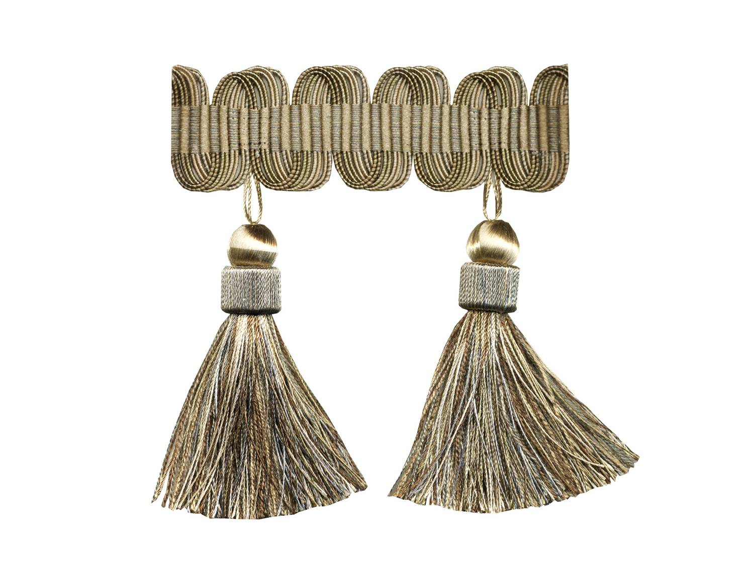 Бахрома с шариками и кисточками на средней тесьме из окрашенных нитей; ширина тесьмы - 30мм, длина шарика с кисточкой - 95мм; упаковка по 25м на картон