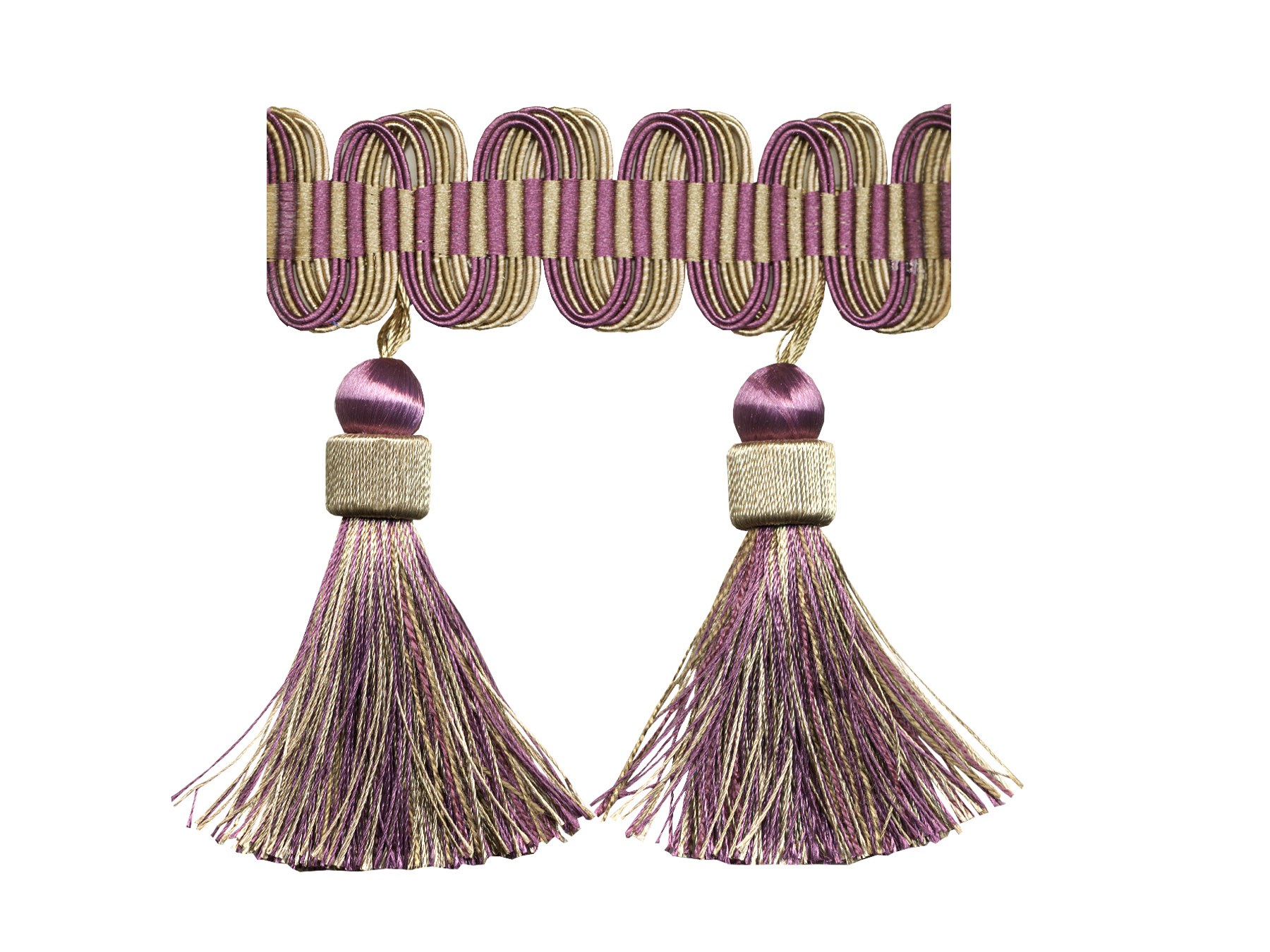 Бахрома с шариками и кисточками на средней тесьме из окрашенных нитей; ширина тесьмы - 30мм, длина шарика с кисточкой - 95мм; упаковка по 25м на картон