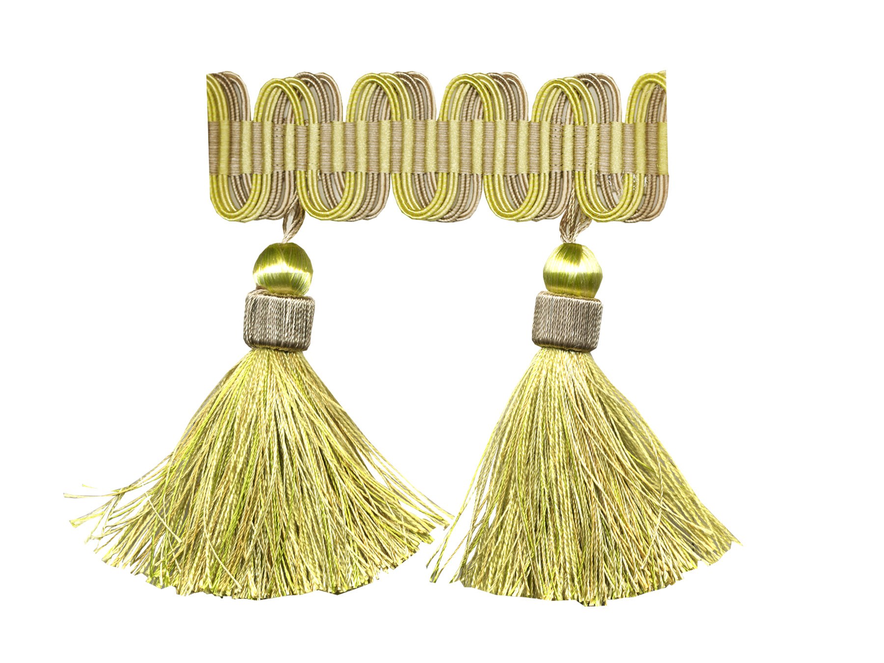 Бахрома с шариками и кисточками на средней тесьме из окрашенных нитей; ширина тесьмы - 30мм, длина шарика с кисточкой - 95мм; упаковка по 25м на картон