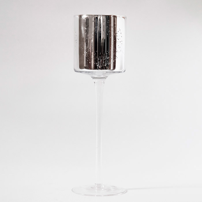 Подсвечник декоративный в виде стакана серебряного цвета.