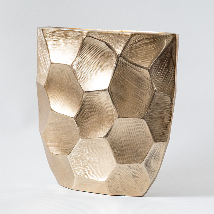 Ваза декоративная овальная с гранями золотого цвета.