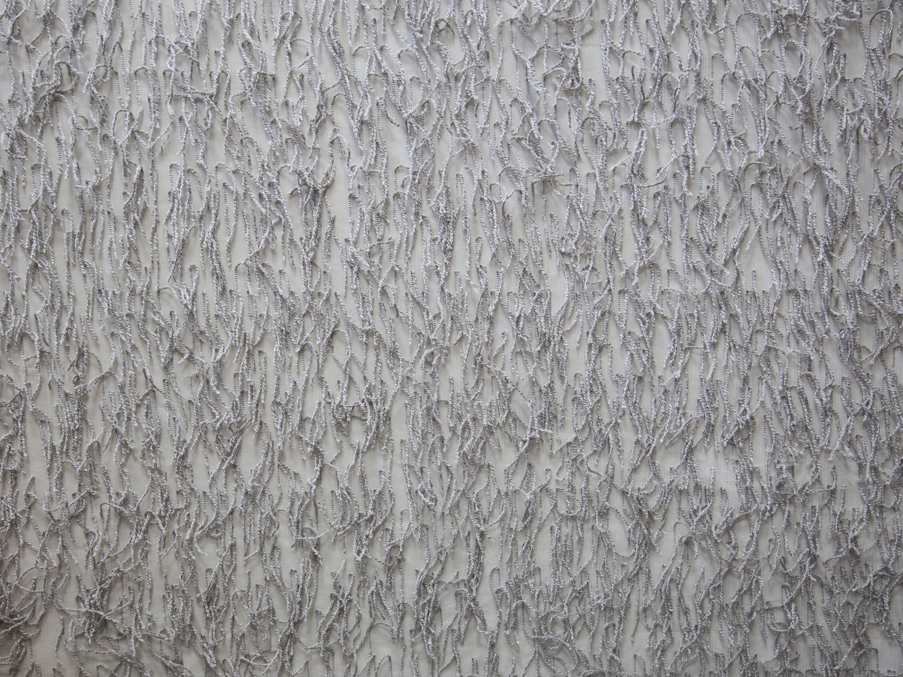 Очень необычная ткань воссоздает образ покачивающейся под порывами ветры травы, которая прорастает сквозь однотонную основу. За счет скрученных вместе разноцветных волокон получаются различные сложные оттенки. Длинные ниточки в формате аппликации придают ткани фантазийность и движение, а имитация спутанных стеблей — игривость и жизнерадостность.
