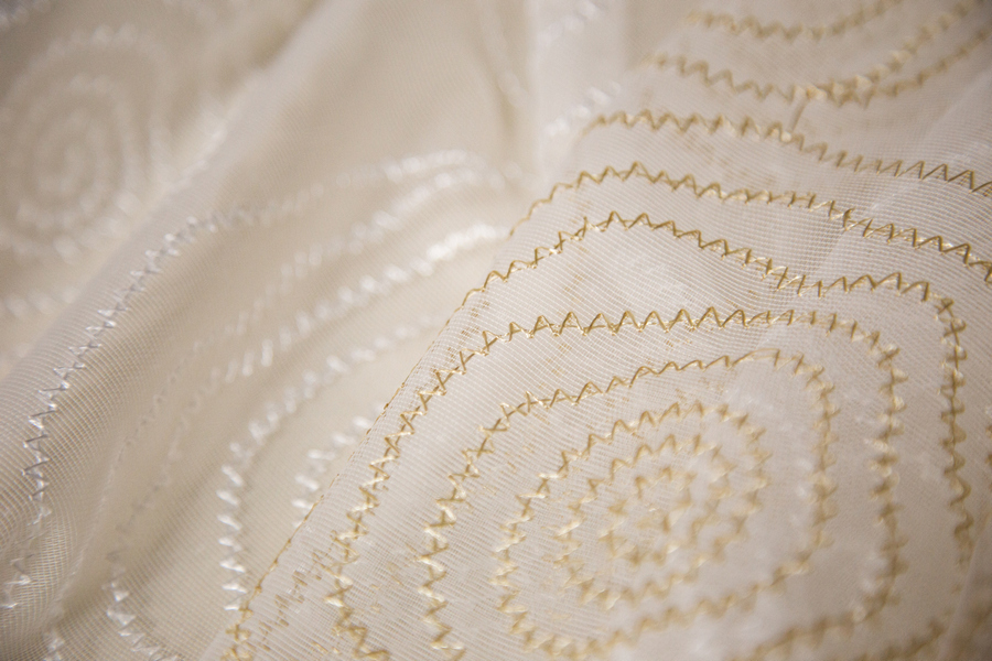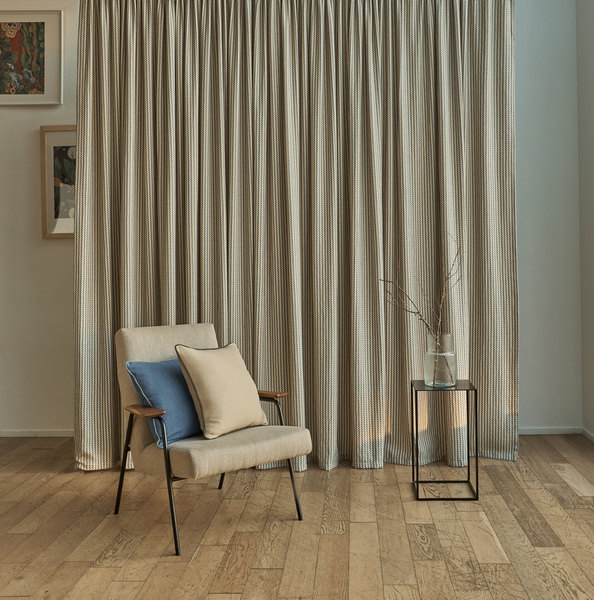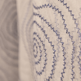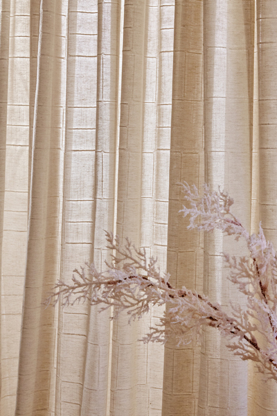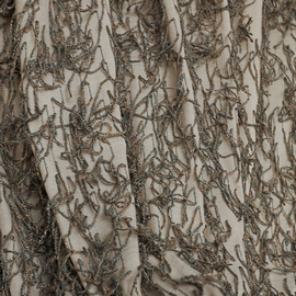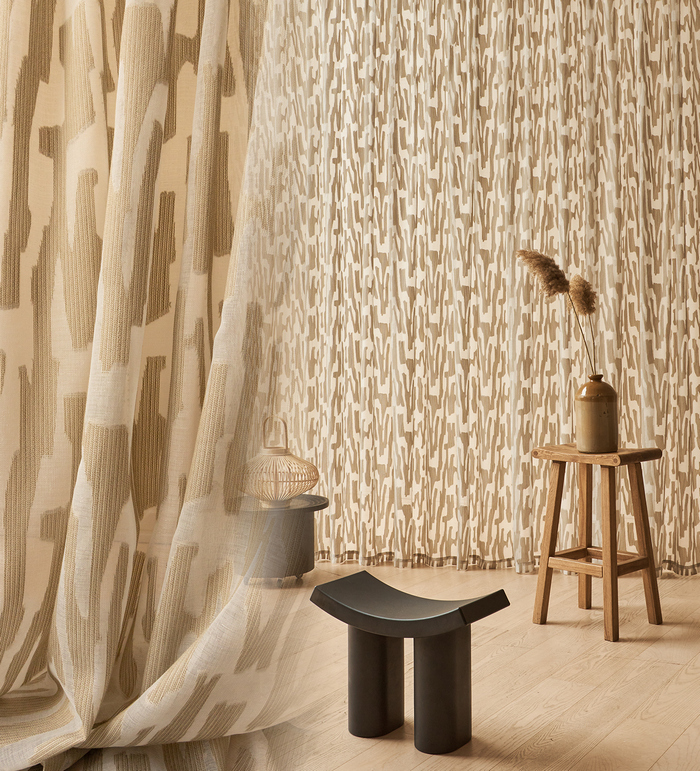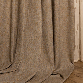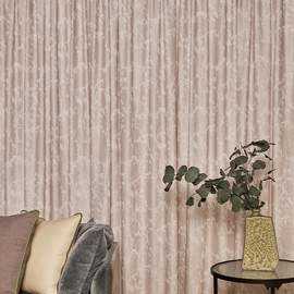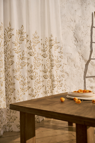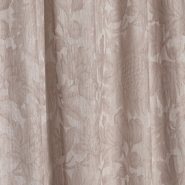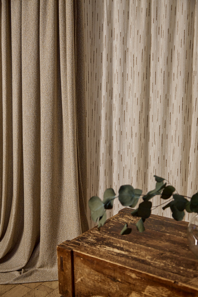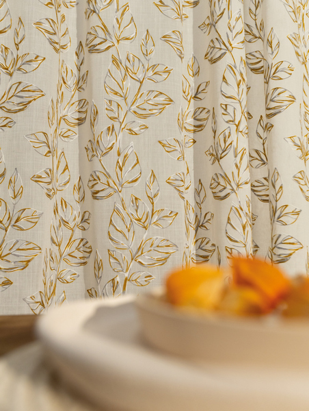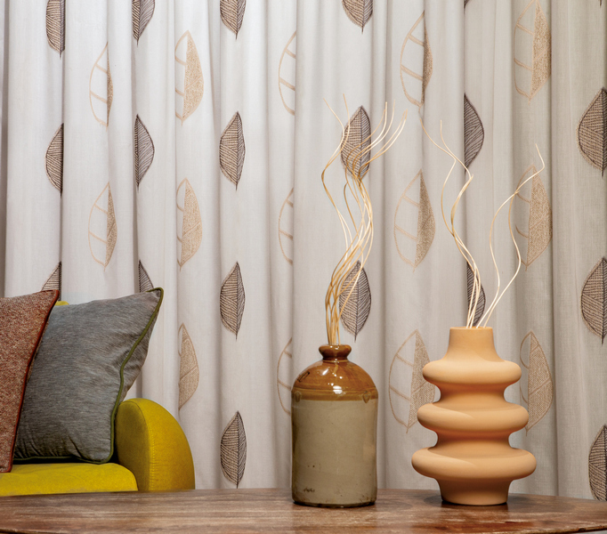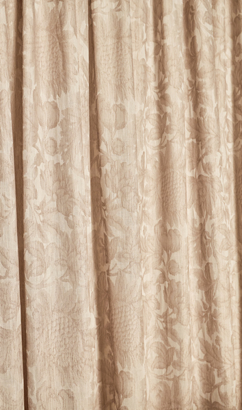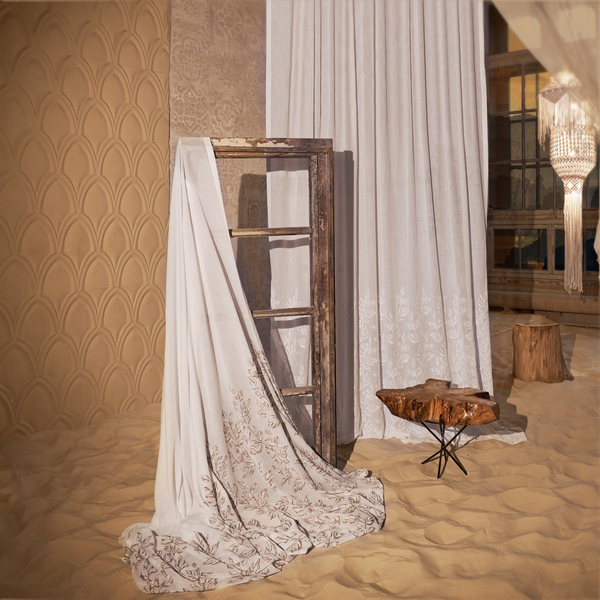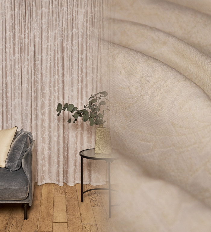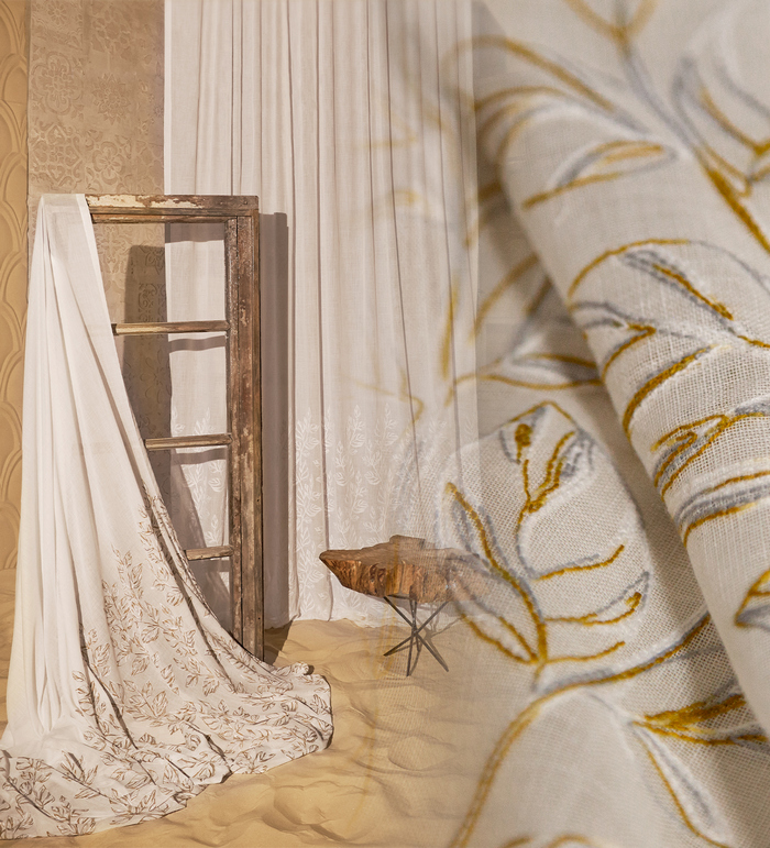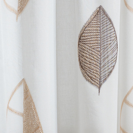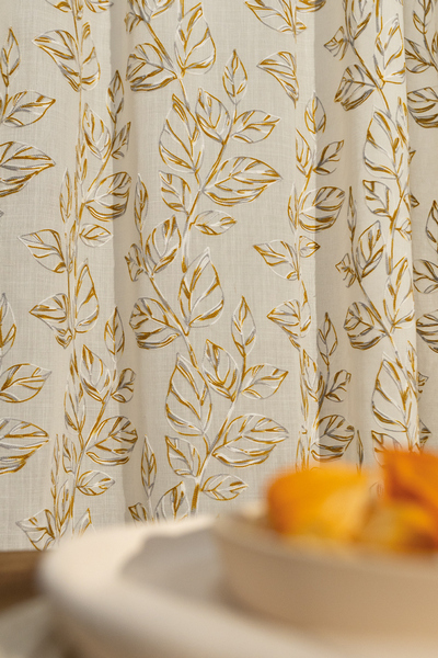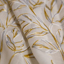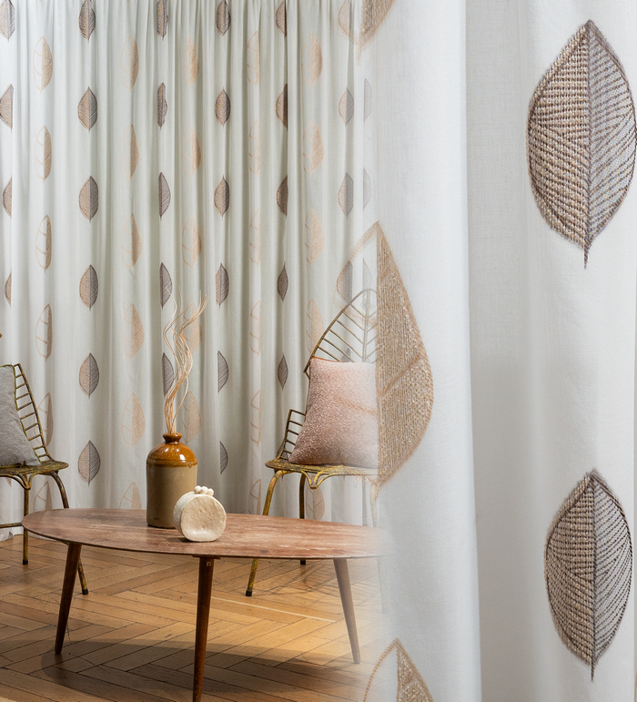Обладая очень приятной на ощупь текстурой и способностью образовывать красивые складки, ткань идеальна для портьер. Купонный дизайн в виде выполненной мини-петельками вышивки с изображением тонких детализированных листьев и упор на натуральные оттенки добавляют ей неброскую изысканность.