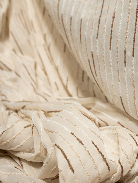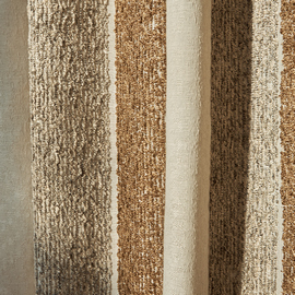 Три широкие текстурные полосы выполнены в натуральных оттенках, которые придают ткани глубину. В них на первый план выходит кудрявая, объемная нить, отвечающая за привлекательную неровность. Этот жаккард выделяет комбинация узора и фактуры.
