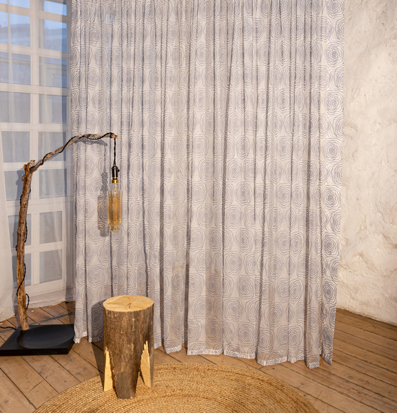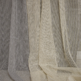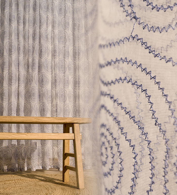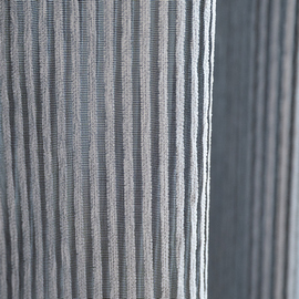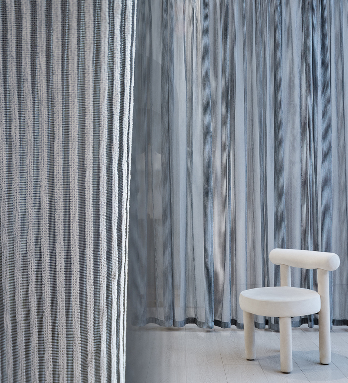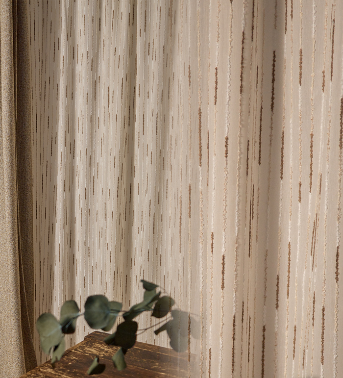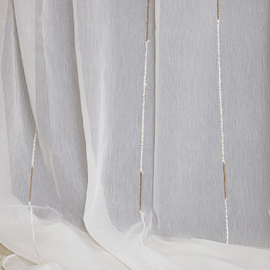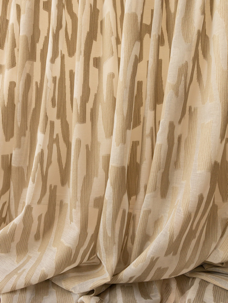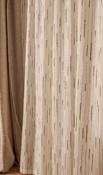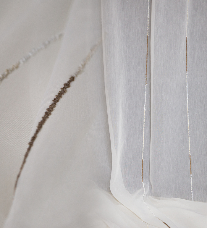 Дизайн базируется на чередующихся горизонтальных полосках из прозрачного тюля и плотной шенильной ткани. Следы, остающиеся на пляже — главная идея. Полосы придают графичности, образуют преломление света и интересные игры теней, а ширина 320 см является еще одним важным плюсом в списке преимуществ.