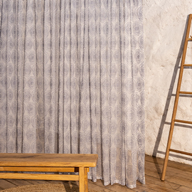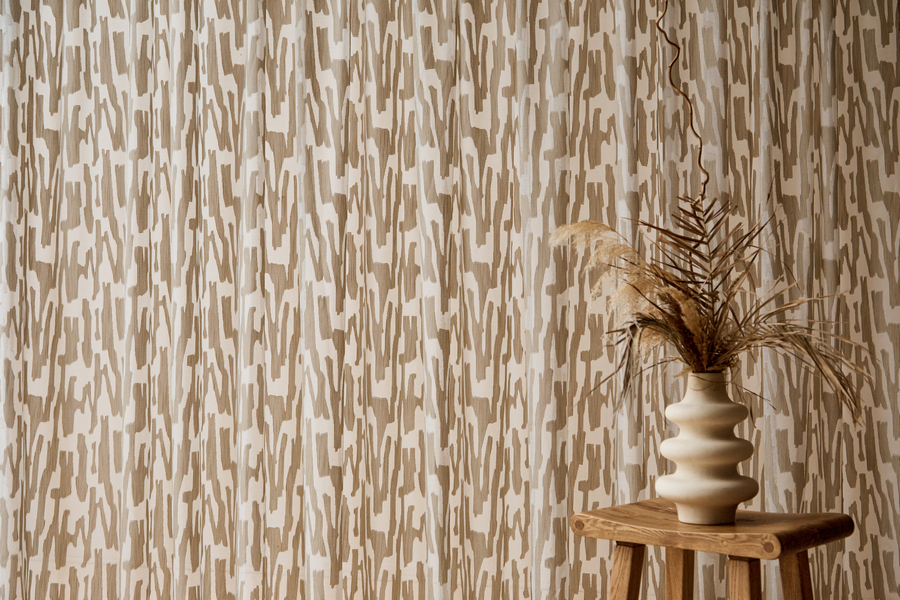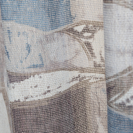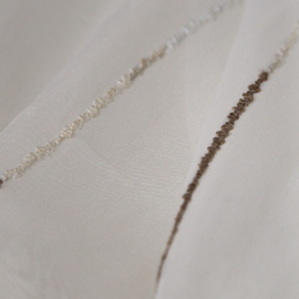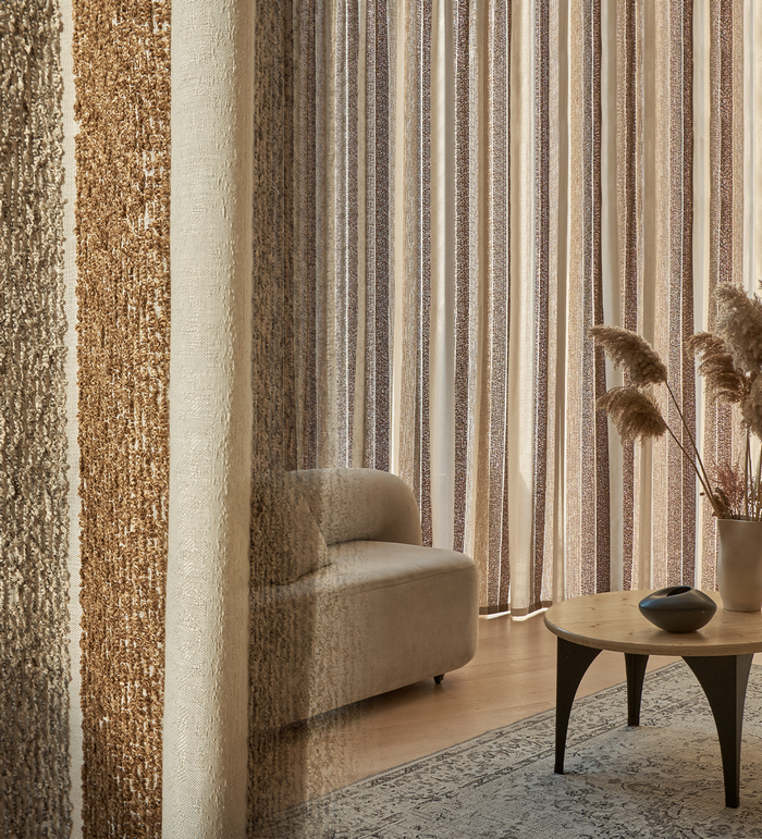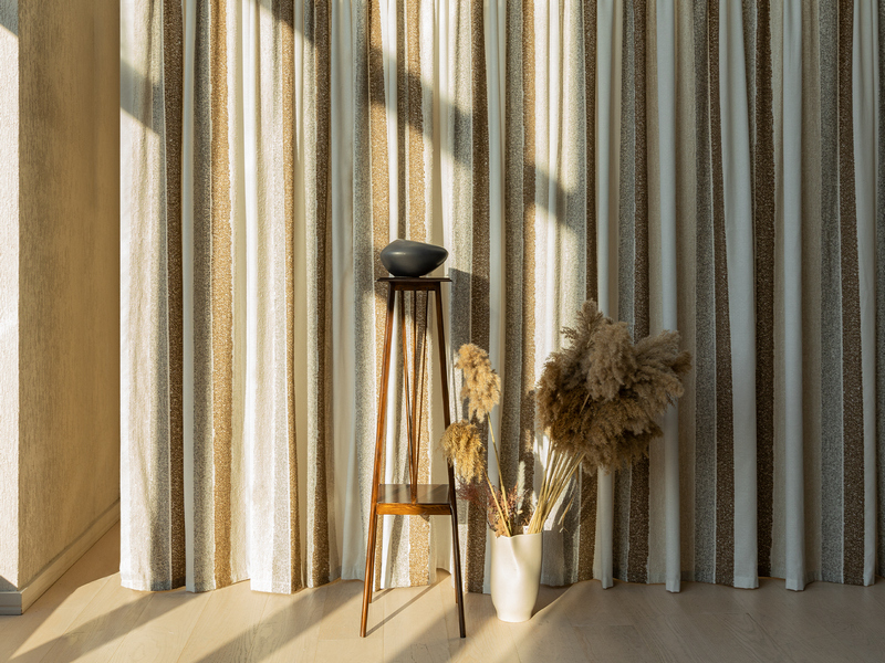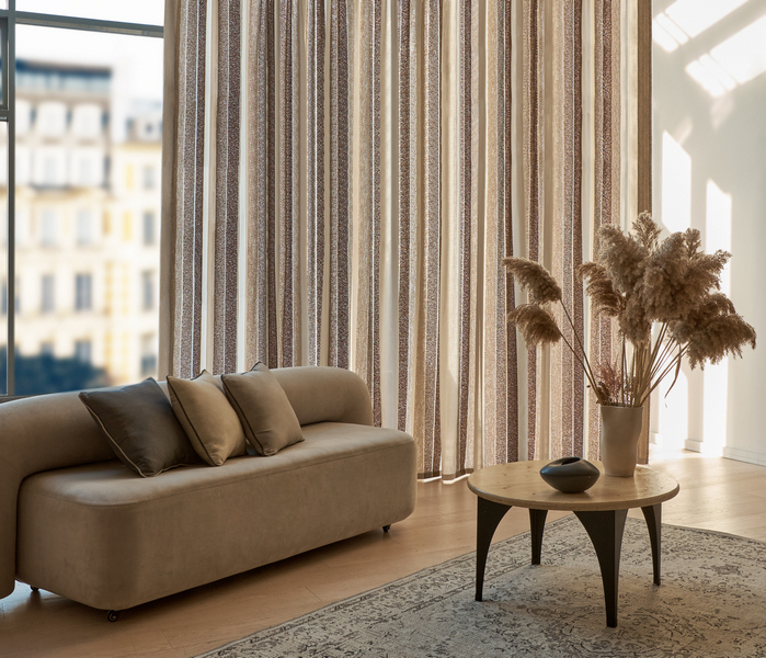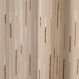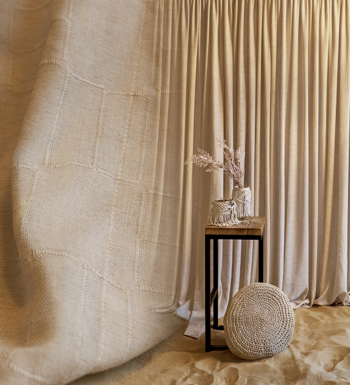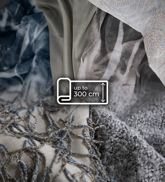 Дизайн базируется на чередующихся горизонтальных полосках из прозрачного тюля и плотной шенильной ткани. Следы, остающиеся на пляже — главная идея. Полосы придают графичности, образуют преломление света и интересные игры теней, а ширина 320 см является еще одним важным плюсом в списке преимуществ.