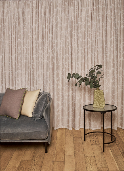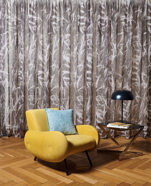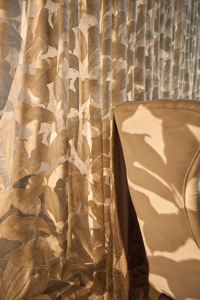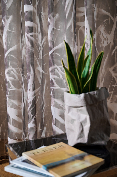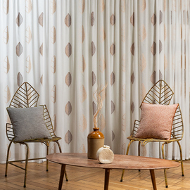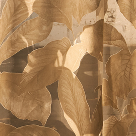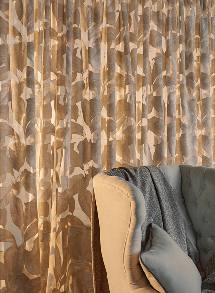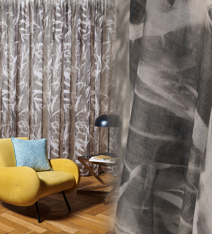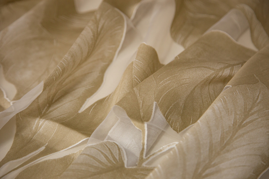 Тонкая органза и плотная невытравленная база с графичным рисунком воссоздают и изящно повторяют контуры листьев, что помогает украсить интерьер действительно экологичными и природными акцентами. Смешанный состав из 60% вискозы и 40% полиэстера обеспечивает прочность и удивительную тактильность.