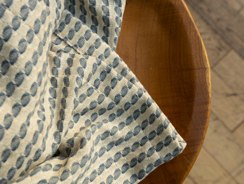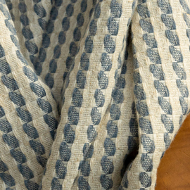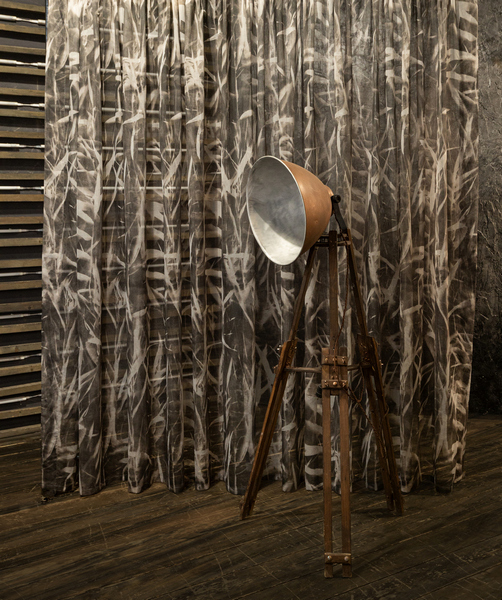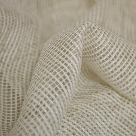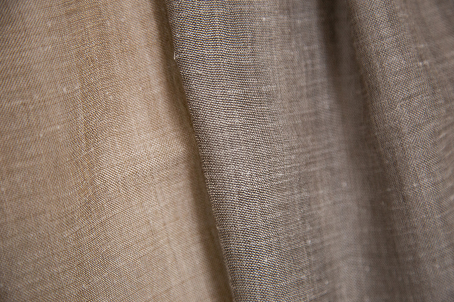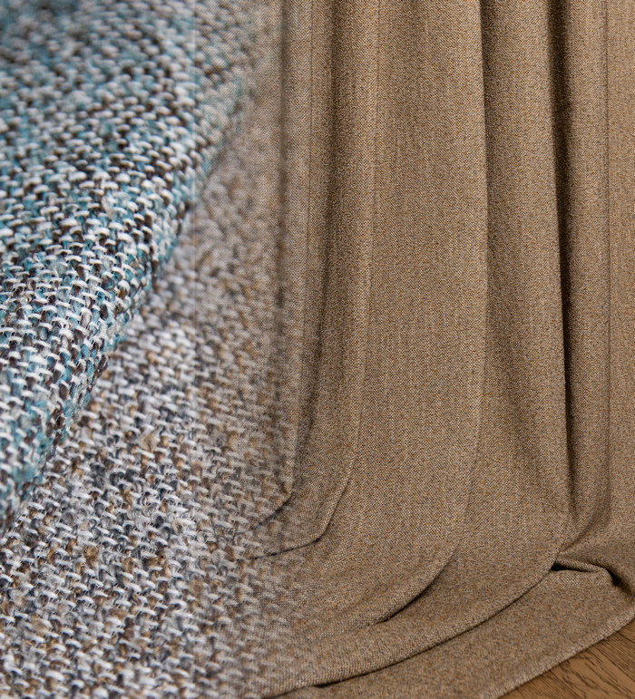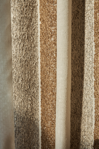 Ткань апеллирует к техникам бумажного ремесла. Объединяя в себе хлопок, лен и полиэстер, она обладает эстетикой крафтовой бумаги и богатой текстурой: невыбеленный, с прожилками лен чувствуется на ощупь. В определенных цветах ткань выглядит еще самобытнее, дополняя тактильное впечатление визуальным.