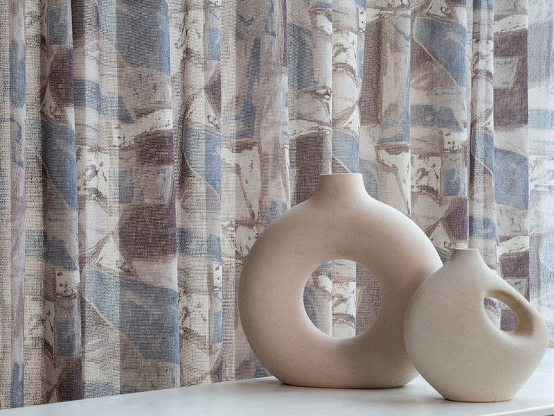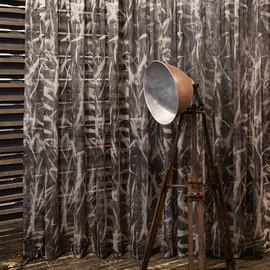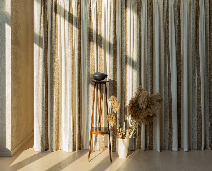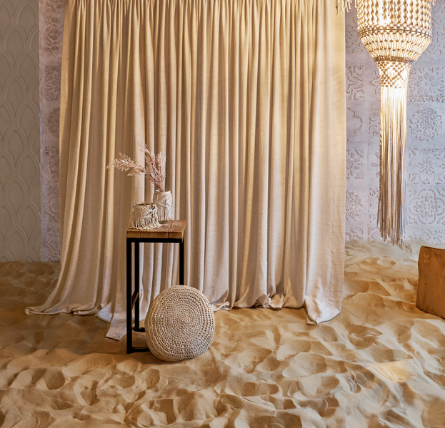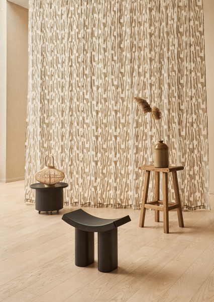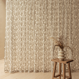 Ткань напоминает сшитые вместе лоскуты из натуральных материалов. При этом 10% льна в составе дополняют визуальное впечатление тактильным. Способность льна отлично держать форму и грандиозная ширина 320 см делают этот дизайн подходящим для оформления даже самых прихотливых пространств.
