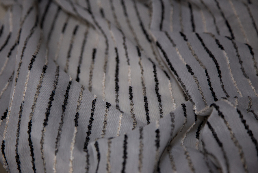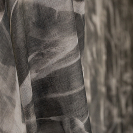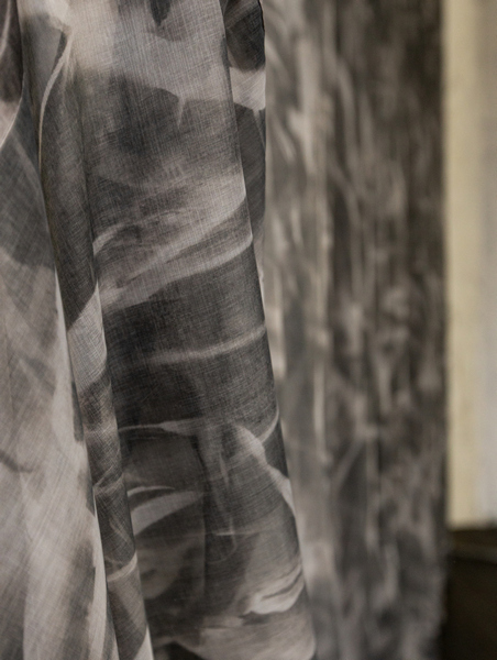 Дизайн опирается на монохромную живопись тушью, а принт на частично окрашенной пряже напоминает черно-белый графический рисунок. Характерные черты японского искусства в этом дизайне переосмыслены и поданы через современную призму. Матовая текстура углубляет цвет и придает вуали из тончайших крученых нитей особую атмосферу и стиль.