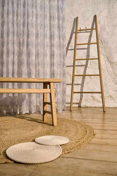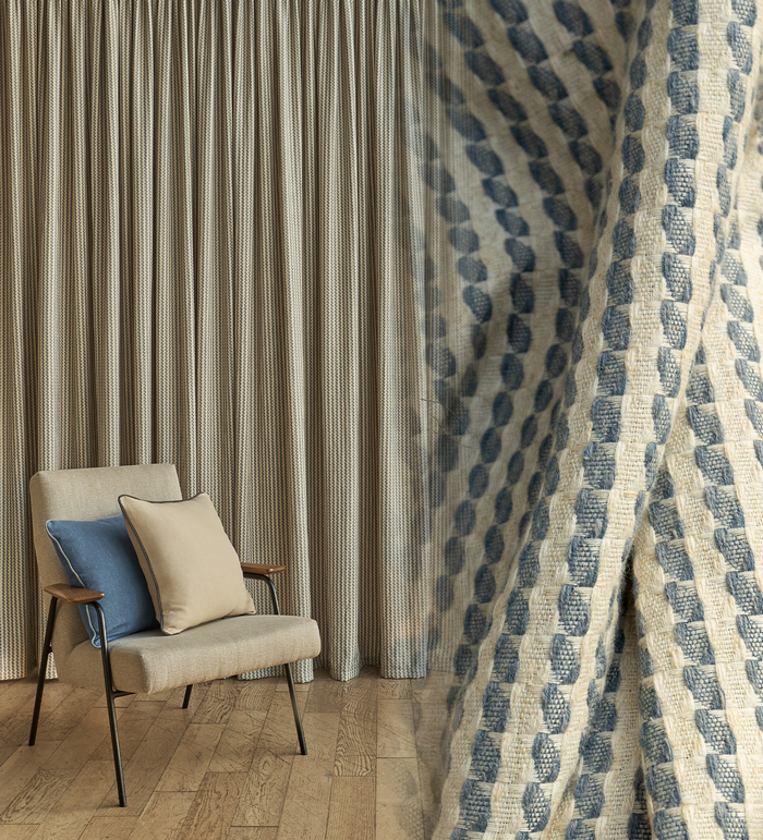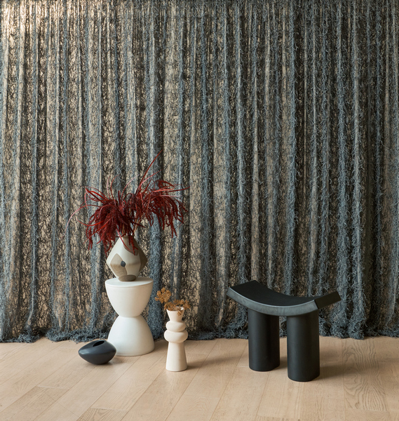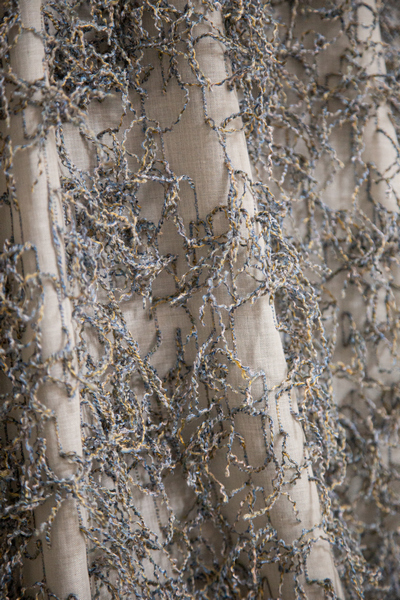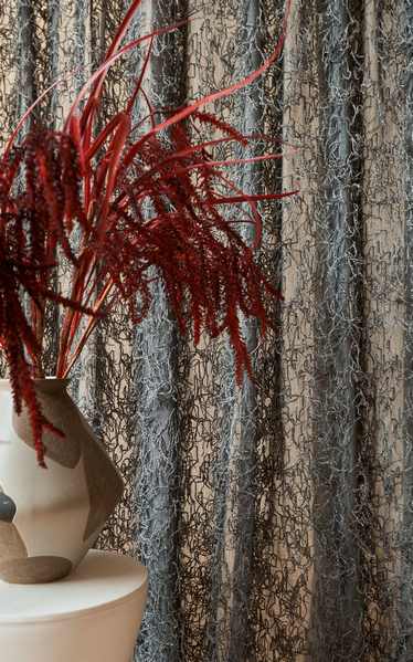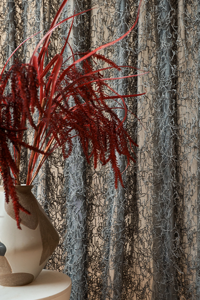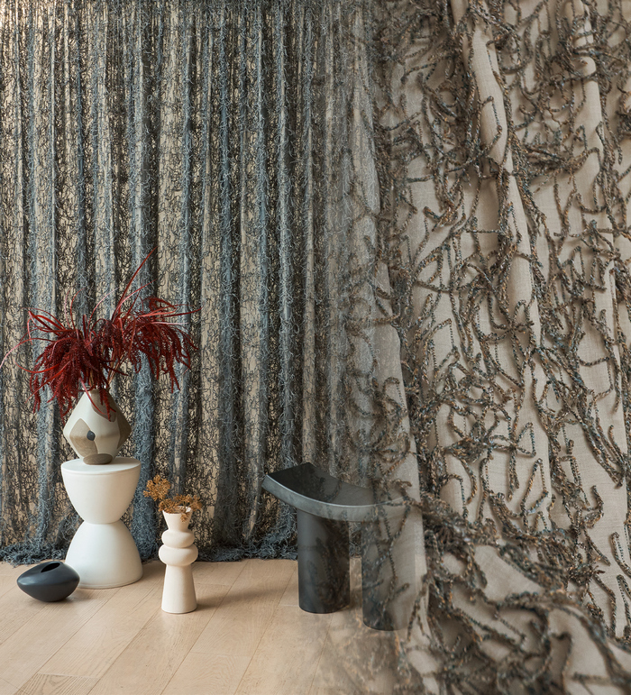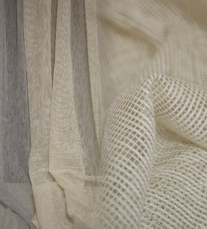 Символизирующая сеть ткань уверенно привносит в пространство визуальную сложность. Шенилловые нити на контрасте с перпендикулярными им создают естественный эффект пушистости, натуральности. Она позволяет изменить настроение интерьера с помощью обыгрывания теней и солнечных лучей через неоднородную структуру полотна.