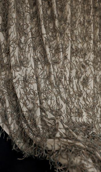 Невесомая полупрозрачная ткань с вышитыми большими абстрактными цветами, силуэтные узоры которых создают великолепный фокусный акцент. Вышивка в форме зигзагов-зубчиков имитирует одновременно острые бумажные уголки и законченный, раскрывшийся в бумажных гранях цветочный бутон.