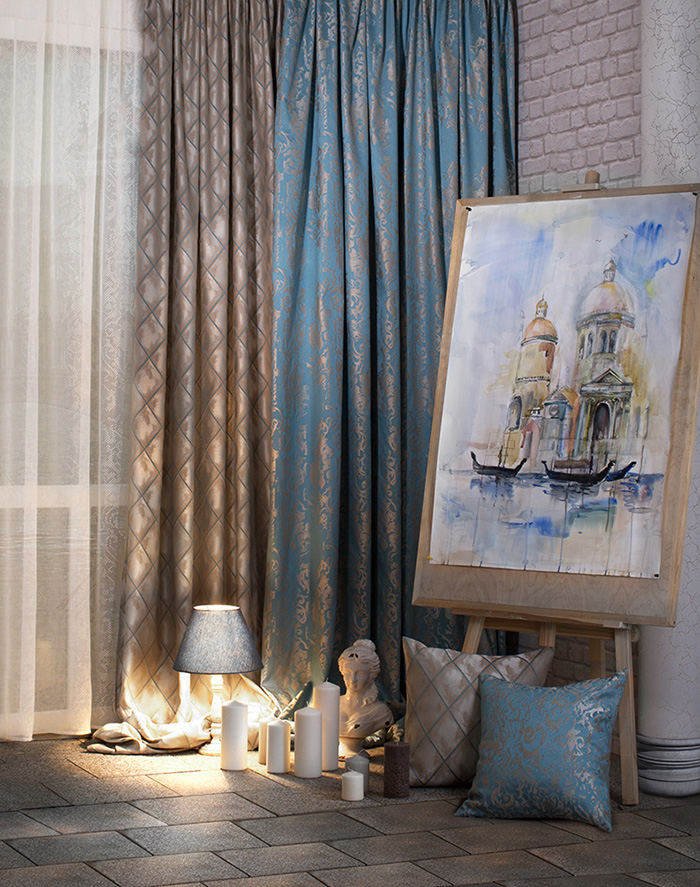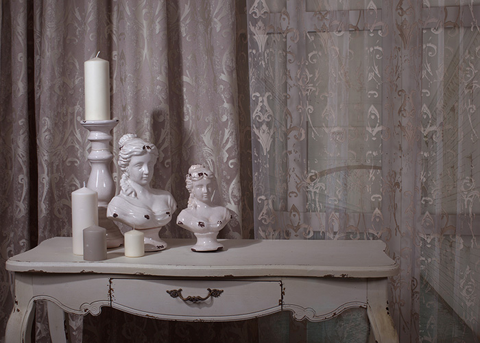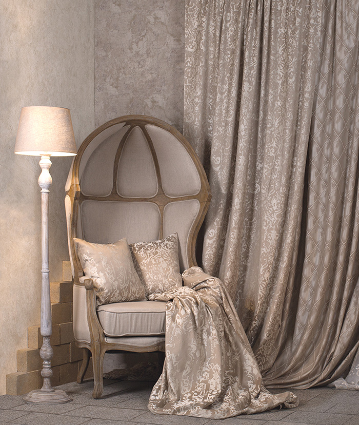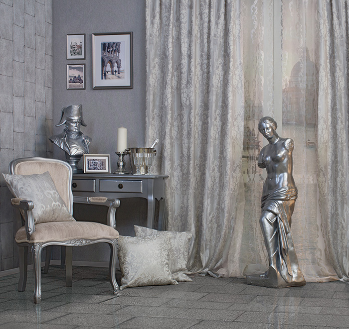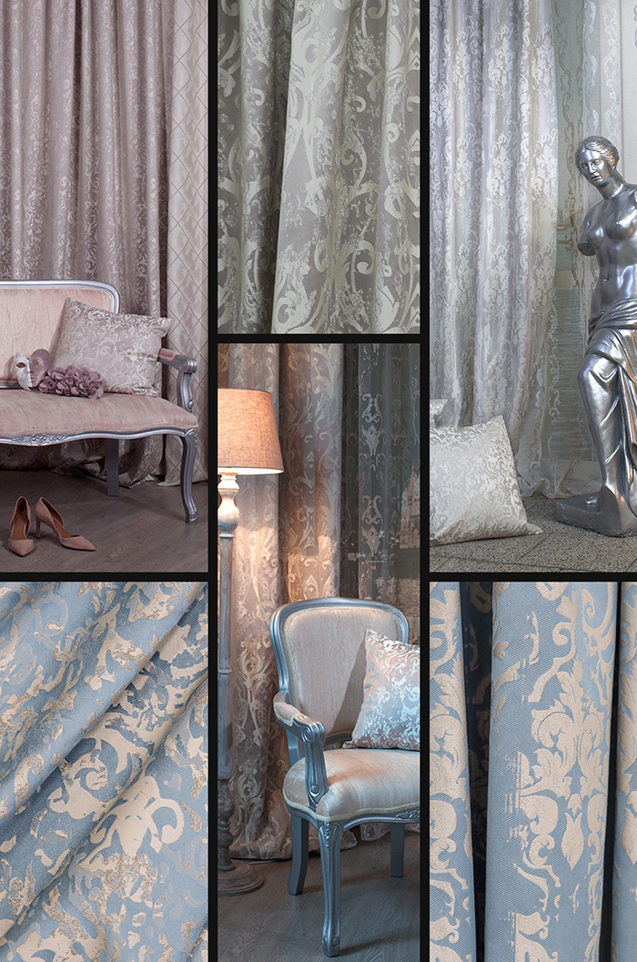 Ткани с искусным жаккардовым плетением из матовых и глянцевых нитей поддержаны тюлем с печатью перламутровыми красками. Они добавляют в коллекцию загадочное сияние, легкость и драгоценный серебряный отсвет.