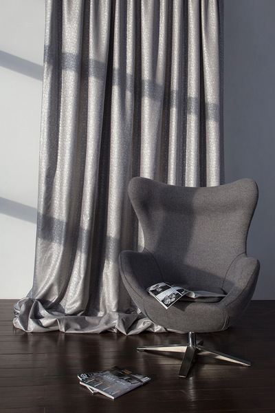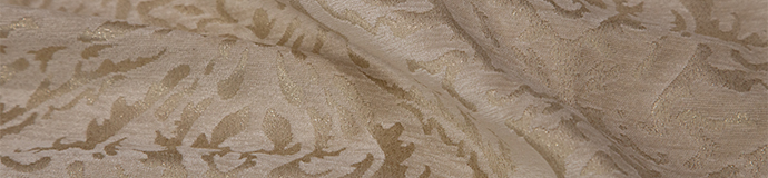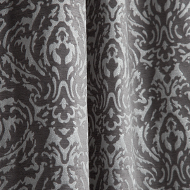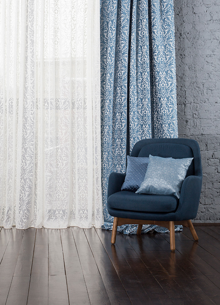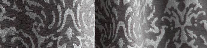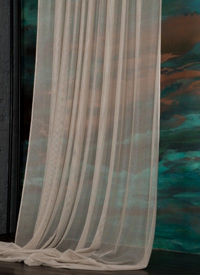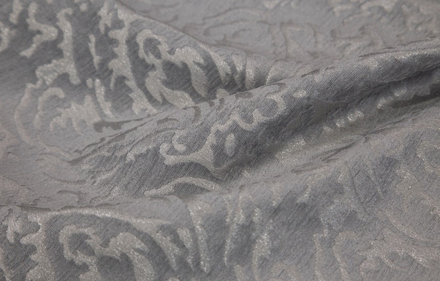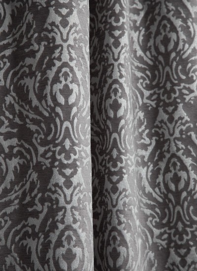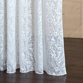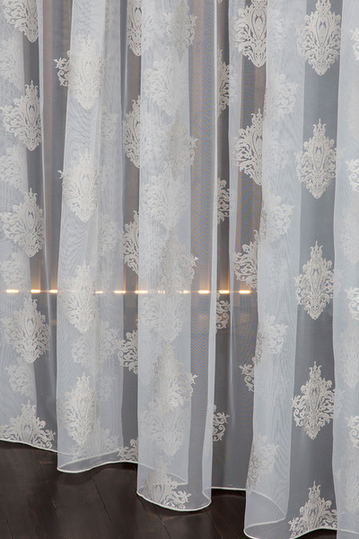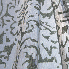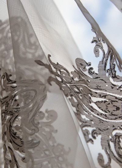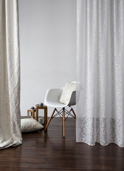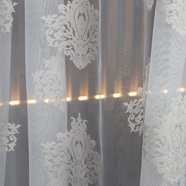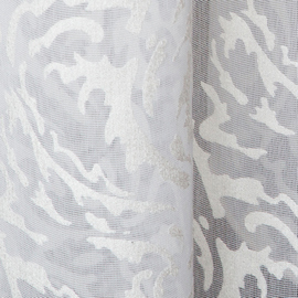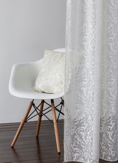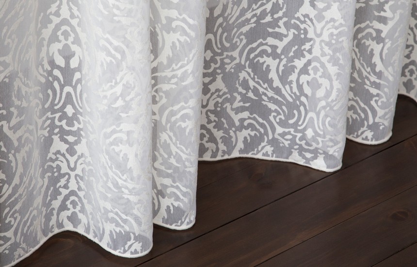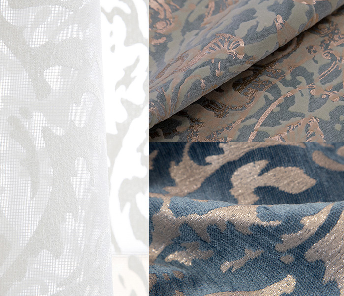 Нежный, прекрасно драпирующийся шенилл с изысканным стилизованным дамаском декорирован нитью люрекса. Изящную линию поддерживает тюлевый компаньон с травлением и объемным рисунком на мягкой основе, имитирующей шенильную нить.