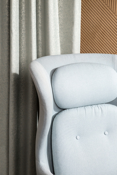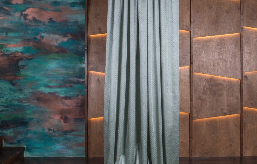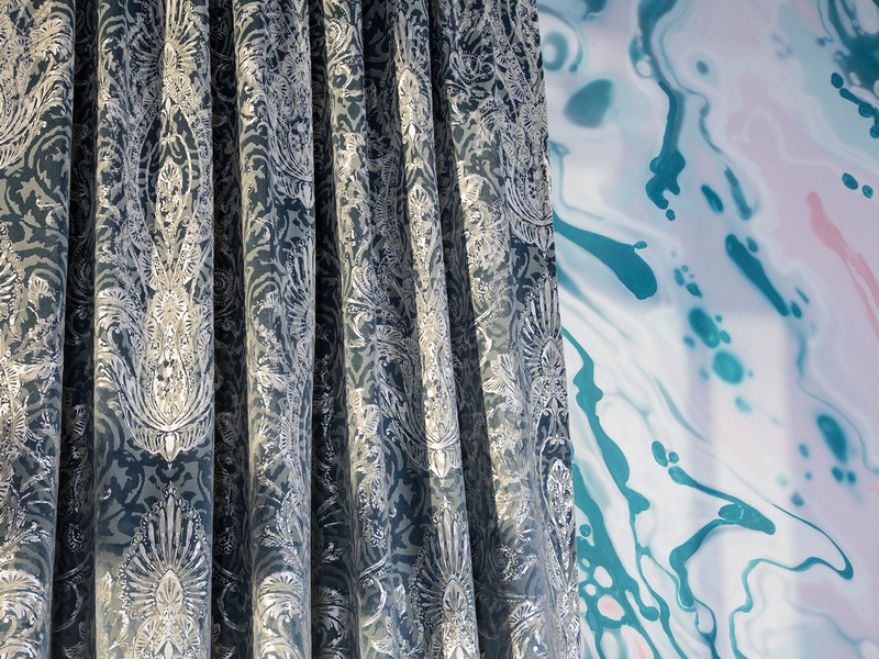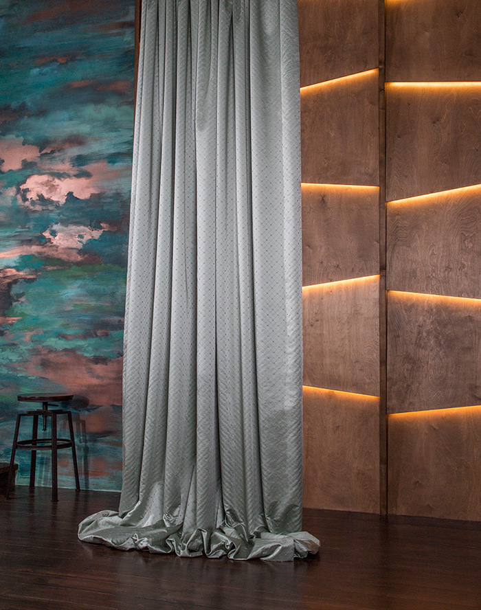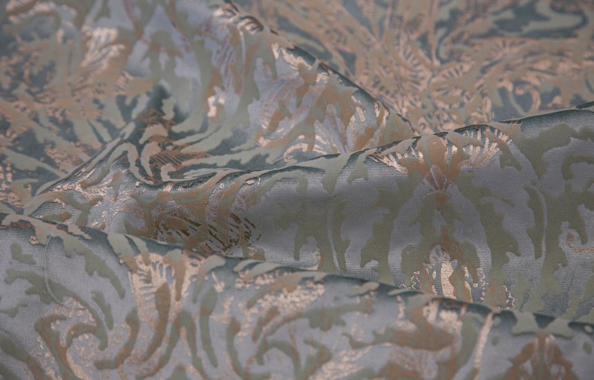 Благородный бархат появляется в неожиданном и актуальном прочтении. Рисунок на ткани в виде объемного дамаска выполнен в многослойной технике фольгирования и флокирования. Она имитирует тонкую резьбу по дереву. Тюлевый компаньон с созвучным стилизованным дизайном создан в технике травления и печати глиттером.