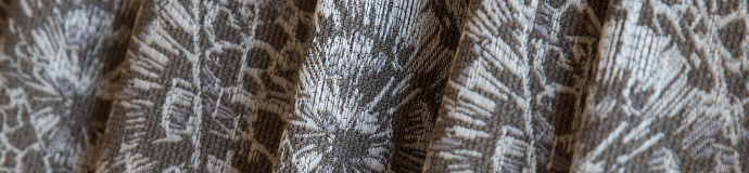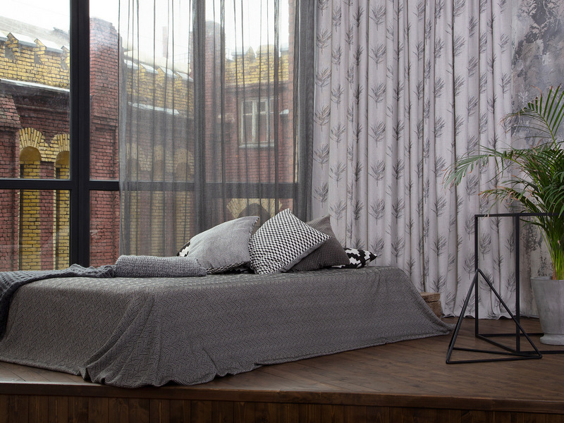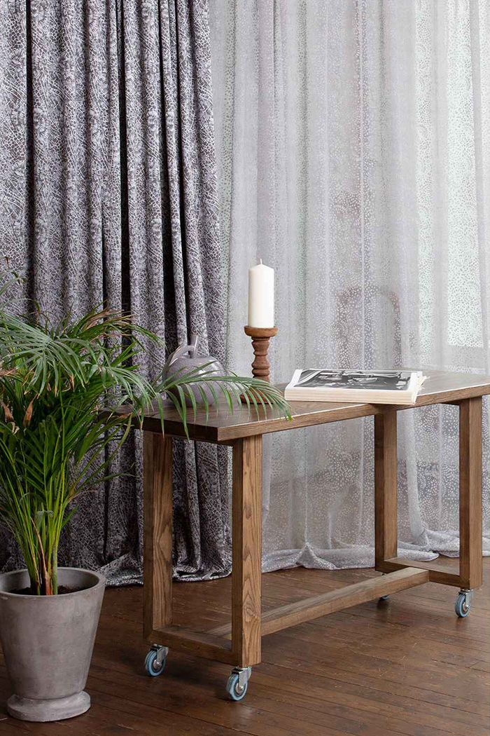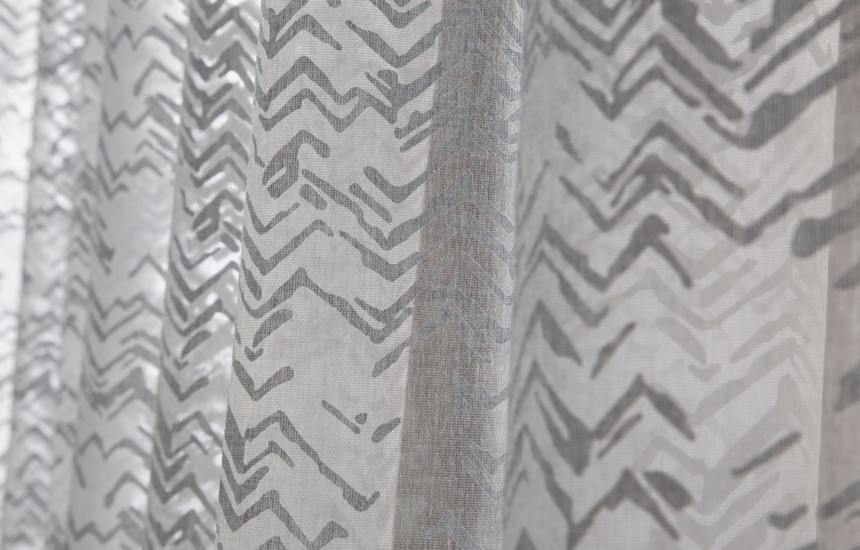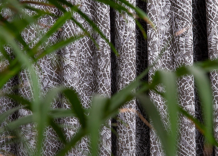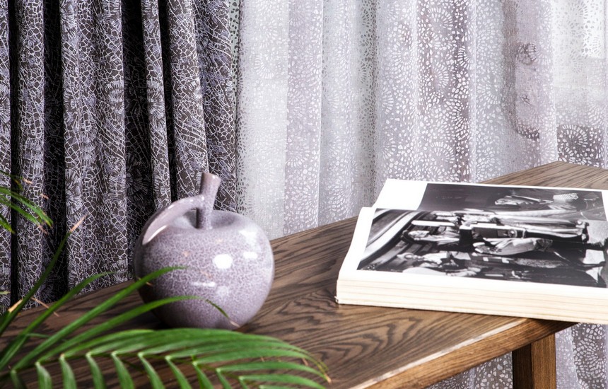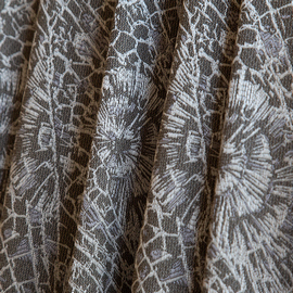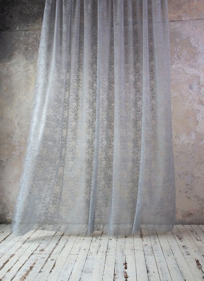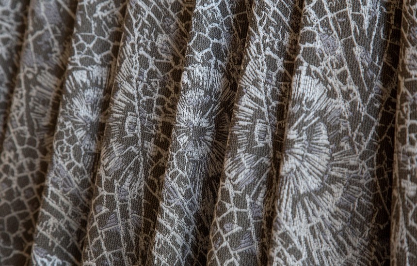 Что мы знаем о самом начале жизни? Мягкий жаккард с рисунком ракушек на поверхности песчаника рассказывает о нашей планете на заре мироздания. Историю отпечатков далекого прошлого продолжает вискозный тюль со стилизованными ракушками.