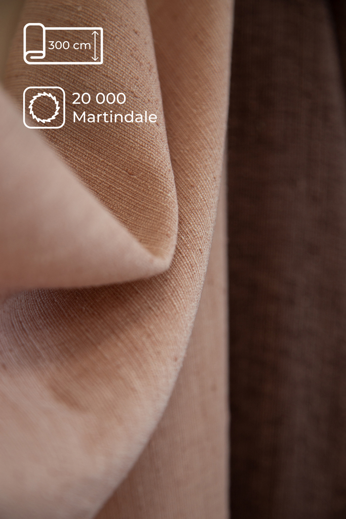 Ткань не только очень легкая, но и очень широкая — 3 метра, набирается по высоте и по ширине. Износостойкость составляет 20 000 циклов по тесту Мартиндейла. Прочность достигается за счет входящих в состав ткани синтетических волокон.