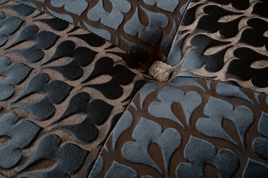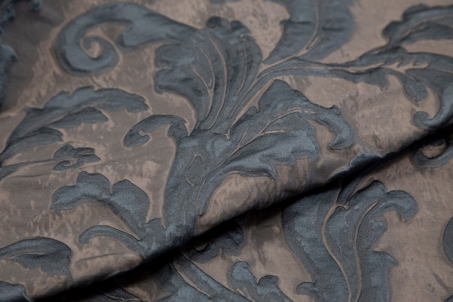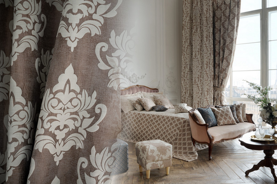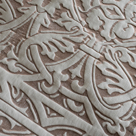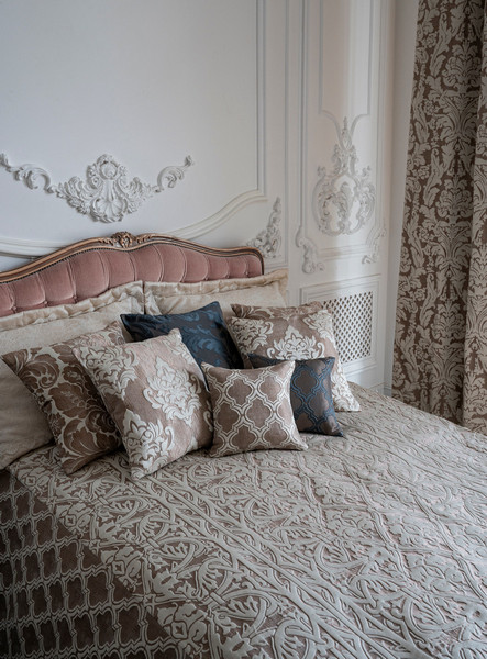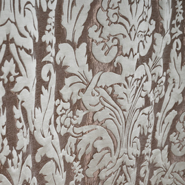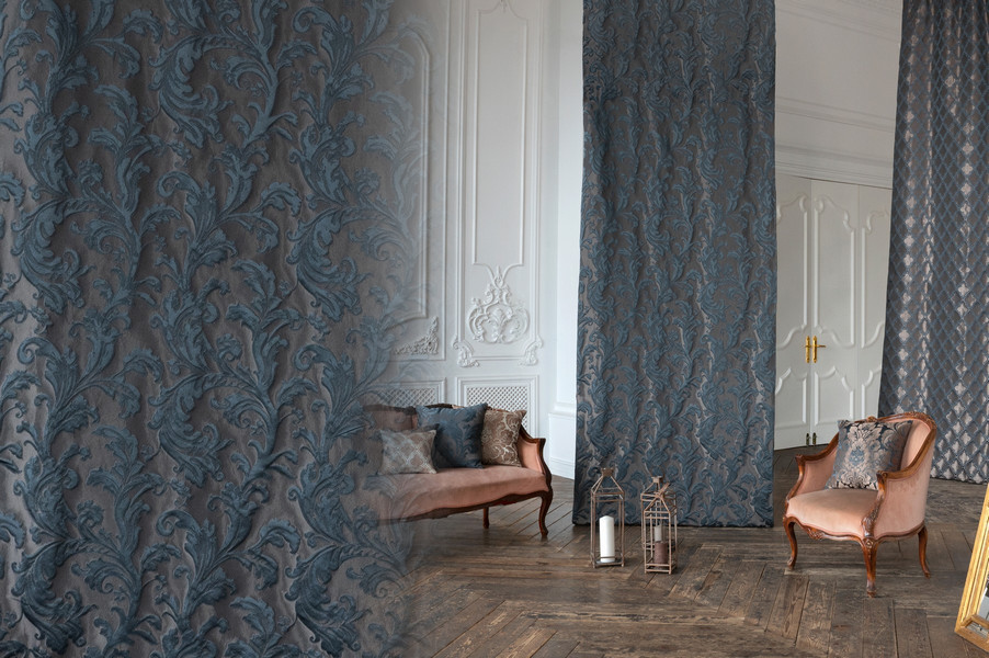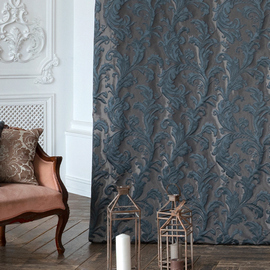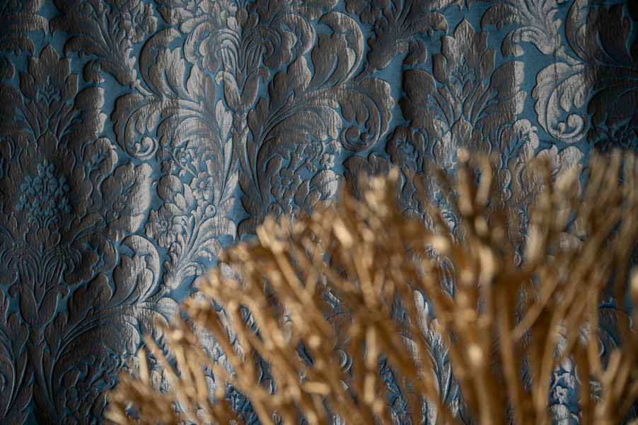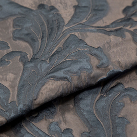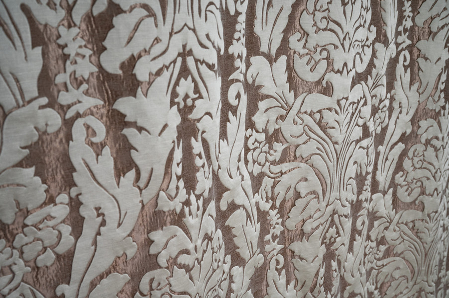Растительный мотив также продолжает тема классики и дамасского узора, который практически «вдавлен» в основу. В центре рисунка раскрывается пышный цветок, виртуозно обрамленный переплетениями стеблей и листьев. Несмотря на кажущуюся строгость, часто присущую классике, мягкость ткани компенсирует традиционность узора и создает ощущение уюта, дома.