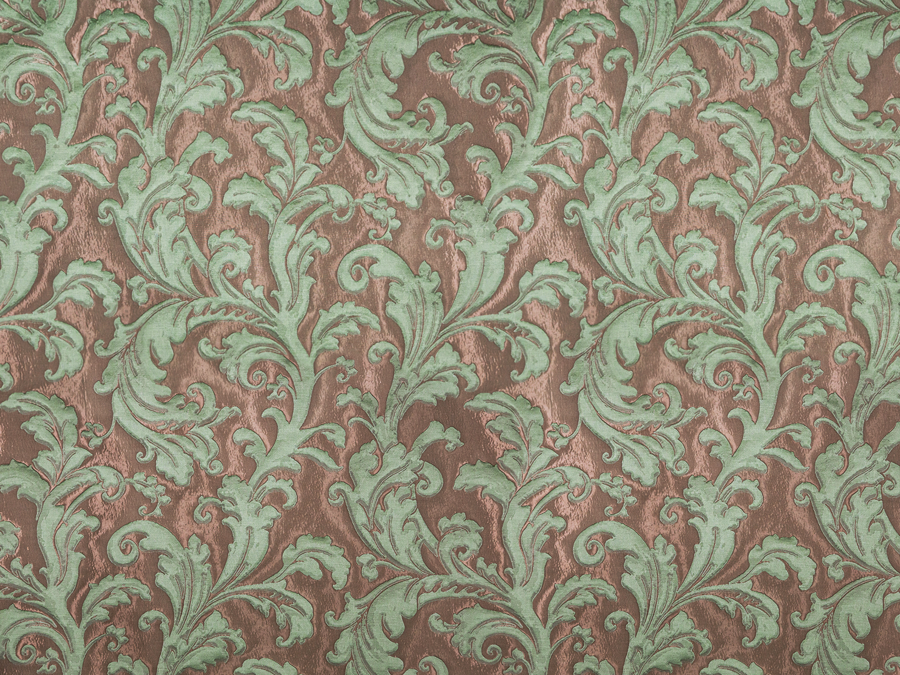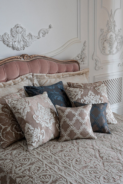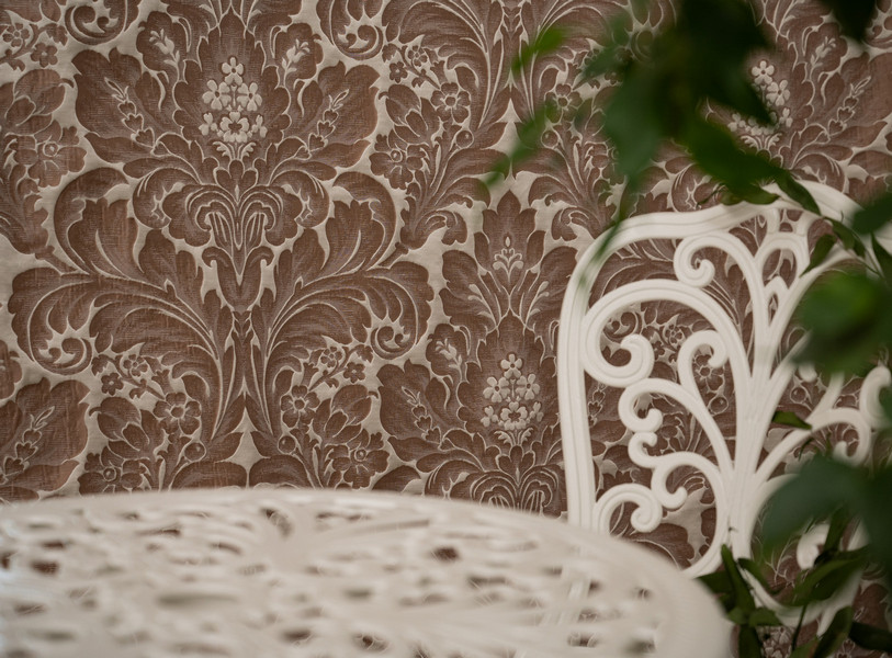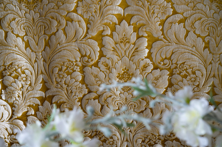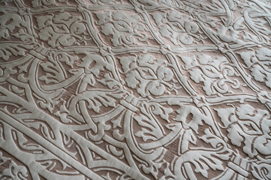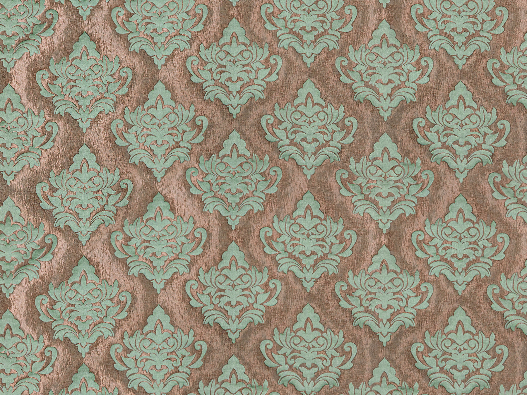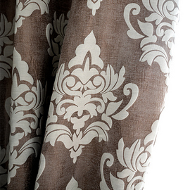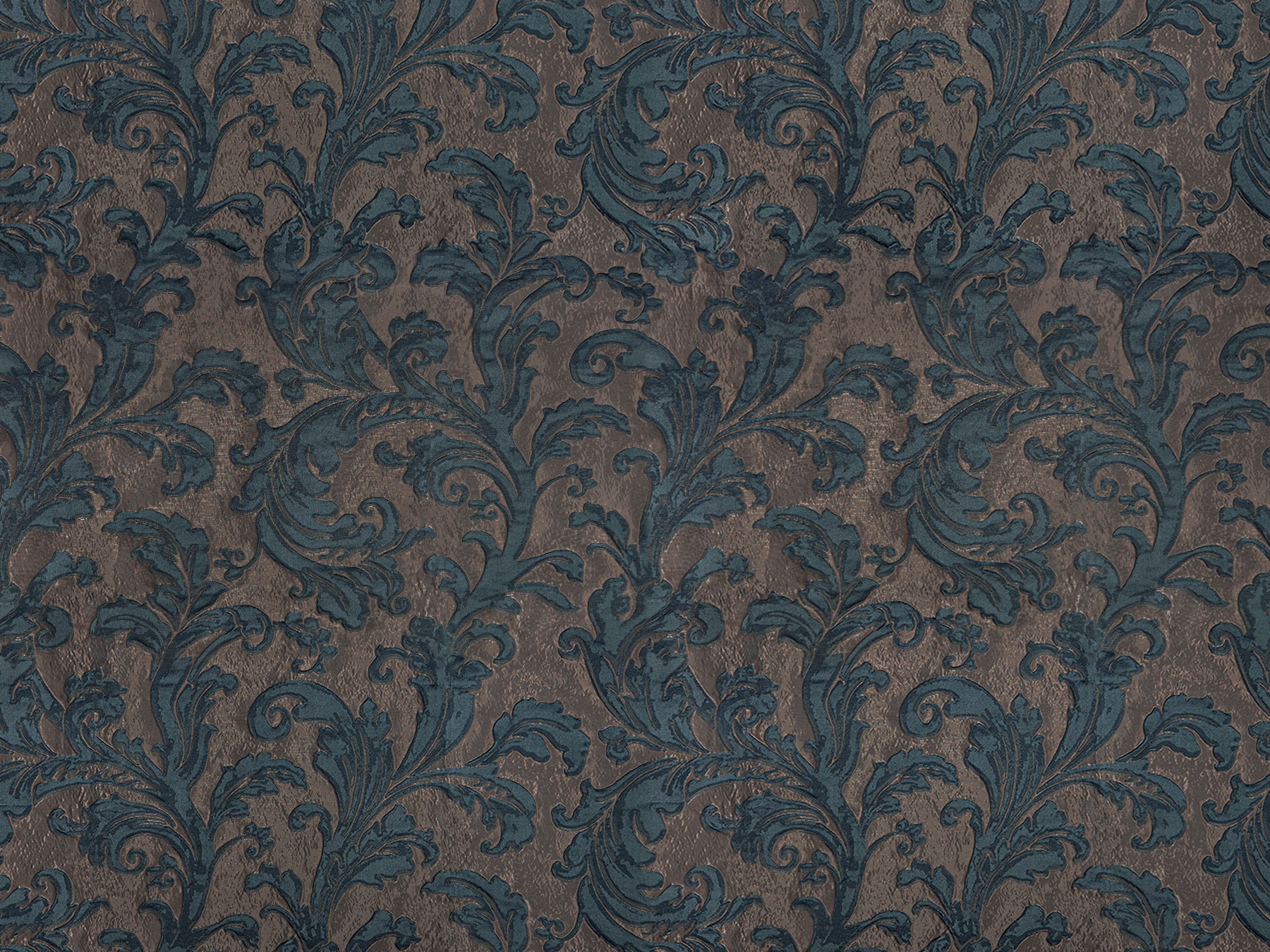 Растительный мотив также продолжает тема классики и дамасского узора, который практически «вдавлен» в основу. В центре рисунка раскрывается пышный цветок, виртуозно обрамленный переплетениями стеблей и листьев. Несмотря на кажущуюся строгость, часто присущую классике, мягкость ткани компенсирует традиционность узора и создает ощущение уюта, дома.