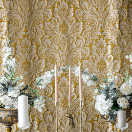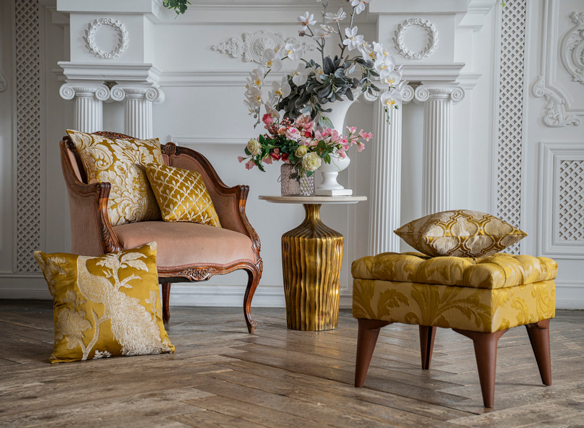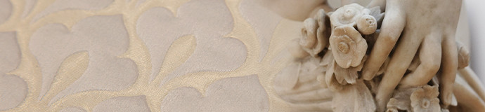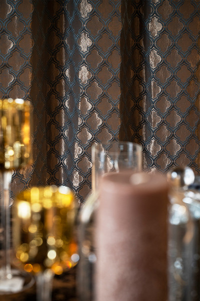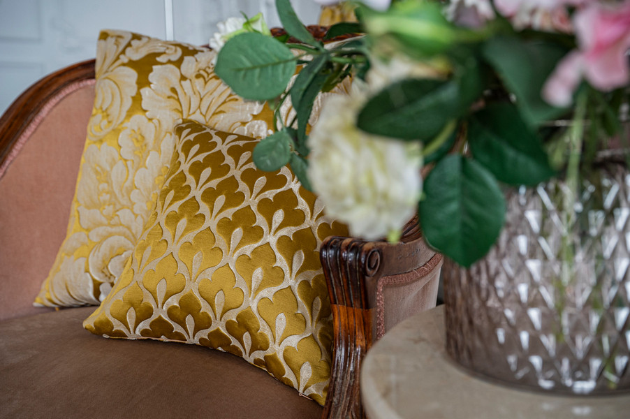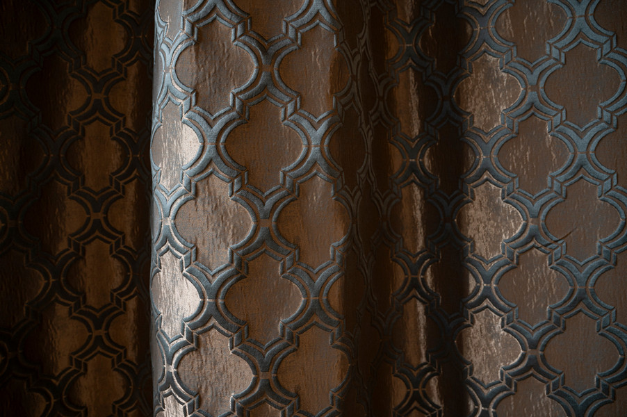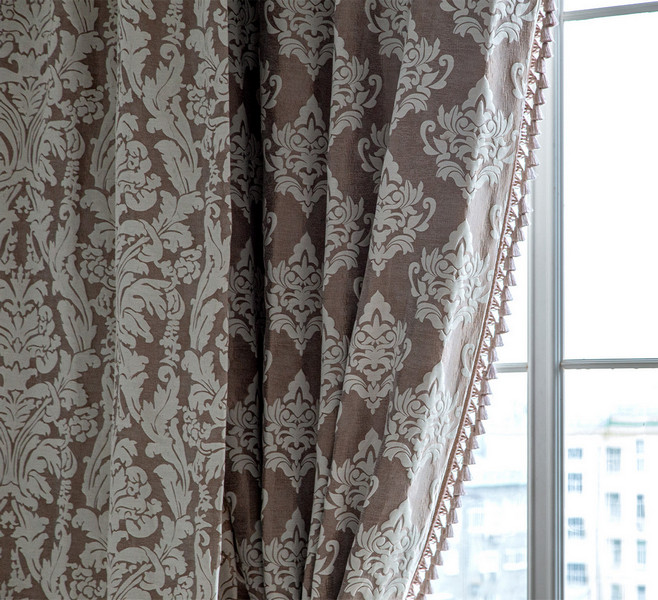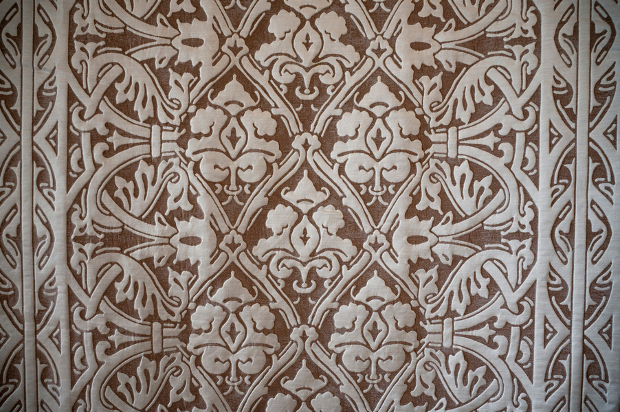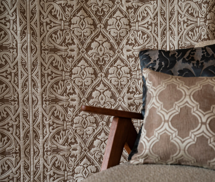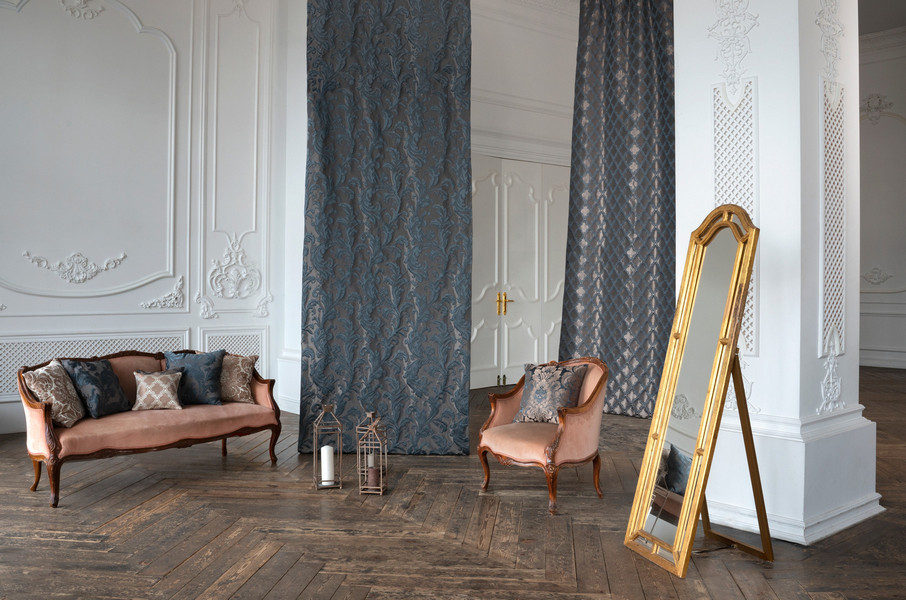 Растительный мотив также продолжает тема классики и дамасского узора, который практически «вдавлен» в основу. В центре рисунка раскрывается пышный цветок, виртуозно обрамленный переплетениями стеблей и листьев. Несмотря на кажущуюся строгость, часто присущую классике, мягкость ткани компенсирует традиционность узора и создает ощущение уюта, дома.