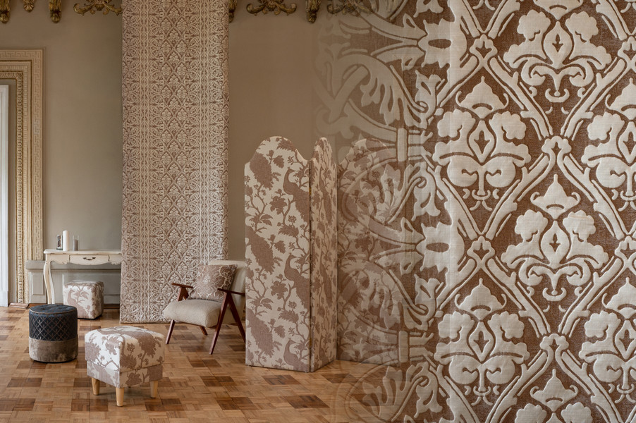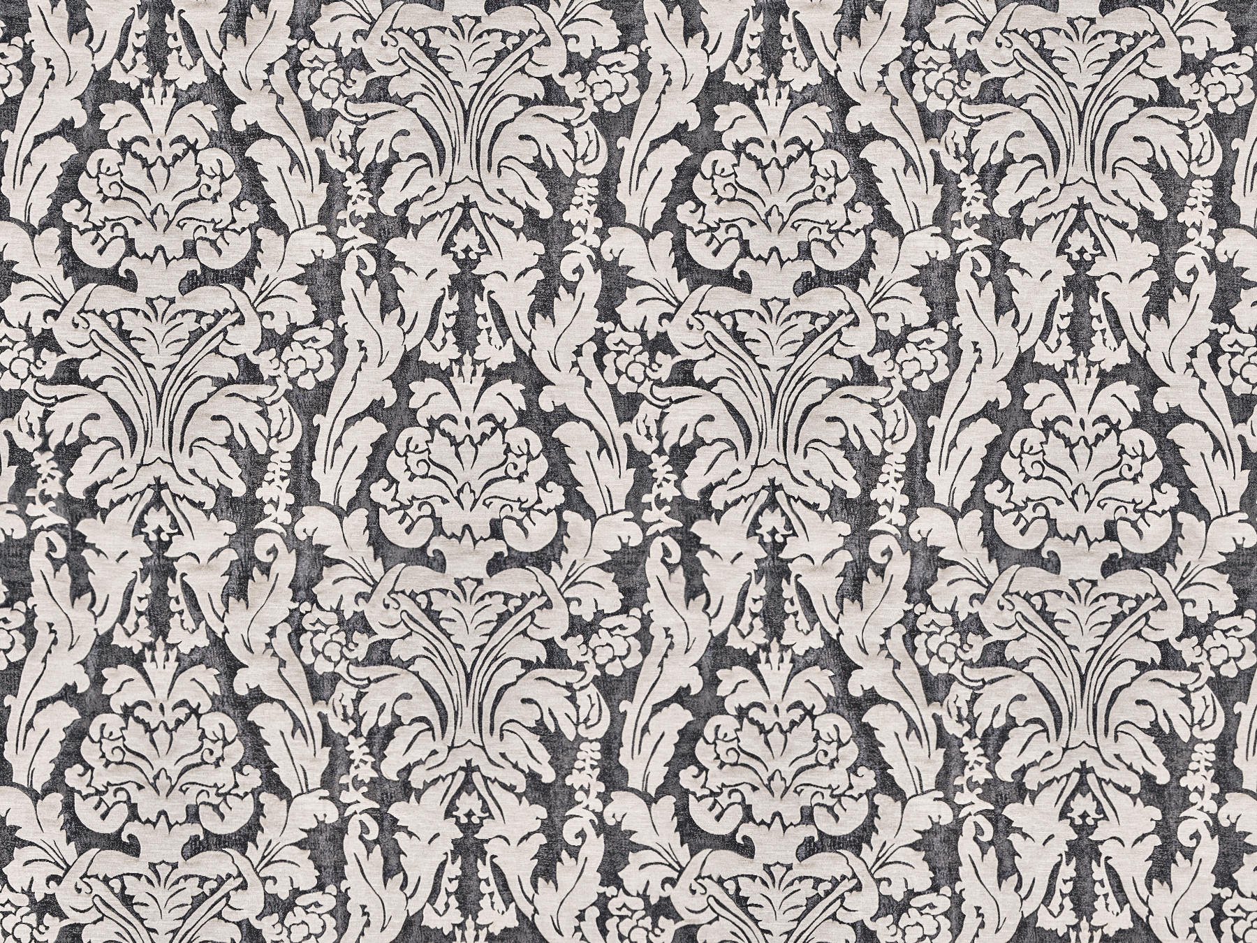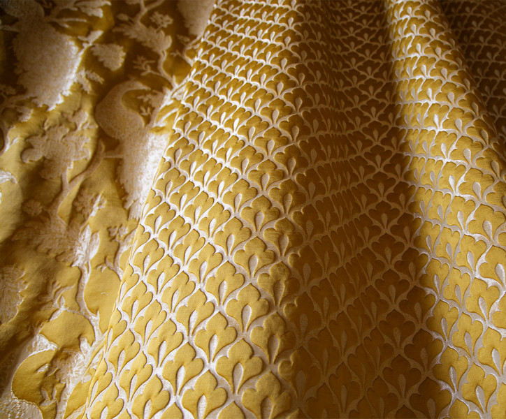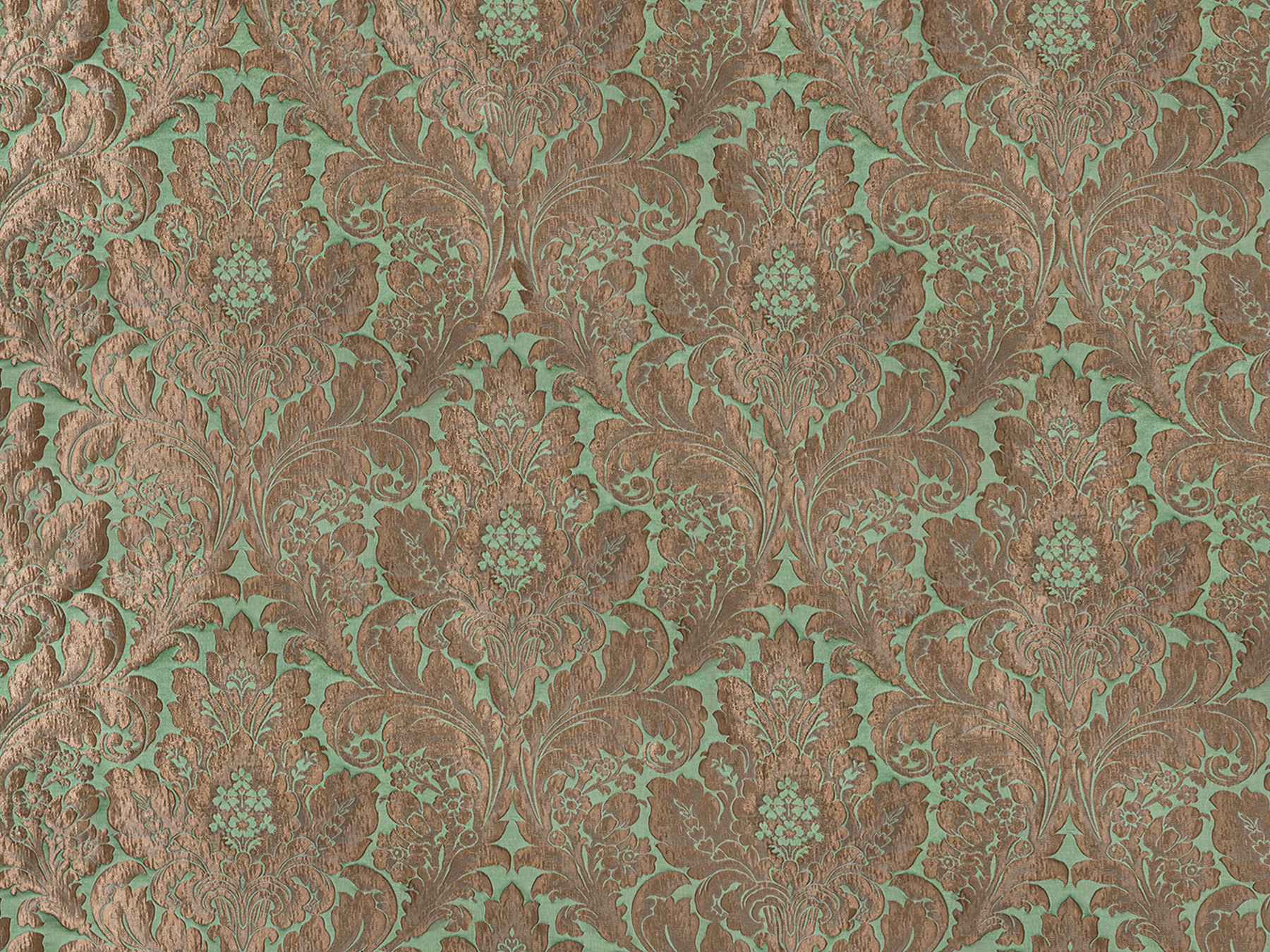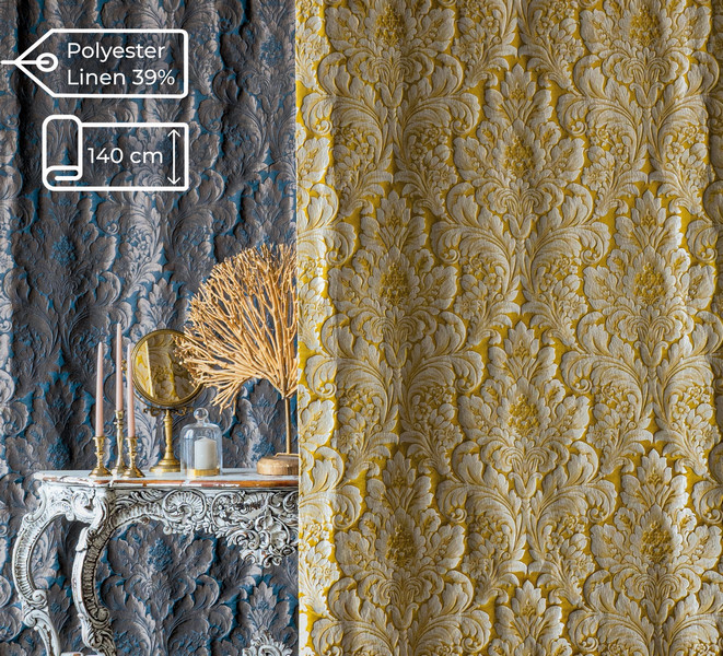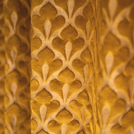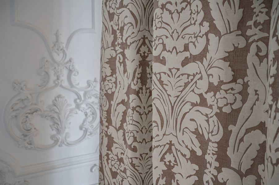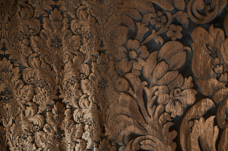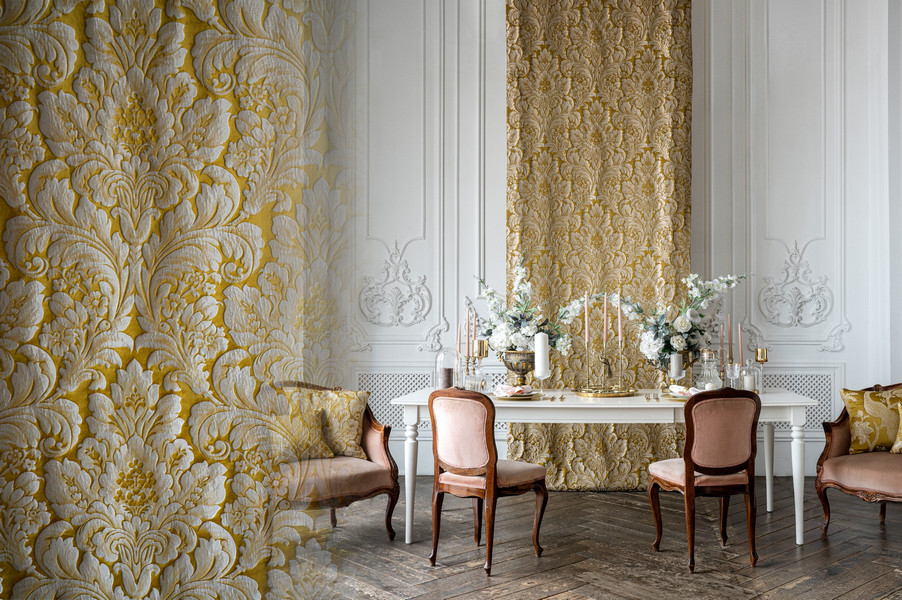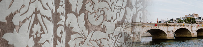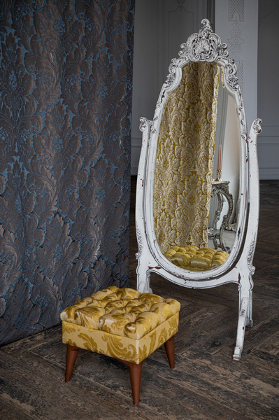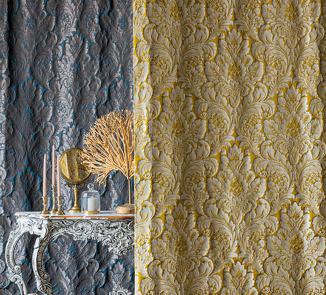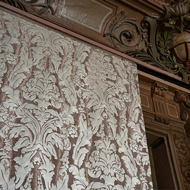 Получивший вторую жизнь сначала в Италии, а после и во Франции, этот вертикальный дамасский узор переносит нас в дома французской аристократии семнадцатого века. Крупнораппортные вензели в нем подчеркнуты трехмерным исполнением, и ткань уверенно заявляет о своем благородном происхождении.
