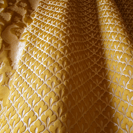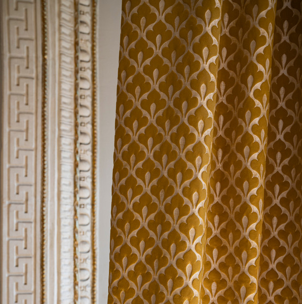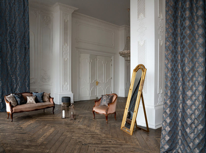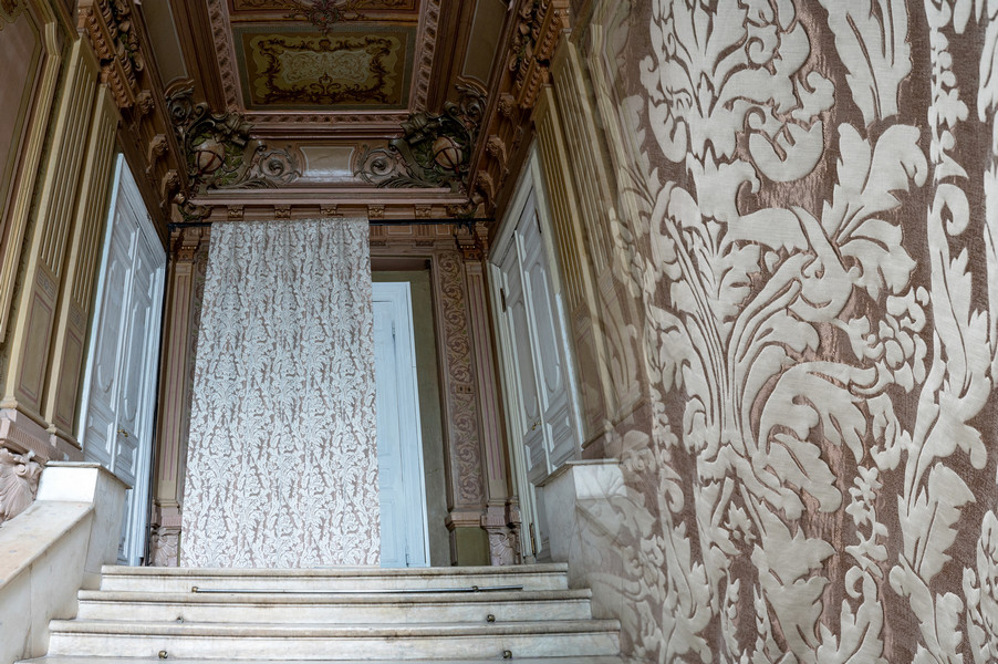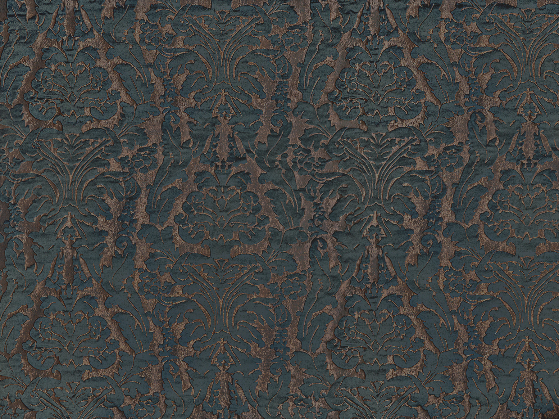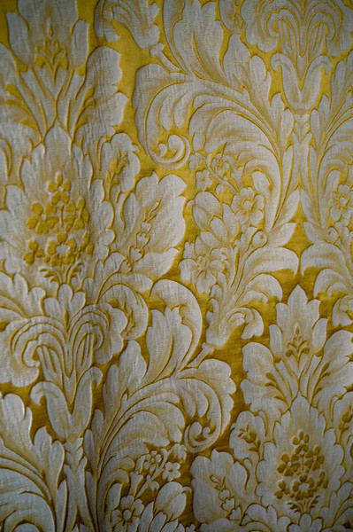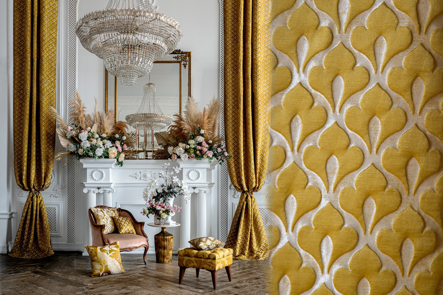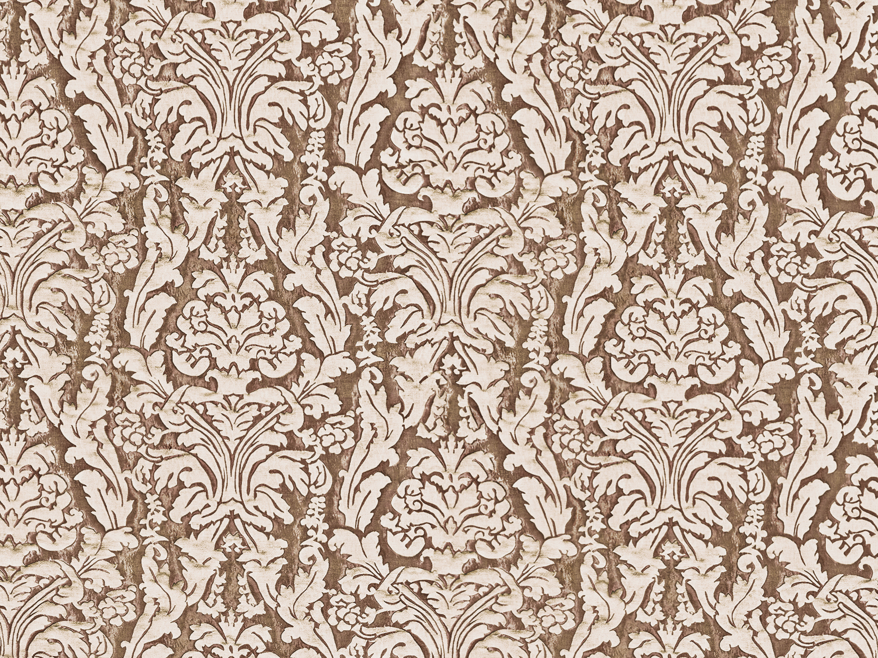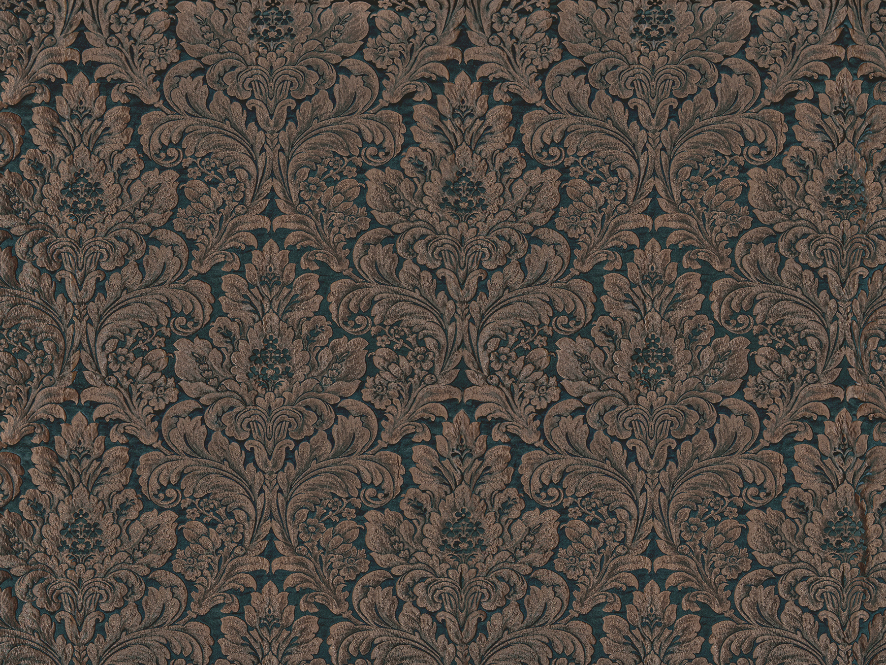 Получивший вторую жизнь сначала в Италии, а после и во Франции, этот вертикальный дамасский узор переносит нас в дома французской аристократии семнадцатого века. Крупнораппортные вензели в нем подчеркнуты трехмерным исполнением, и ткань уверенно заявляет о своем благородном происхождении.