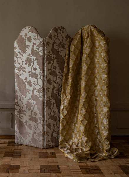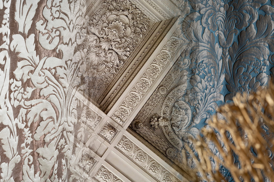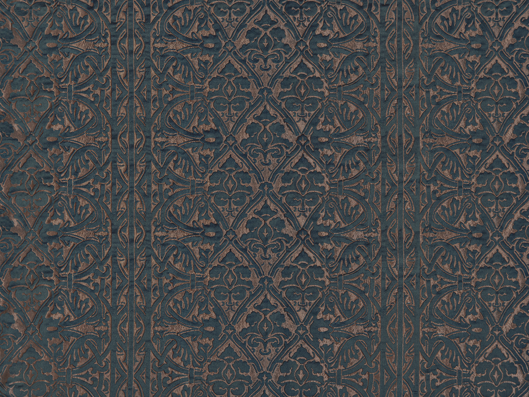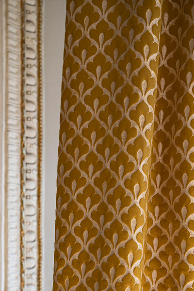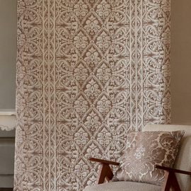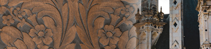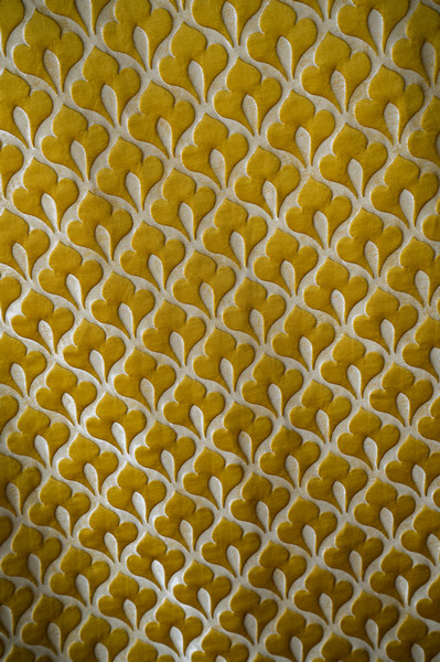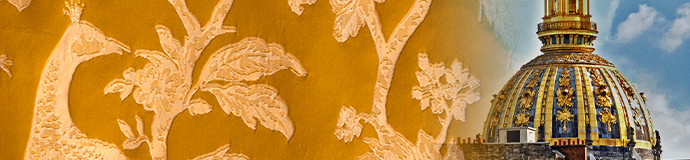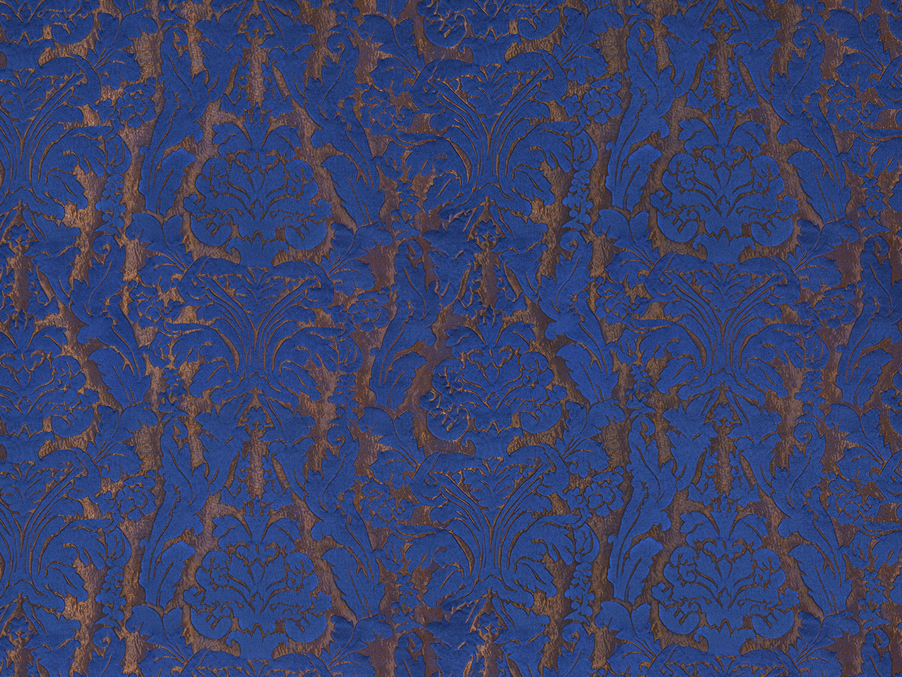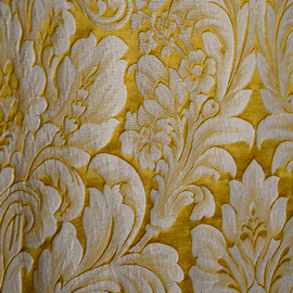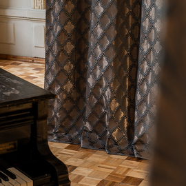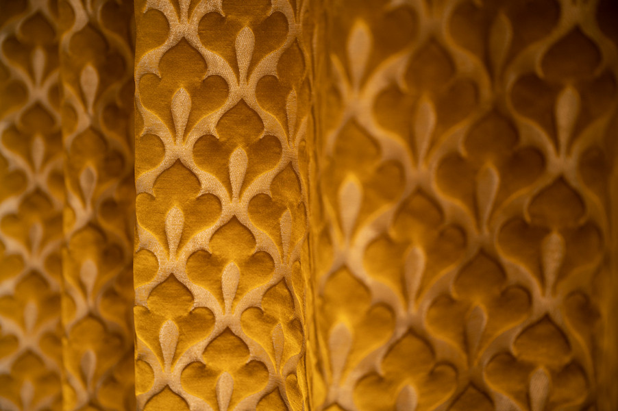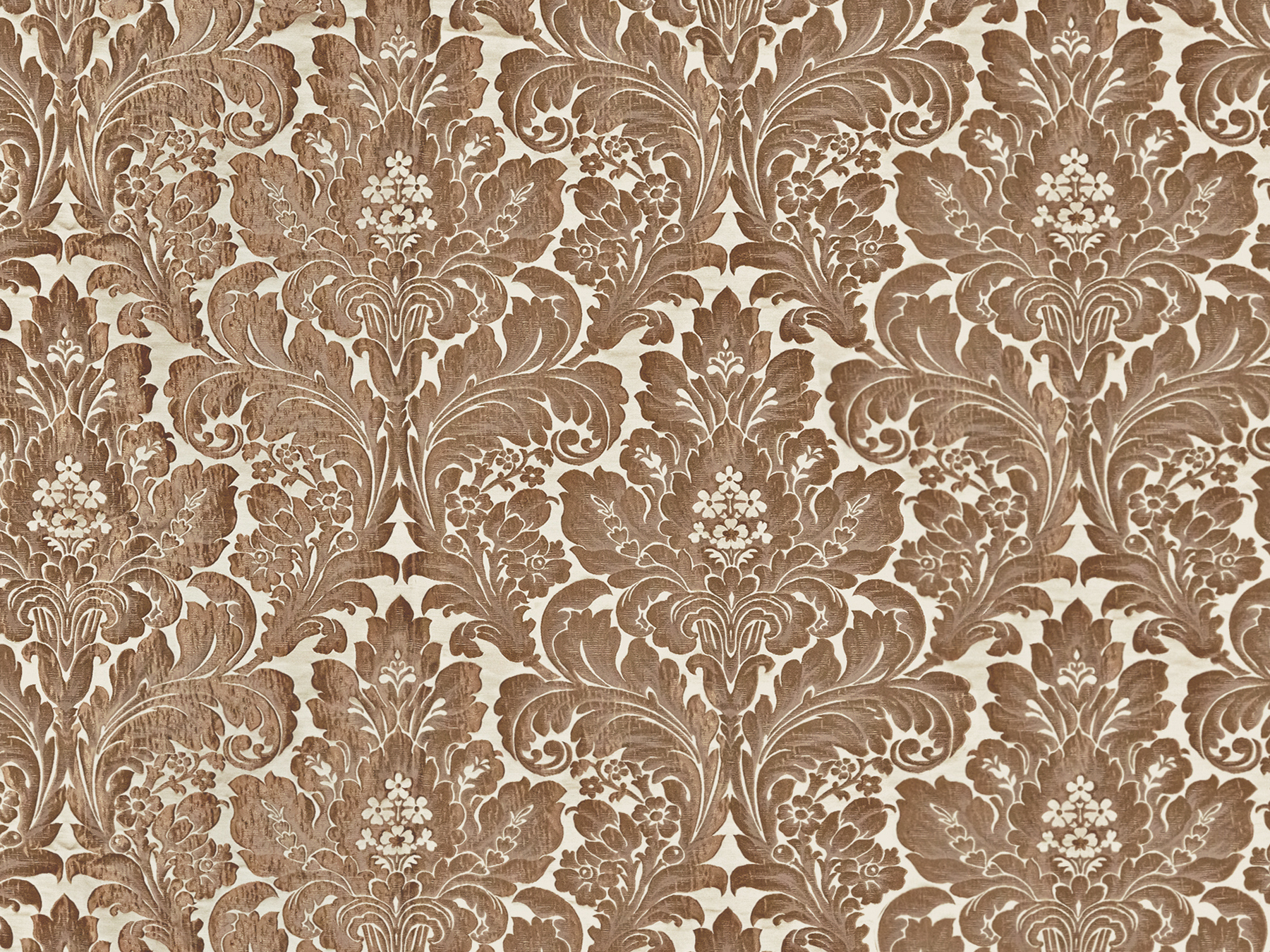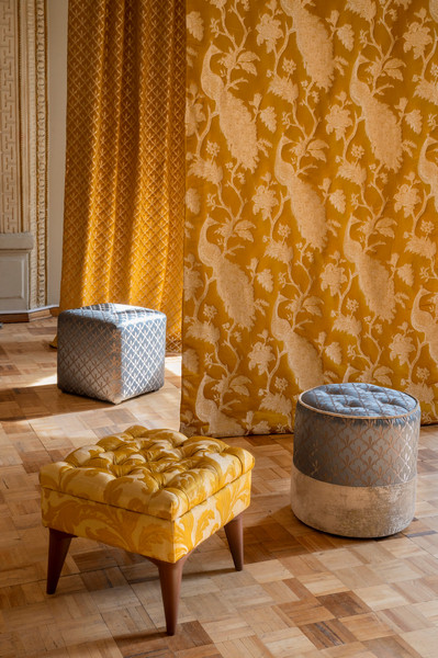 Получивший вторую жизнь сначала в Италии, а после и во Франции, этот вертикальный дамасский узор переносит нас в дома французской аристократии семнадцатого века. Крупнораппортные вензели в нем подчеркнуты трехмерным исполнением, и ткань уверенно заявляет о своем благородном происхождении.