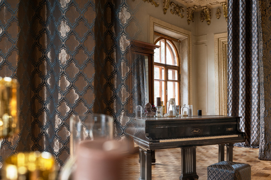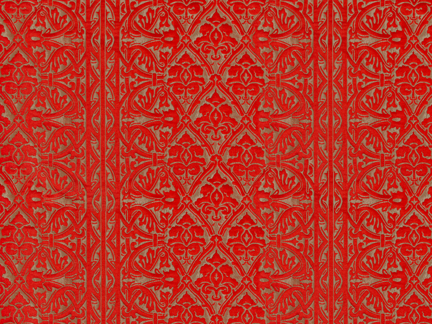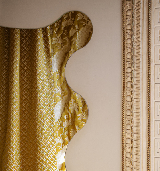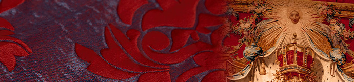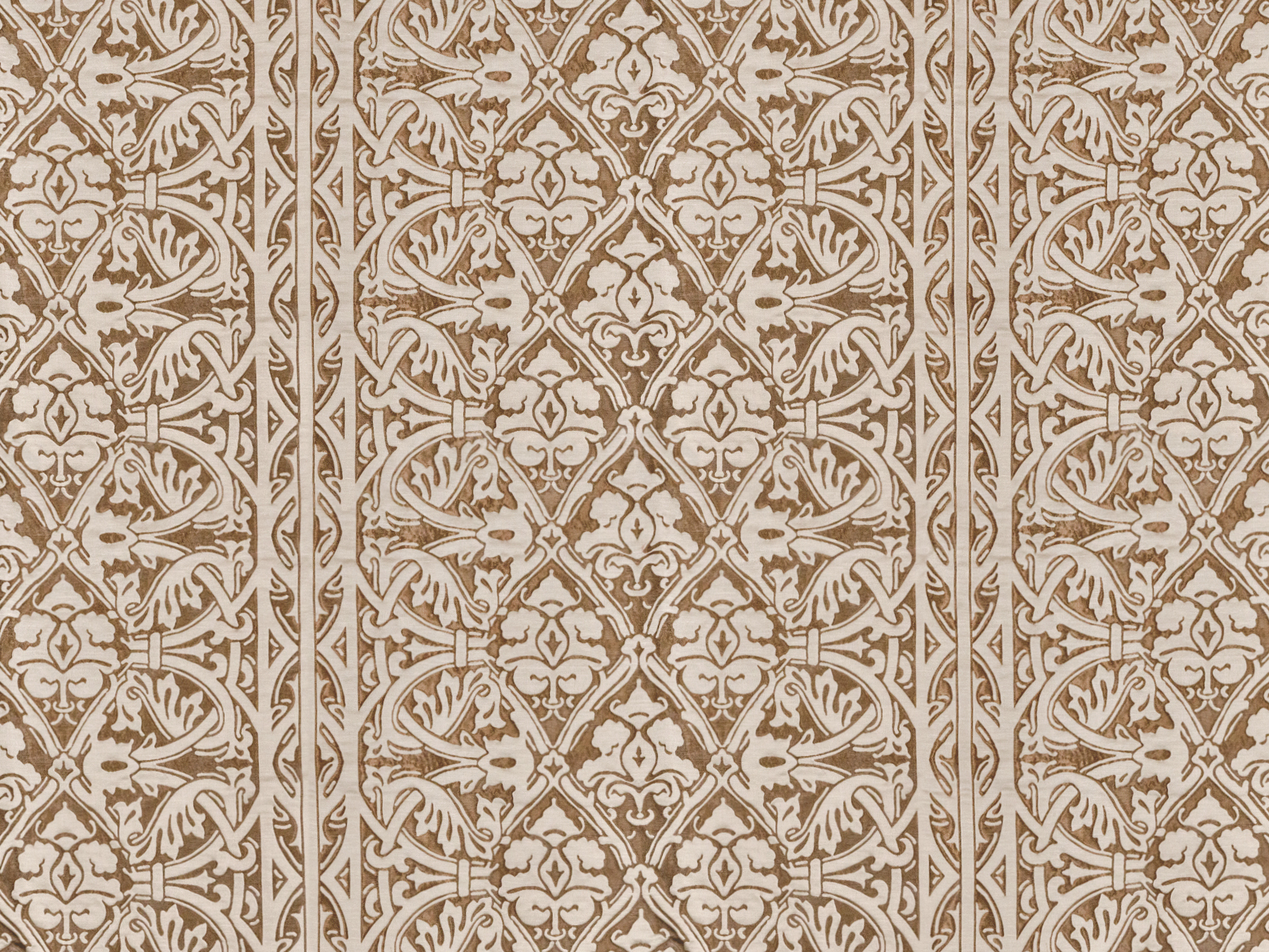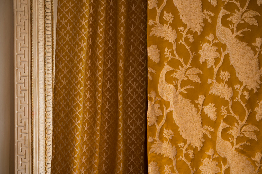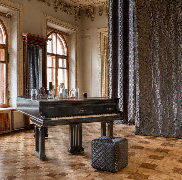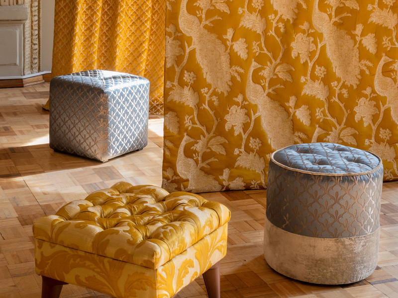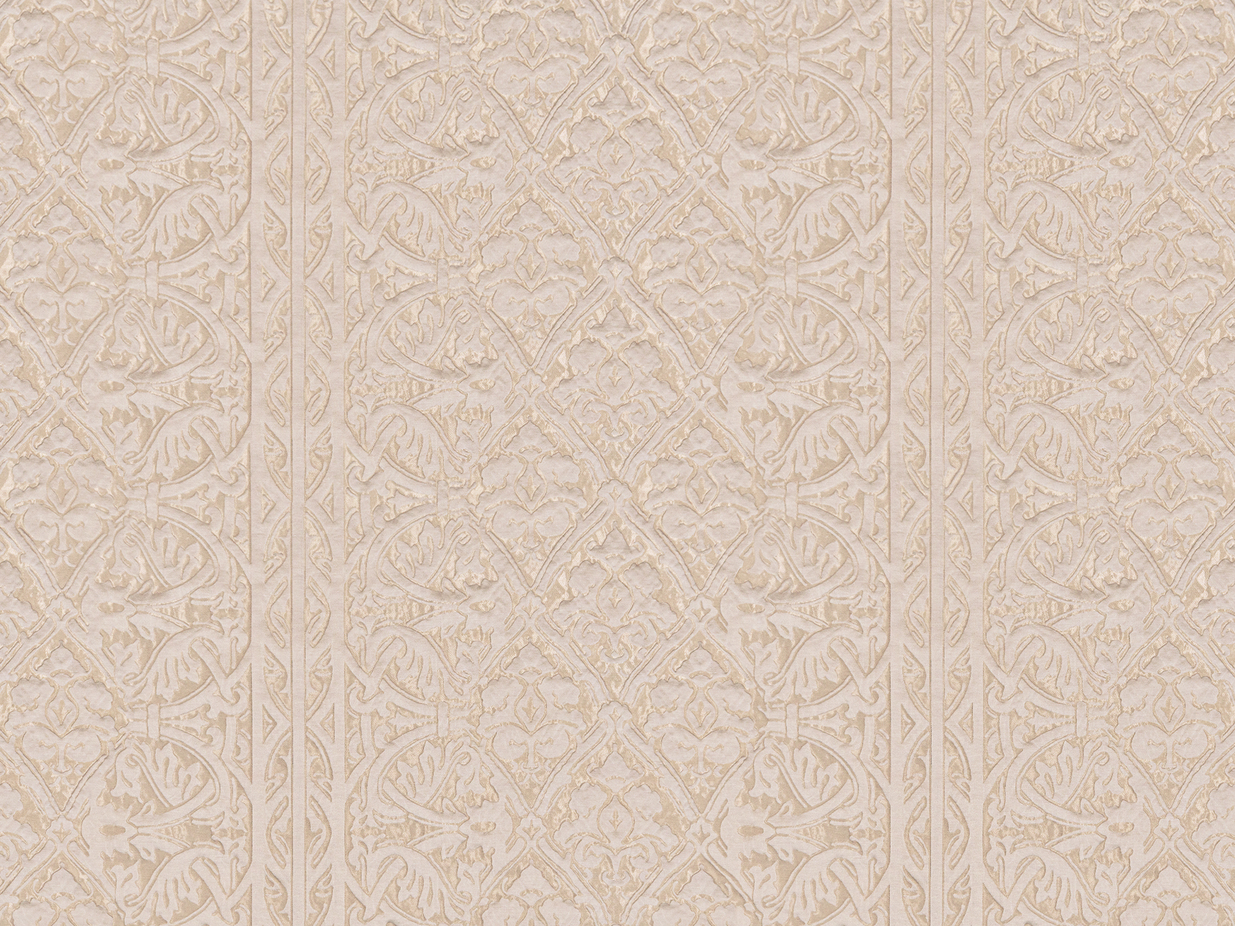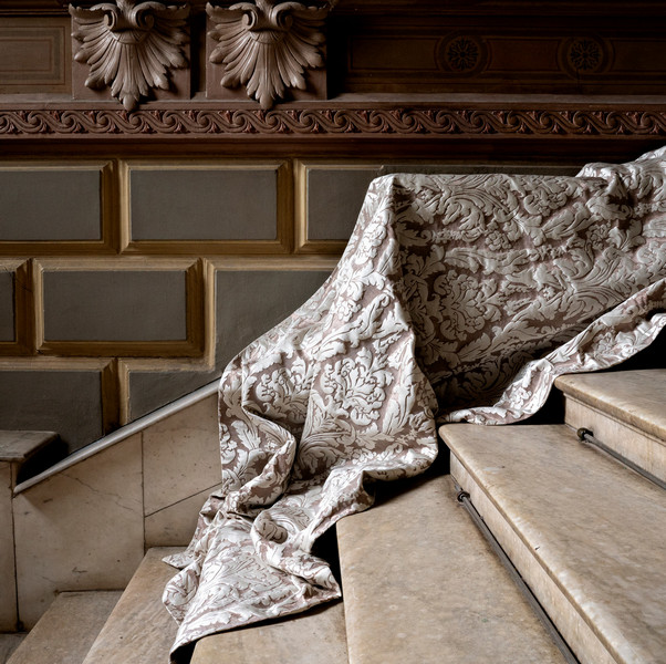 Получивший вторую жизнь сначала в Италии, а после и во Франции, этот вертикальный дамасский узор переносит нас в дома французской аристократии семнадцатого века. Крупнораппортные вензели в нем подчеркнуты трехмерным исполнением, и ткань уверенно заявляет о своем благородном происхождении.