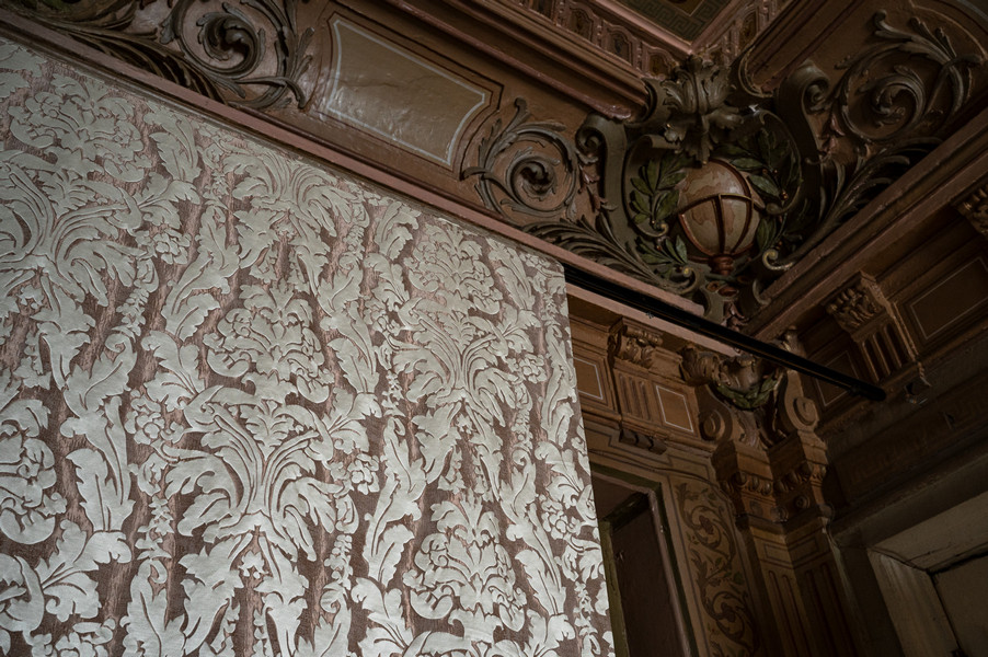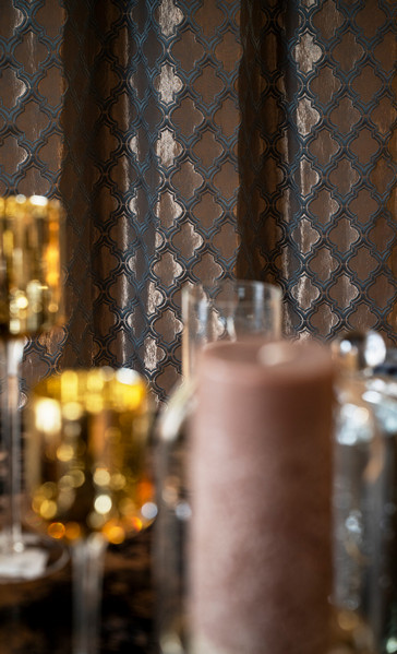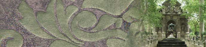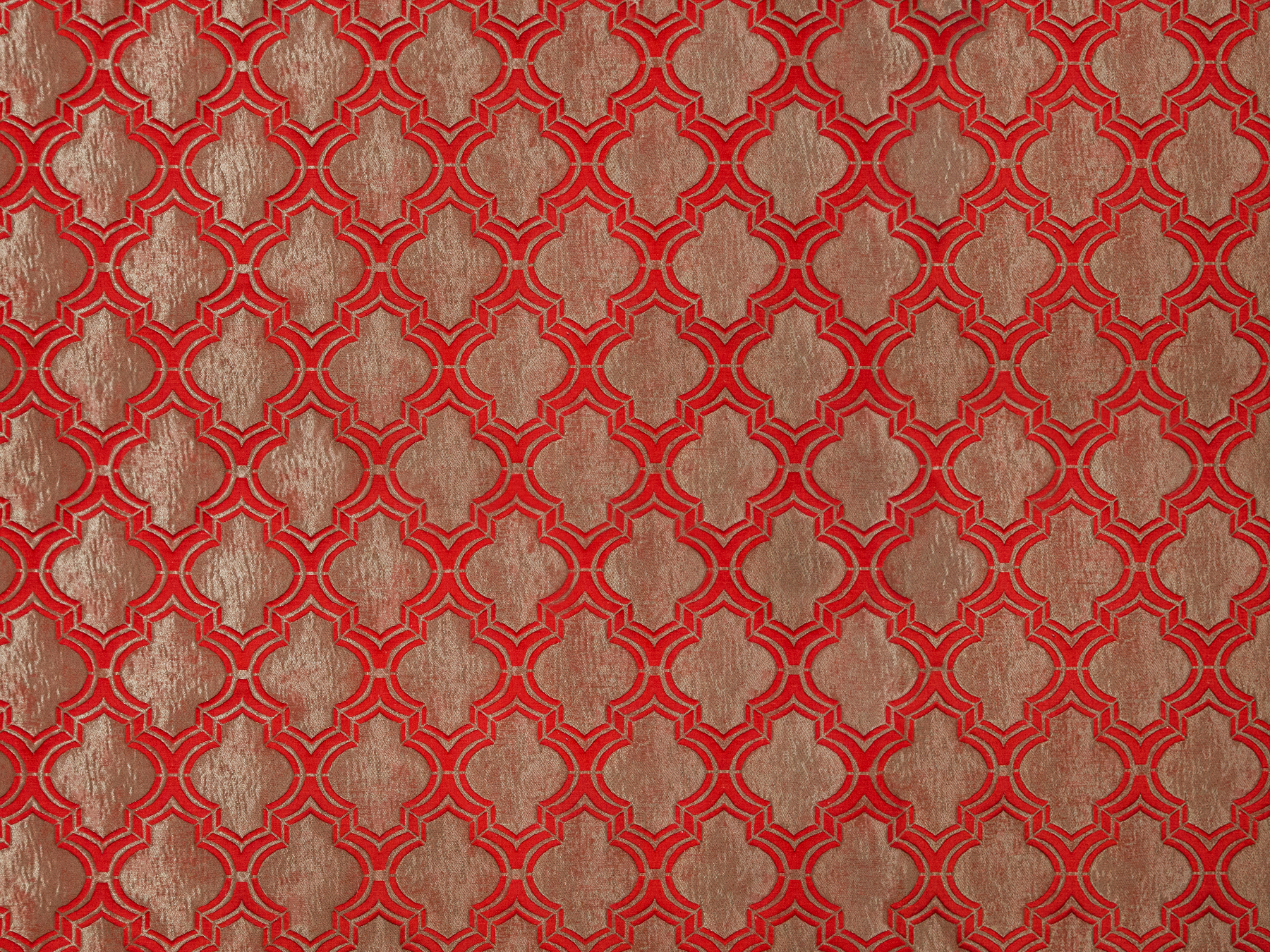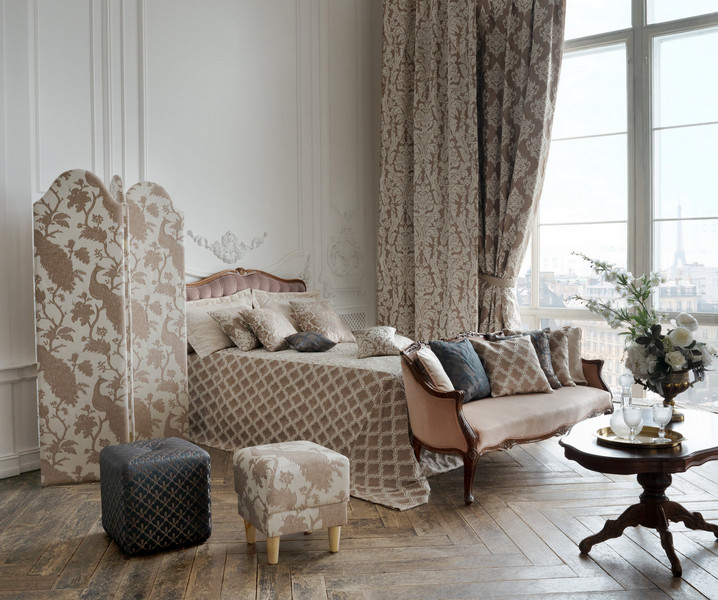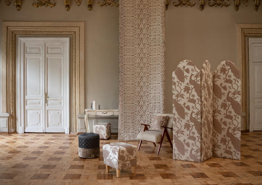 Настроение «Мулен руж», первого кабаре Парижа, родины канкана, излюбленного места развлечений импрессионистов, пронизывает второй дизайн каталога. Несмотря на классическую каноничность, орнамент игривый, элементы на ткани будто танцуют. При этом рисунок словно вогнут в ткань за счет выступающей основы, вытеснен, как на бумаге.