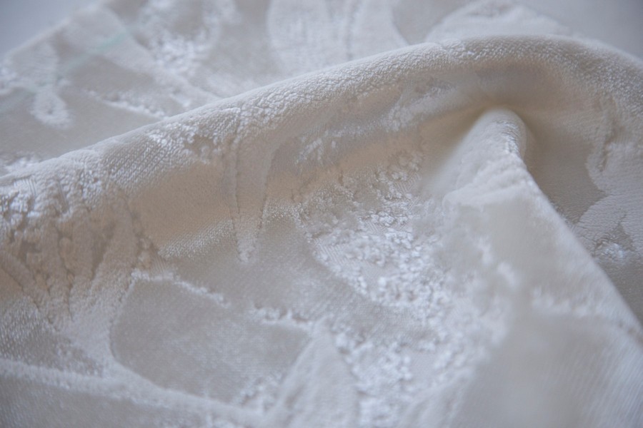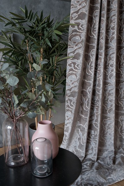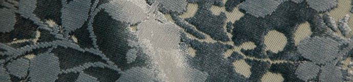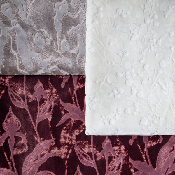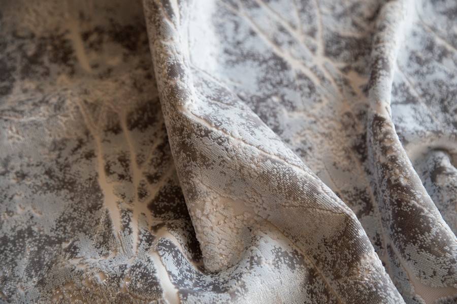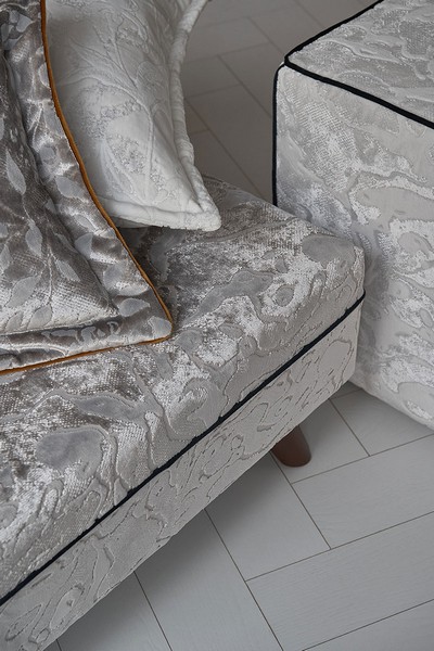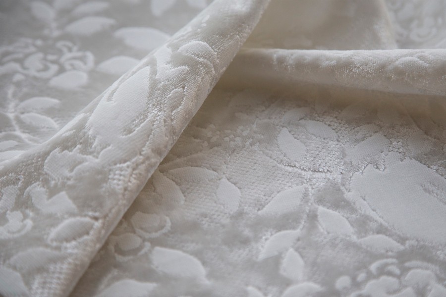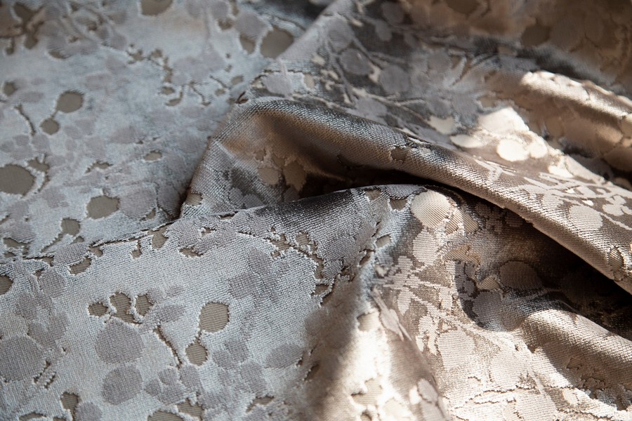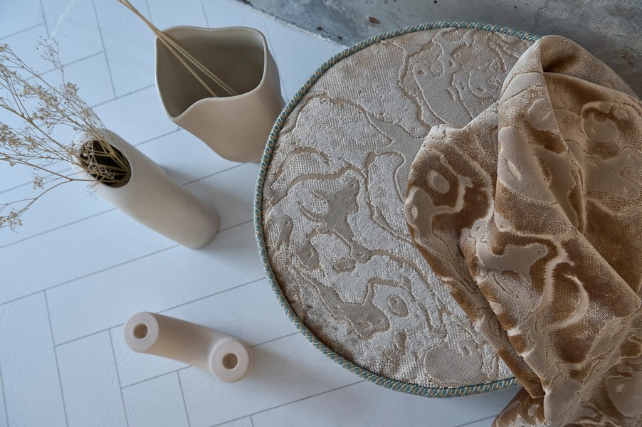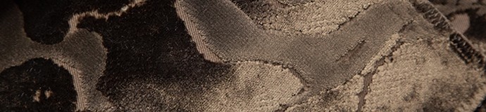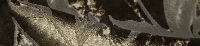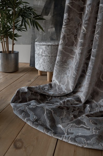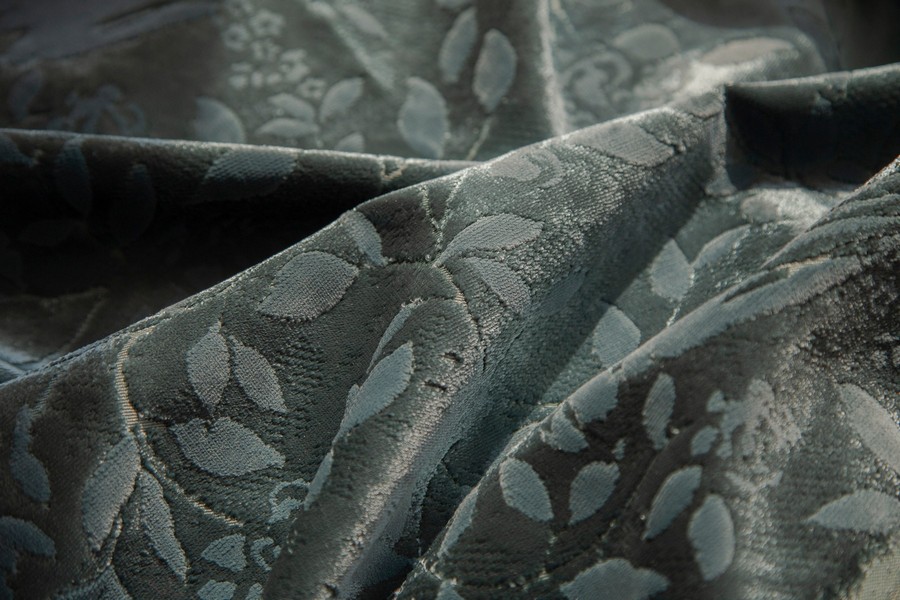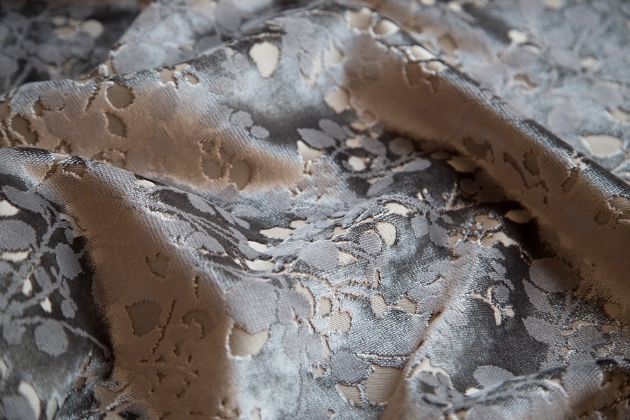 Основа бархата намеренно неоднородная, где-то ворс плотный, где-то он прорежен, где-то полностью отсутствует и видна основа. Разница, которую мы видим, завораживает: ткань выглядит намного более фактурной и объемной, к ней хочется прикоснуться. Под рукой при этом ощущаются две разные нити — одна мерцающая, вторая матовая. Их сочетание создает сдержанную, но очень самодостаточную одноцветную ткань.