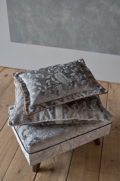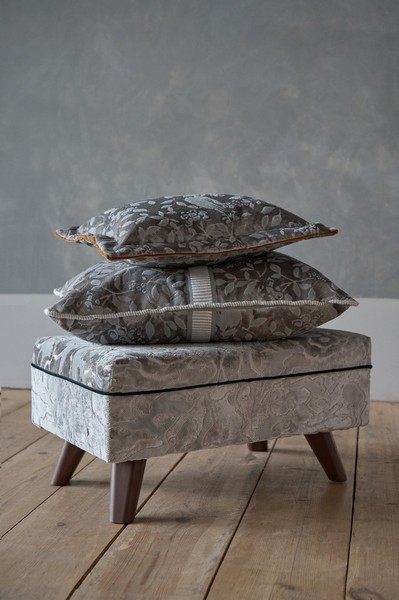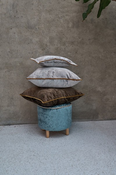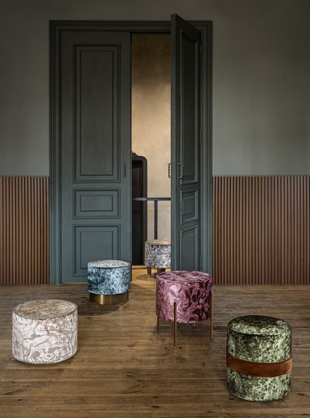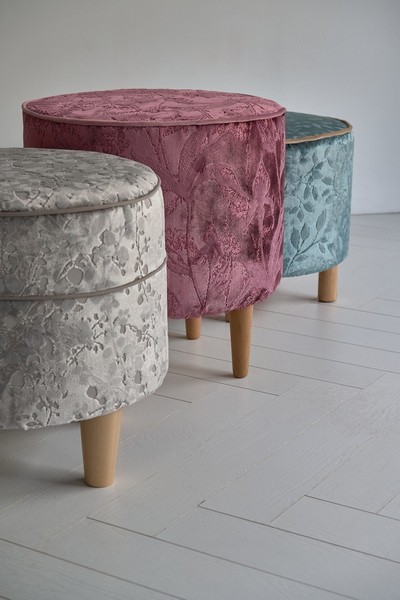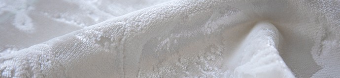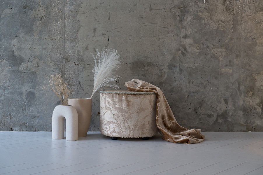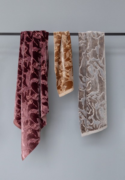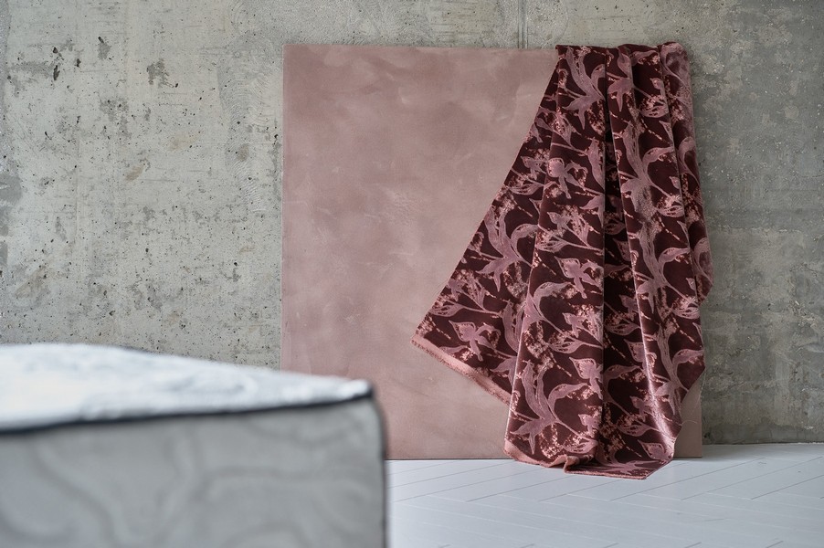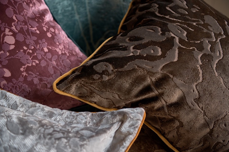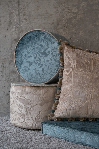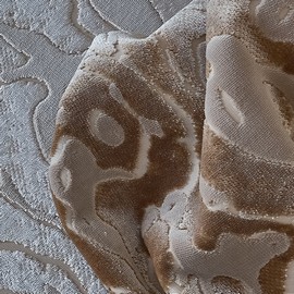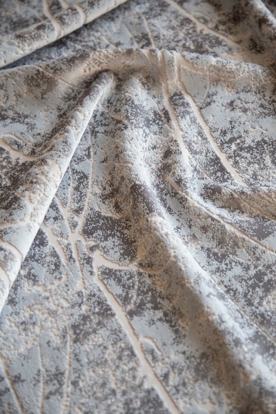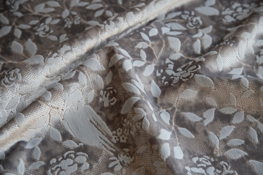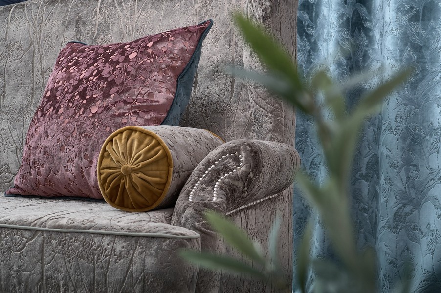 Основа бархата намеренно неоднородная, где-то ворс плотный, где-то он прорежен, где-то полностью отсутствует и видна основа. Разница, которую мы видим, завораживает: ткань выглядит намного более фактурной и объемной, к ней хочется прикоснуться. Под рукой при этом ощущаются две разные нити — одна мерцающая, вторая матовая. Их сочетание создает сдержанную, но очень самодостаточную одноцветную ткань.