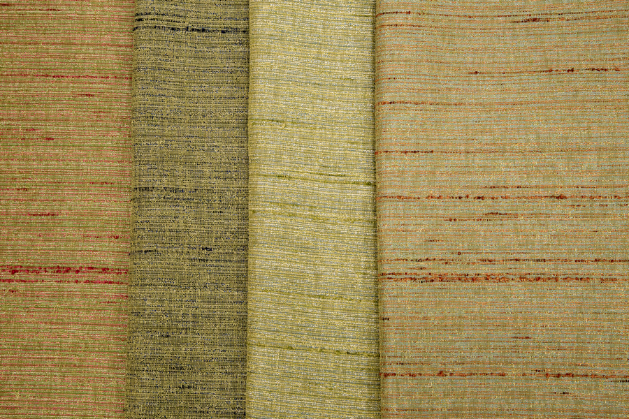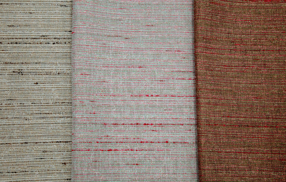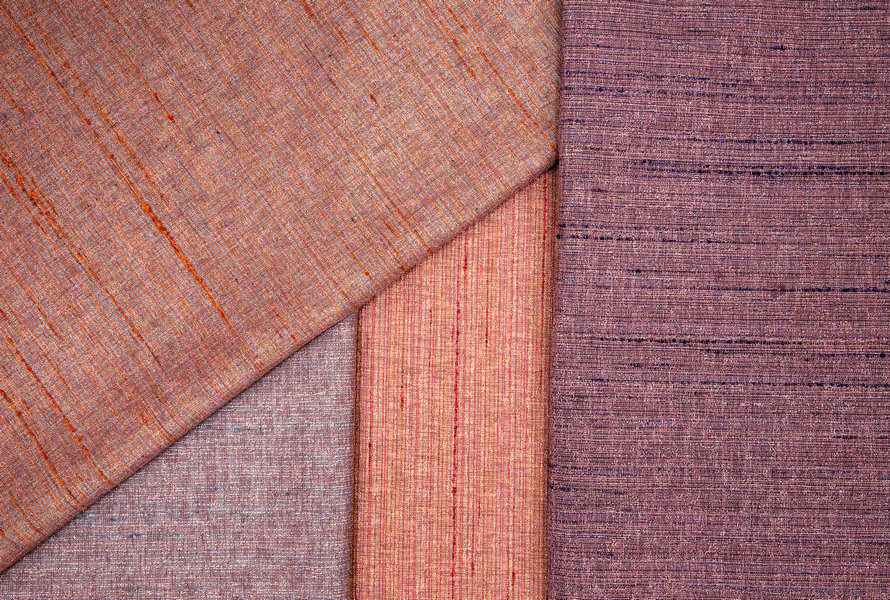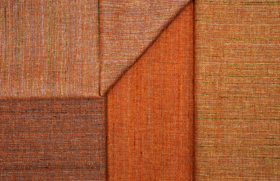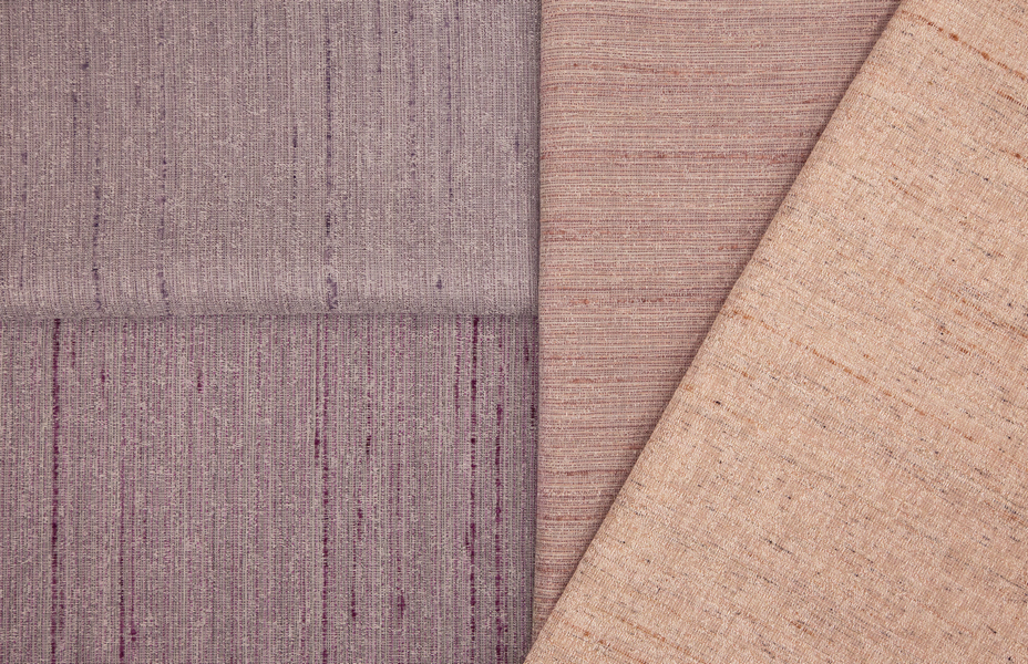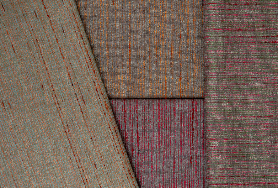 Обе ткани — достаточно мягкие, но в драпировке отличаются красивыми складками. Ткань, имитирующая дикий шелк, обладает фактурностью, неоднородной структурой, неровными узловатыми утолщенными нитями. Гладкий и ровный сатин с декоративными элементами, напротив, контрастирует с окрашенными разноволоконными нитями. Каждая ткань не только выглядит эффектно и приятна на ощупь, но и поддерживает общую концепцию каталога, которая воспевает жизнь в полную силу: насыщенную, наполненную красками и вкусами.