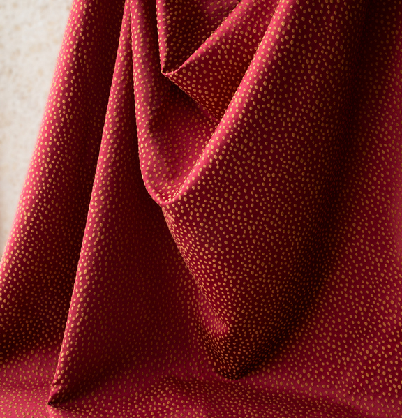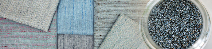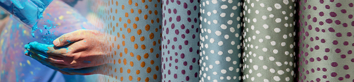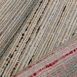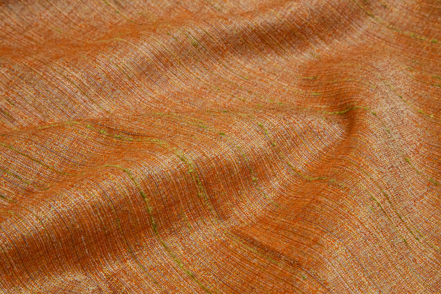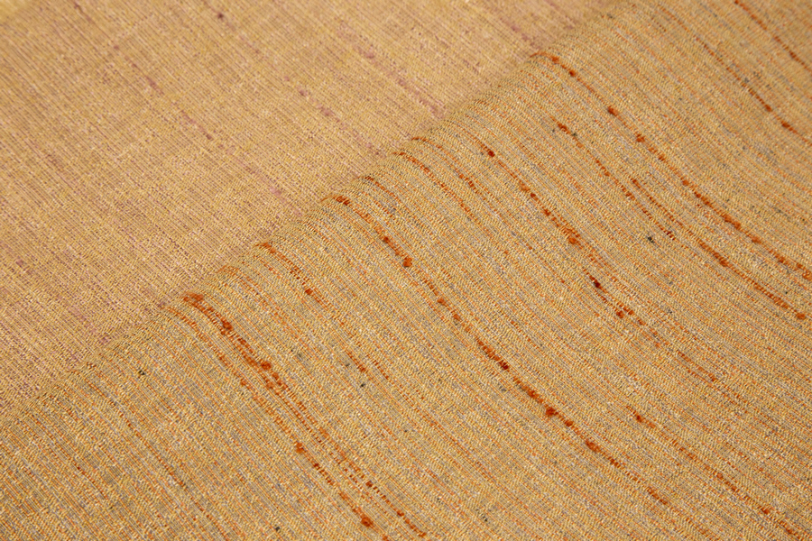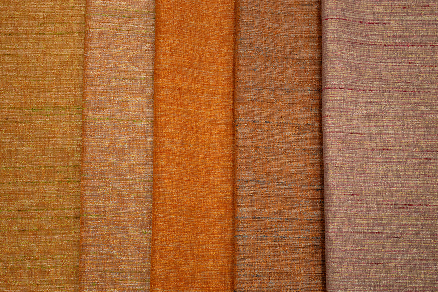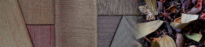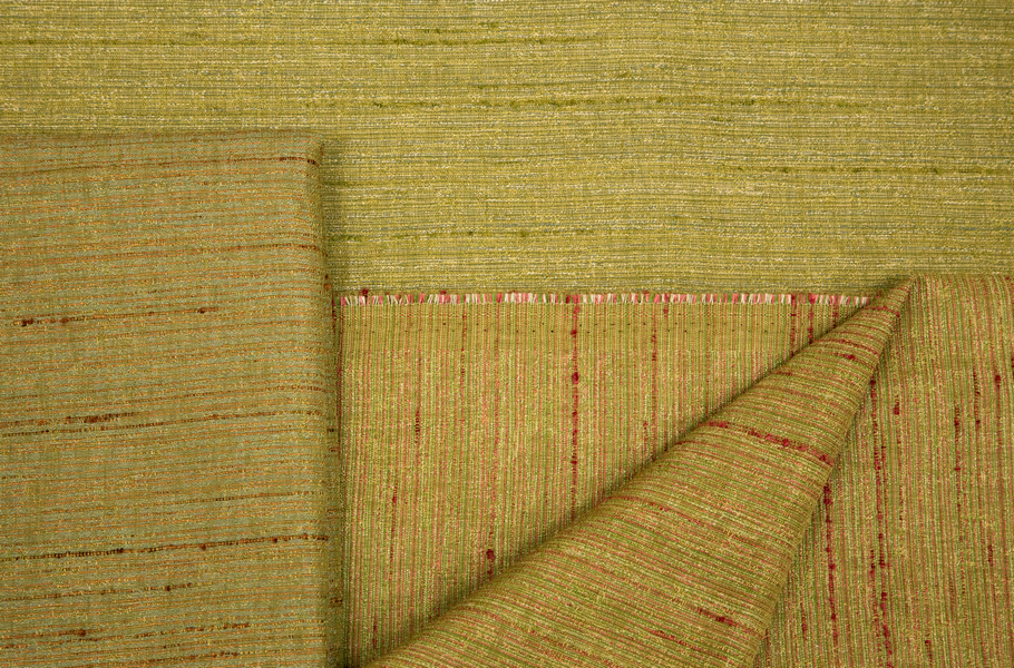 Обе ткани — достаточно мягкие, но в драпировке отличаются красивыми складками. Ткань, имитирующая дикий шелк, обладает фактурностью, неоднородной структурой, неровными узловатыми утолщенными нитями. Гладкий и ровный сатин с декоративными элементами, напротив, контрастирует с окрашенными разноволоконными нитями. Каждая ткань не только выглядит эффектно и приятна на ощупь, но и поддерживает общую концепцию каталога, которая воспевает жизнь в полную силу: насыщенную, наполненную красками и вкусами.