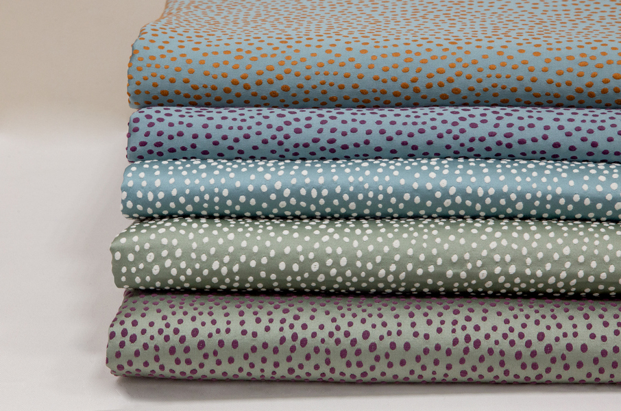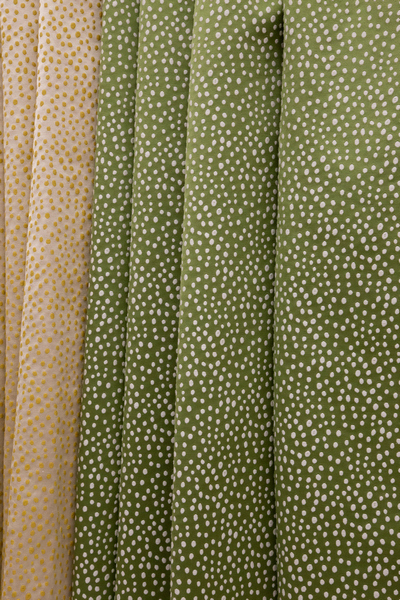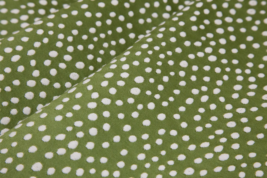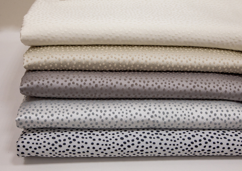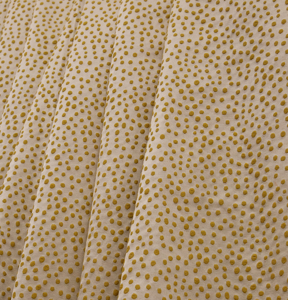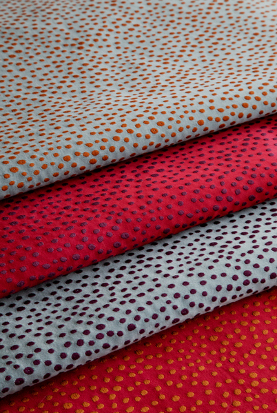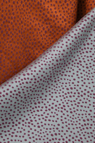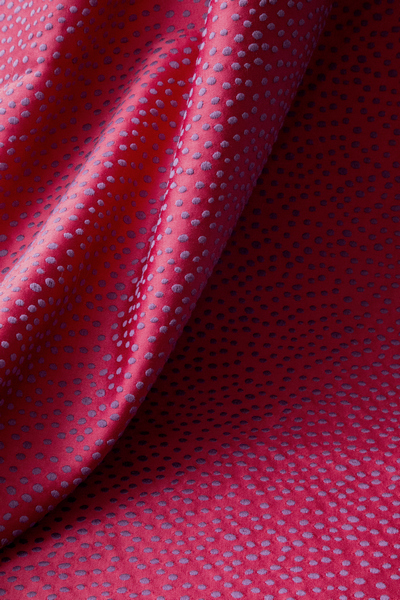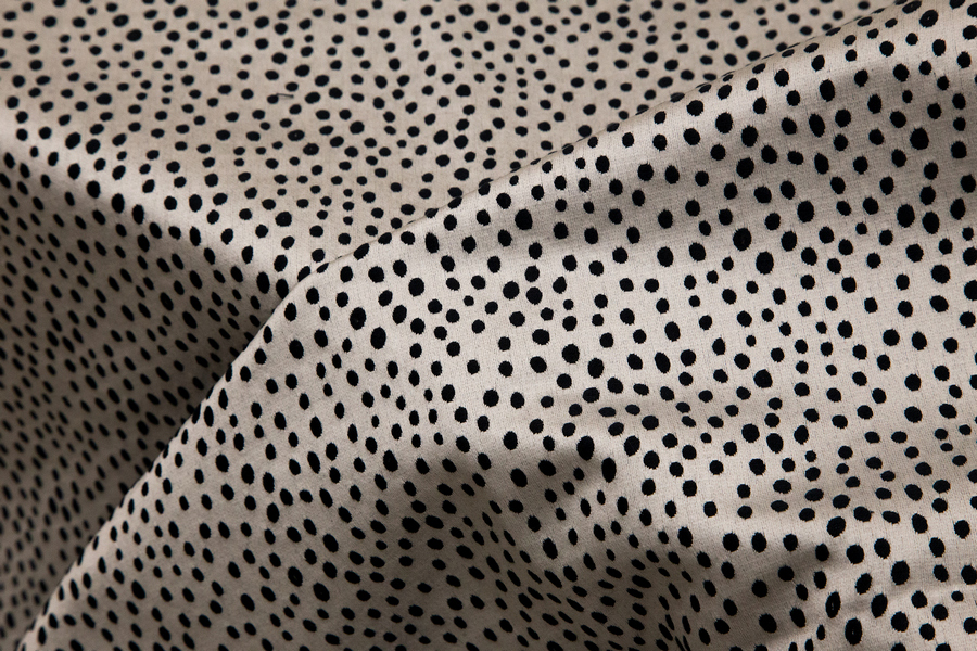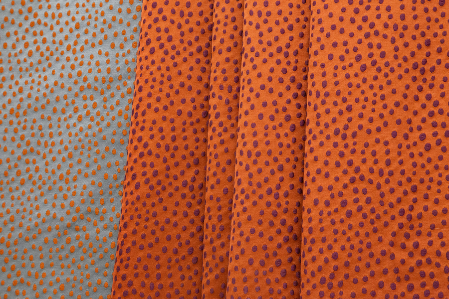 Особое удовольствие — разглядывать ткани вблизи, любуясь продуманными контрастами, как разбросанными по полотну зернышками, которые подчеркивают разницу фактур и смелую гармонию оттенков. Отсутствие контрастов в случае с похожими тонами придает тканям особый шарм: прямой свет визуально затемняет выпуклые вставки, а когда с основы уходит блик, то они становятся значительно ярче, проявляя свой цвет в полную силу.