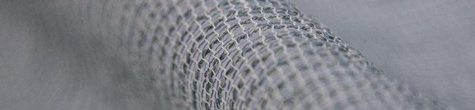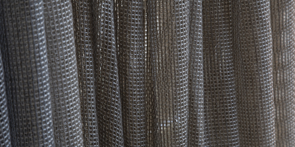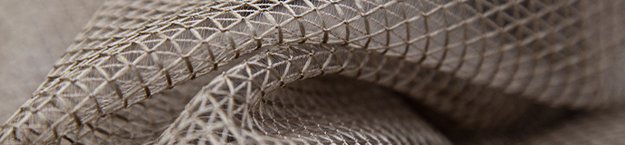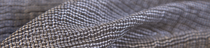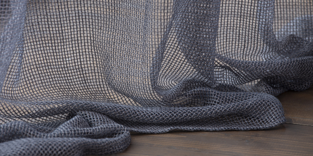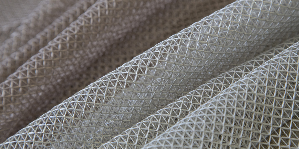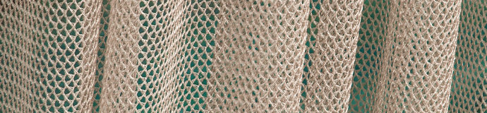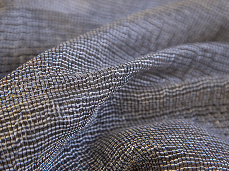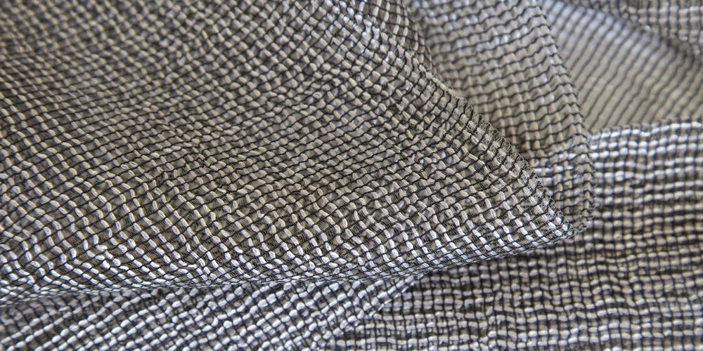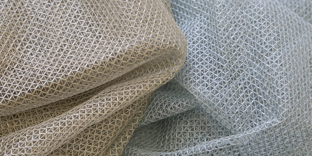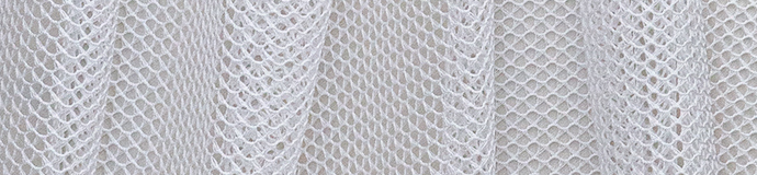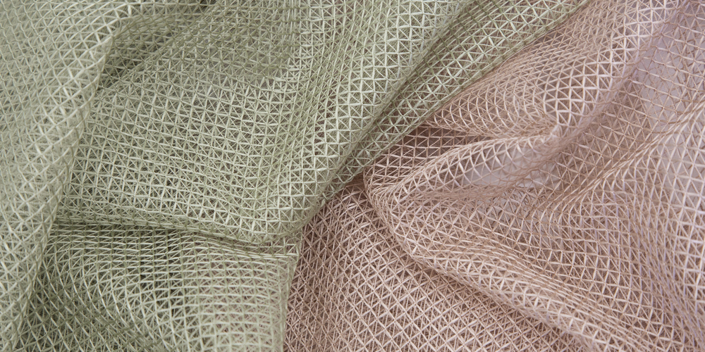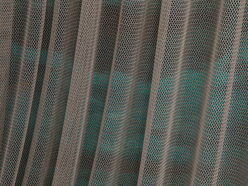 Настоящая тактильная игра раскрывается в сетке-букле с добавлением контрастной нити — голубой, серой, асфальтовой и трехцветной (комбинация желтого, зеленого и синего). Этот дизайн развивает философию экостиля и современных подуимных тканей из мира высокой моды.