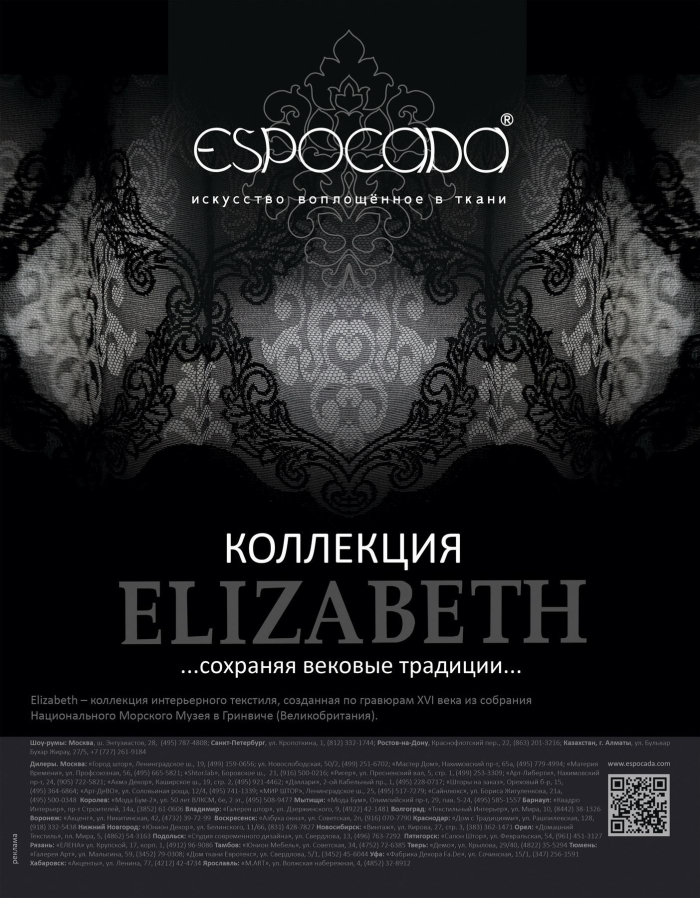 В июньском номере журнала «Elle Decoration» вышла полосная реклама кружева «Elizabeth» – новой коллекции Espocada.
