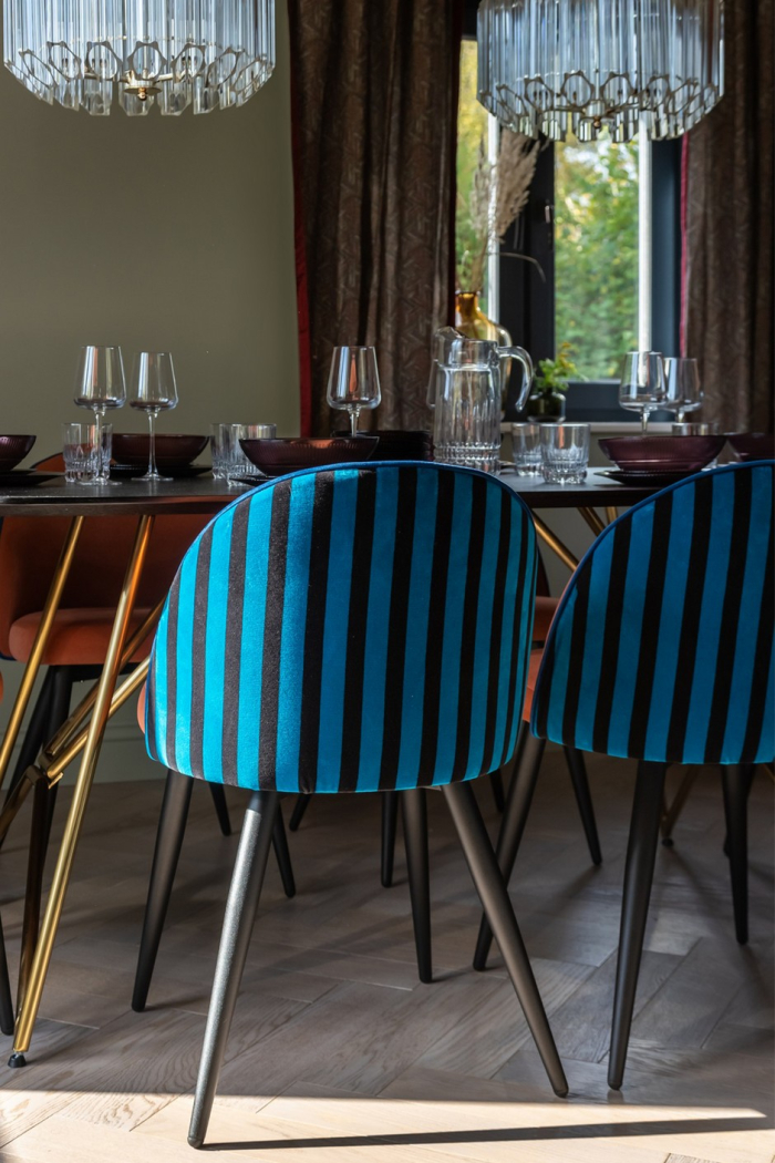 Дизайнер Ирина Райхер объединила кухню и гостиную в одно большое и эффектное пространство со множеством ярких деталей. Цветовое решение построено на сочетаниях из рисунка обоев, благодаря чему все цвета в интерьере выглядят гармонично.