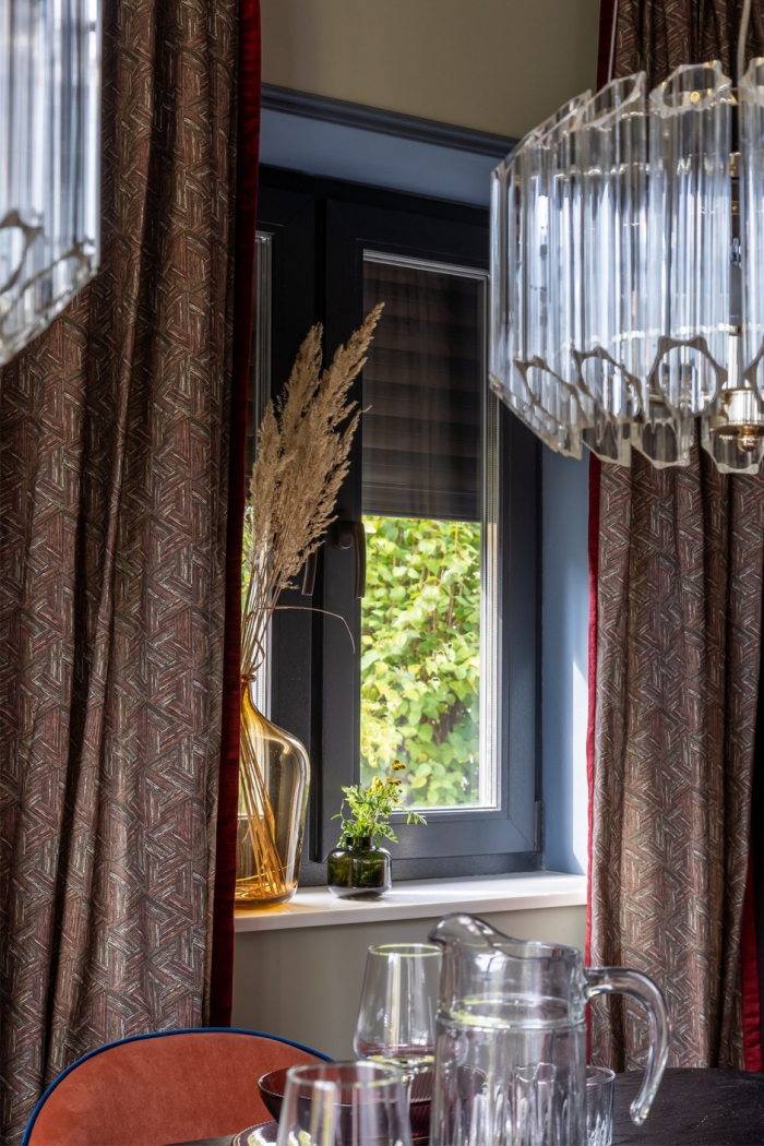 Ткани, названные в честь легендарного художника Эдгара Дега, были использованы для окантовки портьер. Они привнесли в интерьер особую ноту, придали портьерам выразительность и выгодно подчеркнули эстетику бархата.