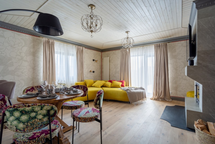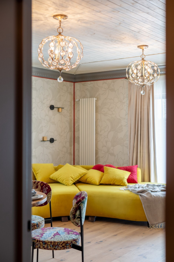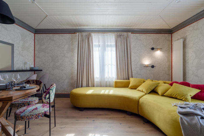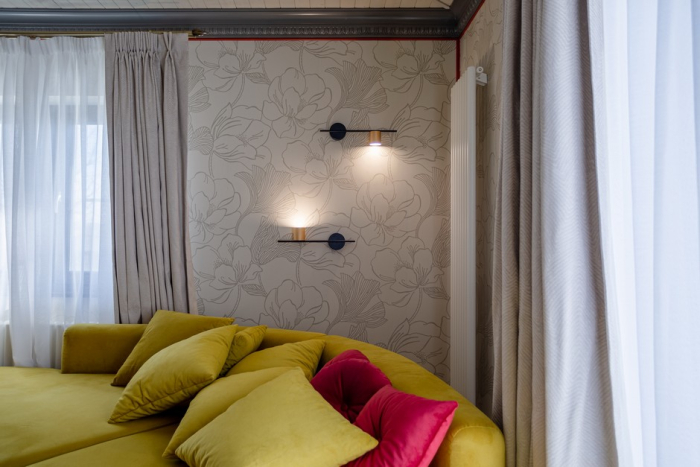 Дизайнер Ирина Райхер создала оригинальный интерьер гостиной героев, не побоявшись экспериментов и ярких акцентов. Однако для текстильного оформления были выбраны жаккардовые портьеры спокойного бежевого оттенка Evolution и белоснежный тюль-компаньон из того же каталога. Благодаря этому на карнизах появились эффектные двухслойные композиции, которые помогли уравновесить пространство и сделать его уютнее.