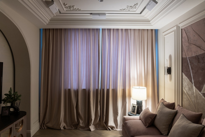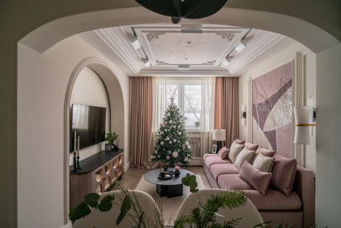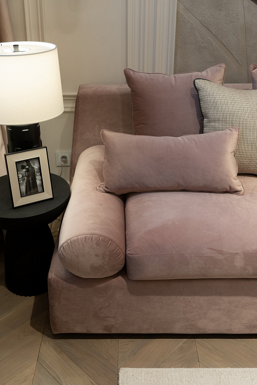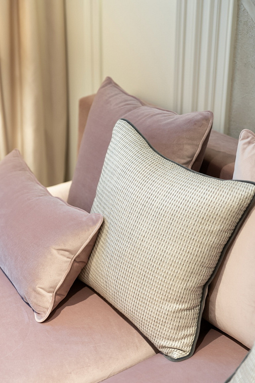 Для обивки дивана был выбран невероятно тактильный бархат Zephir с высокой износостойкостью 50 000 циклов по тесту Мартиндейла. Сложный пудровый оттенок задал основной тон настроению пространства.