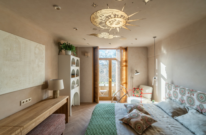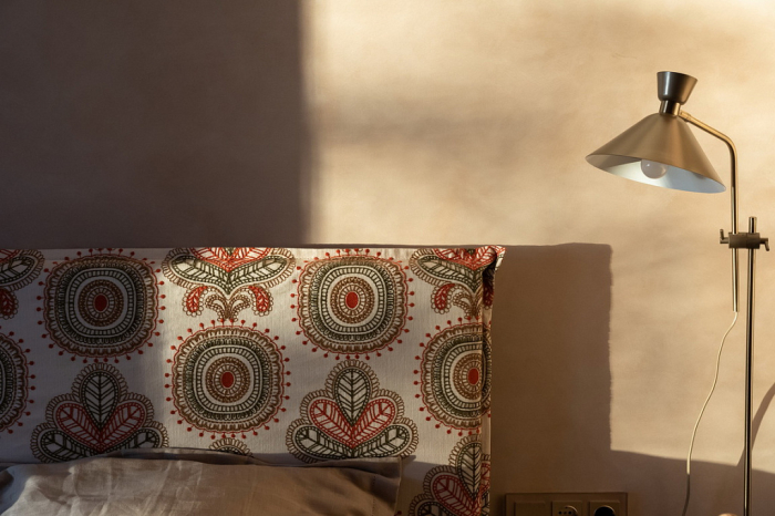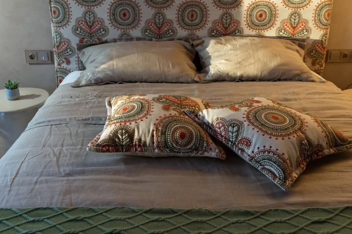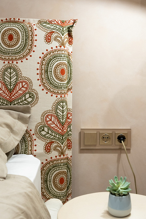 В новом выпуске «Квартирного вопроса» дизайнеры Чувелева Кира и Кузнецова Анна оформляли спальню для молодой пары. Каркас кровати было решено обтянуть имитирующим натуральную ткань износостойким молочным сатином из каталога Felice, который продолжает актуальную тему продуманных эко-интерьеров. Для изголовья кровати и декоративных подушек была выбрана ткань из авторской коллекции Cape Town от Venesto. Хлопковая вышивка на рогожке удачно подчеркнула этнические мотивы в интерьере.