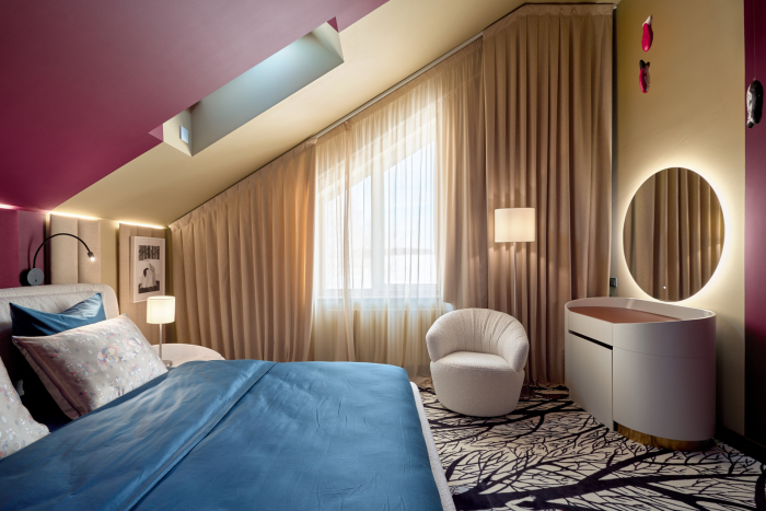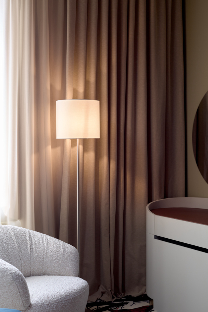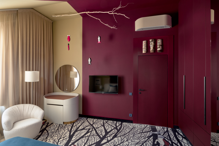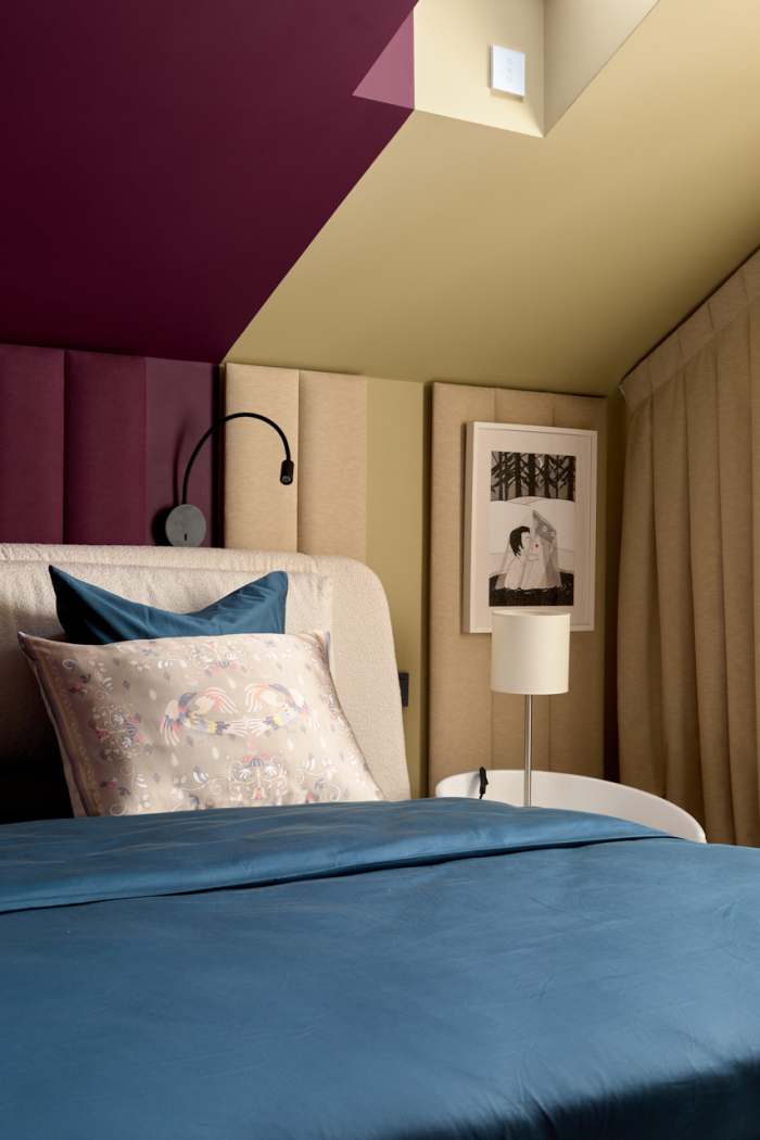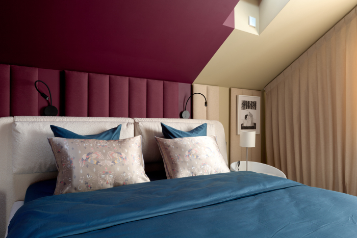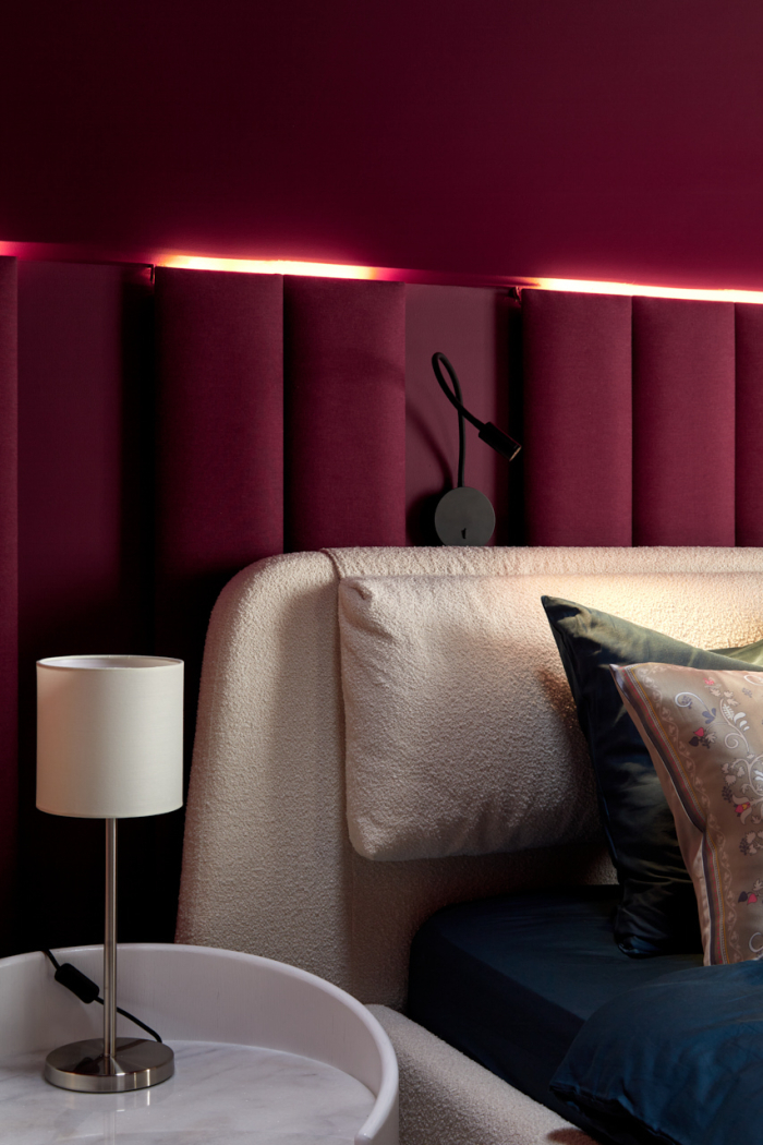 Основной акцент в новом интерьере сделан на глубокий пурпурный цвет — он был выбран для стен и мягких стеновых панелей, обитых тканью Etude (243) из коллекции Art Seasons от Venesto. Матовая, не гладкая ткань идеально подошла для спальни, а натуральная нить в составе придала дополнительный шарм за счет фактурности и легкого пушка от хлопка.