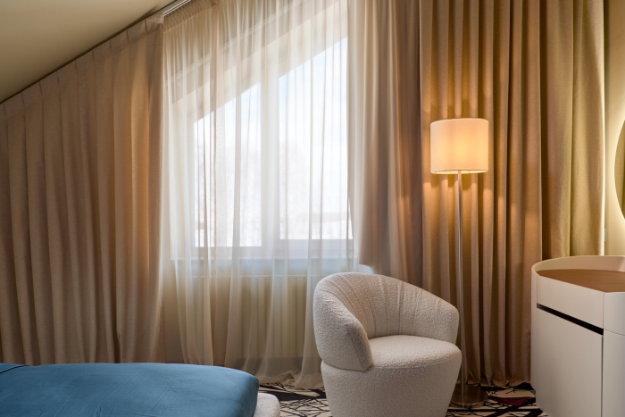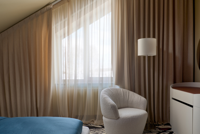 Окна украсили двусторонниедимаут-портьеры Comfort с мелким ромбом, дополненные все той же однотонной, но выразительной тканью из коллекции Art Seasons и легким, струящимся тюлем Ever.