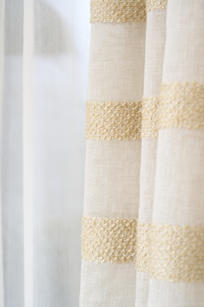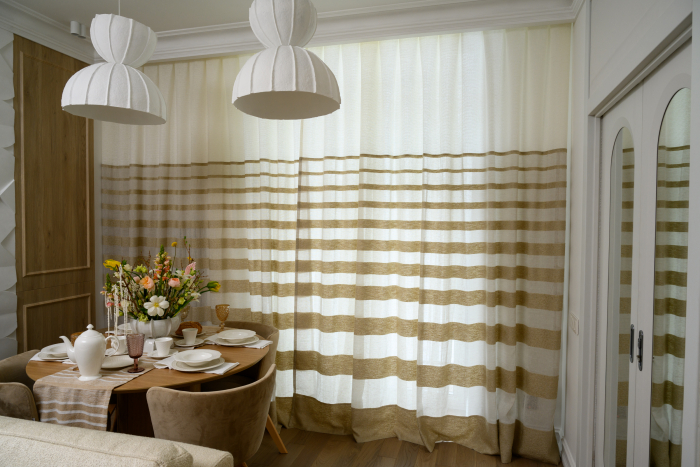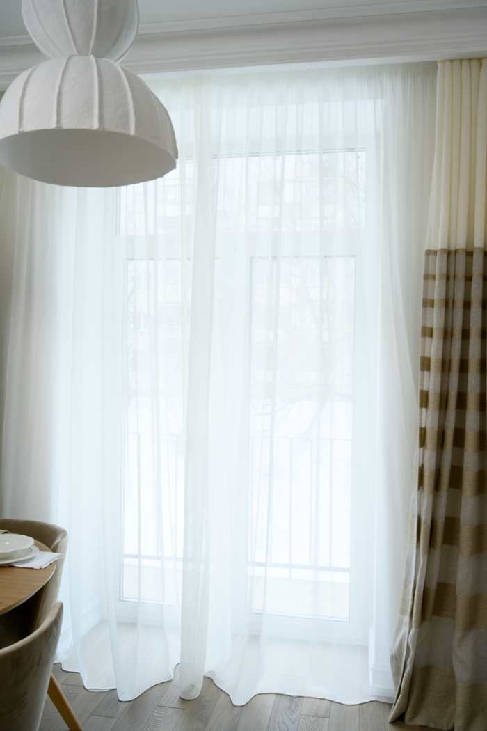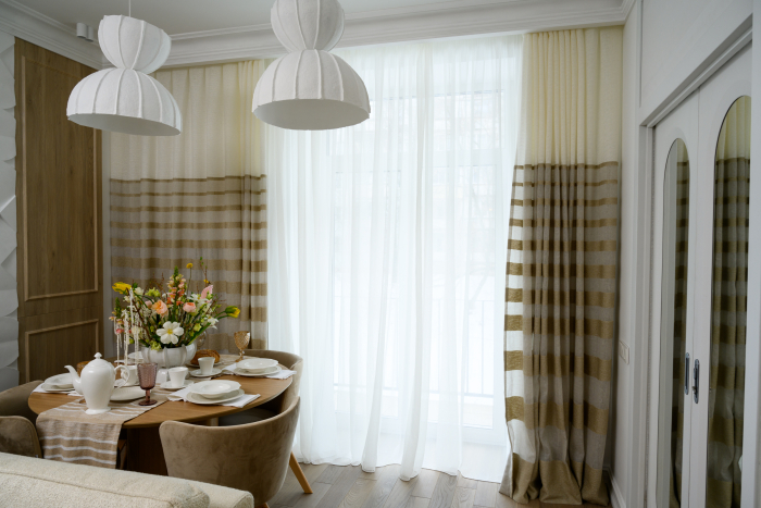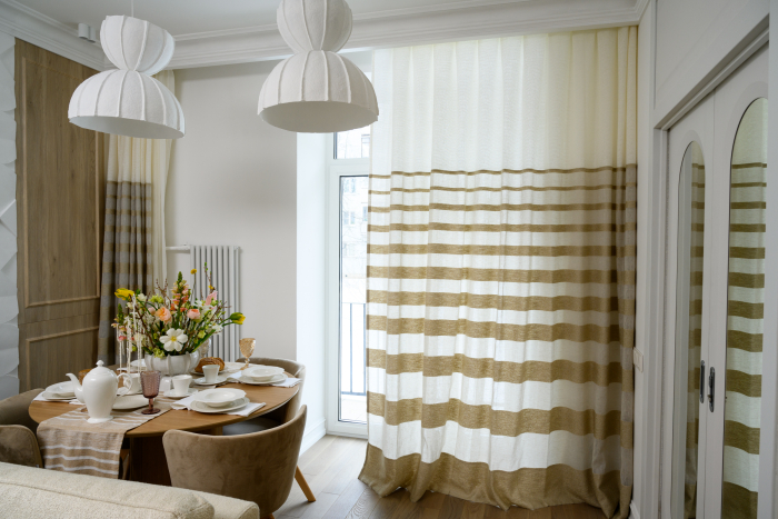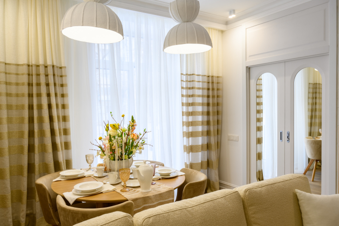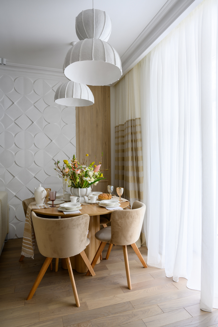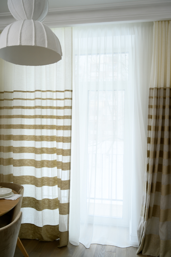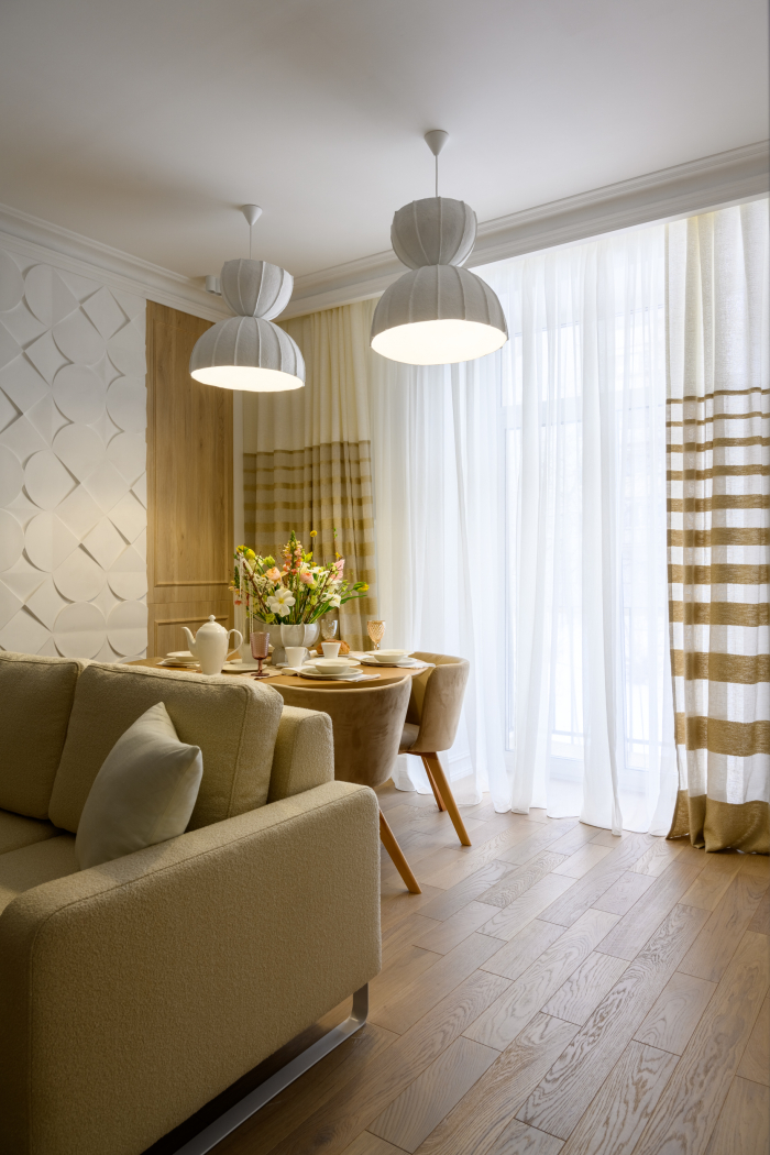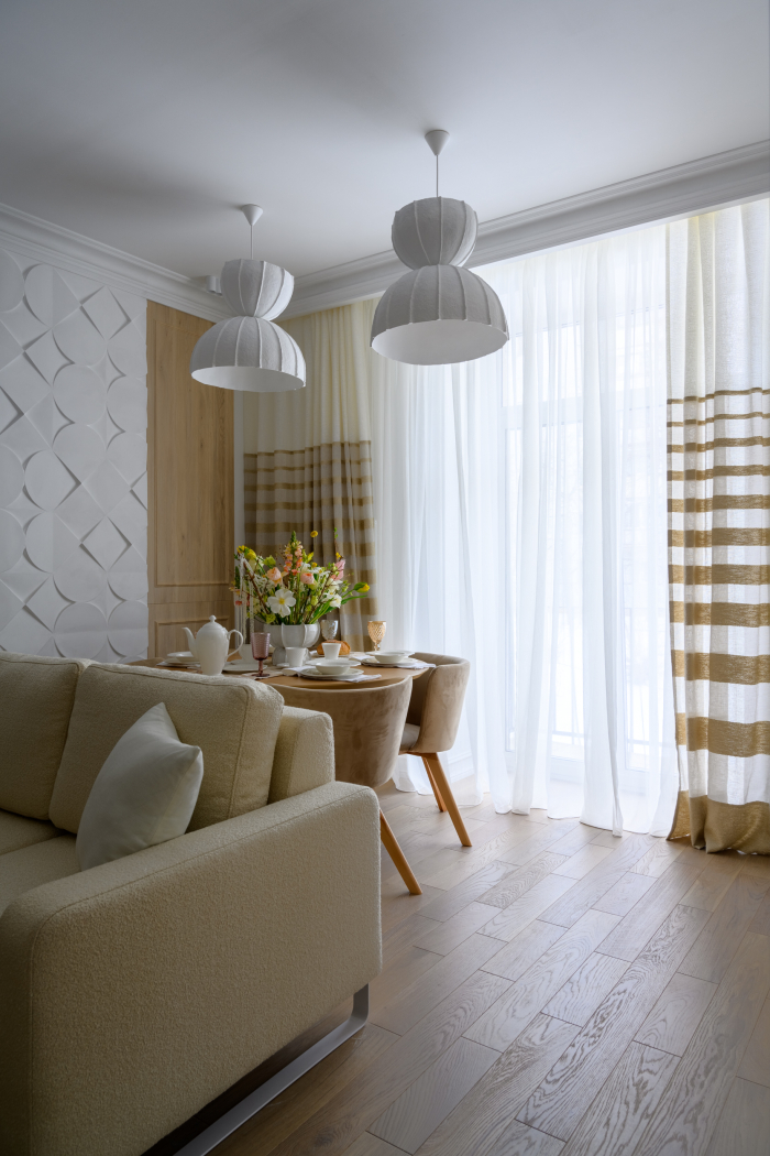 В новом проекте «Квартирного вопроса» дизайнер Лидия Чернова оформляла кухню-гостиную. Основной упор был сделан на функциональность и семейный уют пространства, палитру интерьера поддержал текстиль: для портьер была выбрана купонная ткань натурального льняного оттенка Dock (228/21) из коллекции Helsinki и фактурная ткань с декоративными нитями Snow (232/12) из того же каталога.