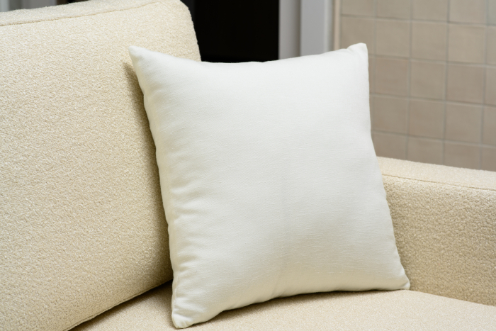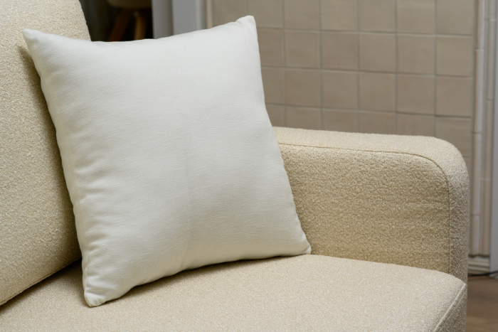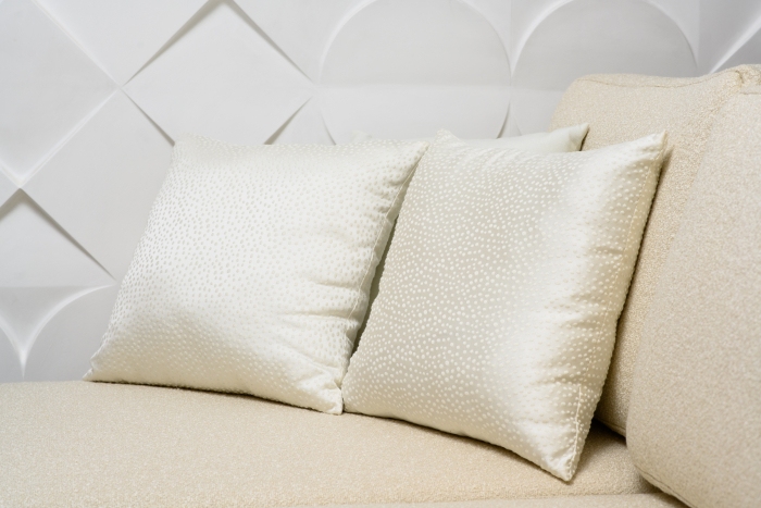 Подушки, украсившие диван, сделаны из белоснежного сатина с эффектом меланжа Felice (2635/10) и из ткани с ненавязчивым, но акцентным мелким горошком Silk Road (2805/11).
